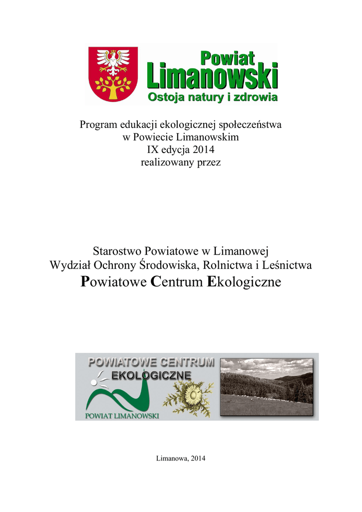 Program edukacji ekologicznej społeczeństwa w Powiecie Limanowskim IX edycja 2014 realizowany przez Starostwo Powiatowe w Limanowej Wydział Ochrony Środowiska, Rolnictwa i Leśnictwa Powiatowe Centrum Ekologiczne Limanowa, 2014 Zawartość I. WPROWADZENIE ........................................................................................................... 6 II. REALIZOWANE PROJEKTY W RAMACH PROGRAMU ........................................... 9 1. V powiatowy konkurs wiedzy o ochronie przyrody ..................................................... 10 2. Kontynuacja Programu promocji segregacji odpadów ................................................ 13 a) Segregacja odpadów .............................................................................................. 13 b) Zbieranie zużytych baterii...................................................................................... 16 c) Powiatowy Program Usuwania Azbestu ................................................................ 18 d) Zbieraj puszki......................................................................................................... 19 3. „Dzień Ziemi” - Zmieniaj nawyki - nie klimat! ............................................................ 20 4. „Święto drzewa” XII edycja .......................................................................................... 23 5. „Sprzątanie świata” ....................................................................................................... 25 6. Zakup toreb ekologicznych wielokrotnego użytku ....................................................... 27 III. SPOSÓB REALIZACJI ................................................................................................ 28 1. Strona internetowa i tablica informacyjna .................................................................... 28 2. Współpraca z wybranymi ekologicznymi organizacjami pozarządowymi ................... 29 3. Współpraca ze szkołami powiatu limanowskiego ........................................................ 32 4. Prelekcje z młodzieżą .................................................................................................... 32 5. Udostępnianie materiałów edukacyjnych...................................................................... 32 6. Organizowanie konkursów dla młodzieży i dzieci ....................................................... 33 7. Organizowanie warsztatów dla nauczycieli i konferencji dla pracowników samorządowych .................................................................................................................... 33 IV. V. VI. EFEKTY EKOLOGICZNE I SPOŁECZNE ................................................................ 34 EFEKTY MATERIALNE I SZKOLENIOWE ................................................................ 34 FINANSOWANIE ........................................................................................................ 35 2 WSTEP Ochrona środowiska przyrodniczego jak również bezpośredniego otoczenia człowieka w jego pracy, szkole domu jest nie tylko intuicyjnym zachowaniem ale również konstytucyjnym obowiązkiem każdego obywatela. Dzięki Powiatowemu Centrum Ekologicznemu wszyscy mieszkańcy powiatu, będą mogli go pełniej realizować. W obecnym czasie gdzie istnieje szczególna potrzeba edukacji i dostępu do informacji o możliwościach jakie niosą ze sobą nowoczesne metody segregacji oraz ochrony środowiska Powiat podejmuje próbę edukacji społeczeństwa, a przede wszystkim młodzieży i dzieci kierując się zasadą „czym skorupka za młodu nasiąknie, tym starość trąci”. Zamierzeniem tego Programu jest długofalowe oddziaływanie na społeczeństwo, a szczególnie młodzież w szkołach. Mamy nadzieję, że wyniesiona nauka z Programu zostanie przeniesiona do swoich gospodarstw domowych i prywatnego życia, a szczególnie: Nauczanie podstaw ekologicznie zrównoważonego użytkowania środowiska i sposobów jego ochrony Kształtowanie nawyków kultury ekologicznej oraz poczucia moralnej i obywatelskiej odpowiedzialności za ochronę dóbr środowiska naturalnego i przyrodniczego Wpajanie postaw związanych z segregacją odpadów, czystością wód, ochroną przyrody, szacunkiem do zwierząt. Edukacja ekologiczna prowadzona jest poprzez artykuły w prasie lokalnej, prelekcje w szkołach, konferencje, szkolenia i warsztaty dla jednostek samorządowych nauczycieli i młodzieży, konkursy, wydawnictwa w postaci ulotek, stronę internetową. Będą prowadzone akcje związane tematycznie z ochroną środowiska we współpracy z ekologicznymi organizacjami pozarządowymi, limanowskim i mszańskim oddziałem Polskiego Związku Wędkarskiego, Nadleśnictwem Limanowa, Stary Sącz oraz Gorczańskim Parkiem Narodowym. Z zakresu Ustawy o Ochronie Przyrody (t.j.Dz.U.2013.627) Art. 4. 1. Obowiązkiem organów administracji publicznej, osób prawnych i innych jednostek organizacyjnych oraz osób fizycznych jest dbałość o przyrodę będącą dziedzictwem i bogactwem narodowym. 2. Organy administracji publicznej są obowiązane do zapewnienia warunków prawnych, organizacyjnych i finansowych dla ochrony przyrody. 3. Obowiązkiem organów administracji publicznej, instytucji naukowych i oświatowych, a także publicznych środków masowego przekazu jest prowadzenie działalności edukacyjnej, informacyjnej i promocyjnej w dziedzinie ochrony przyrody. Z zakresu Program Ochrony Środowiska Powiatu Limanowskiego, a szczególnie: Cele edukacyjno-wychowawcze: promowanie zachowań związanych z codziennym bytowaniem mieszkańców a zgodnym z zasadami ochrony krajobrazu i przyrody, wykorzystanie proekologicznych nośników energii i szkodliwości spalania materiałów odpadowych (szczególnie tworzyw sztucznych), 3 rygorystyczne przestrzeganie wymagań ochrony środowiska w ramach funkcjonowania obiektów turystycznych i rekreacyjnych, budownictwa mieszkaniowego oraz prowa