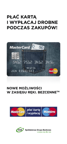 PŁAĆ KARTĄ I WYPŁACAJ DROBNE PODCZAS ZAKUPÓW! NOWE MOŻLIWOŚCI W ZASIĘGU RĘKI. BEZCENNETM Kolejny krok do pełnej wygody! Płacąc kartą MasterCard® lub Maestro® za zakupy, możesz wypłacać do 300 zł w gotówce dzięki usłudze „Płać kartą i wypłacaj”. Wypłacaj drobne podczas codziennych zakupów, na przykład w supermarkecie, na stacji benzynowej czy w sieci sklepów osiedlowych. Płacąc kartą, poinformuj sprzedawcę, że chcesz równocześnie wypłacać pieniądze – niezależnie od kwoty zakupów. Zawsze jest to jedna transakcja potwierdzona kodem PIN, a na jej wysokość składają się wartość zakupu oraz kwota wypłaty. Usługa obejmuje karty debetowe oraz niektóre kredytowe, a jej koszty ustala bank, który wydał kartę. Łatwo, bezpiecznie i po drodze! Jak to działa? Widzisz naklejkę „Płać kartą i wypłacaj”. Wchodzisz do środka i płacisz za zakupy kartą MasterCard® lub Maestro®. Przy okazji możesz podjąć gotówkę. Każda transakcja dla bezpieczeństwa potwierdzona jest kodem PIN. Kwota wypłaty zostanie dodana do wartości zakupów, a pieniądze otrzymasz od ręki. Gdzie mogę skorzystać? www.mastercard.pl Listę punktów Orlen oraz Bliska, w których dostępna jest usługa „Płać kartą i wypłacaj”, znajdziesz na: www.mastercard.pl/lista Opłata za usługę „Płać kartą i wypłacaj” zgodnie z taryfą opłat i prowizji danego banku.