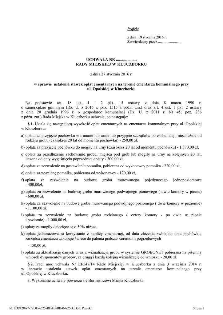 Projekt z dnia 19 stycznia 2016 r. Zatwierdzony przez ......................... UCHWAŁA NR .................... RADY MIEJSKIEJ W KLUCZBORKU z dnia 27 stycznia 2016 r. w sprawie ustalenia stawek opłat cmentarnych na terenie cmentarza komunalnego przy ul. Opolskiej w Kluczborku Na podstawie art. 18 ust. 1 i 2 pkt. 15 ustawy z dnia 8 marca 1990 r. o samorządzie gminnym (Dz. U. z 2015 r. poz. 1515 z późn. zm.) oraz art. 4 ust. 1 pkt. 2 ustawy z dnia 20 grudnia 1996 r. o gospodarce komunalnej (Dz. U. z 2011 r. Nr 45, poz. 236 z późn. zm.) Rada Miejska w Kluczborku uchwala, co następuje: § 1. Ustala się następującą wysokość opłat cmentarnych na cmentarzu komunalnym przy ul. Opolskiej w Kluczborku: a) opłata za przyjęcie pochówku w trumnie lub urnie lub przyjęcie szczątków po ekshumacji, niezależnie od rodzaju grobu (czasokres 20 lat od momentu pochówku) - 250,00 zł, b) opłata za przyjęcie pochówku do mogiły na urny (czasokres 20 lat od momentu pochówku) - 1.870,00 zł, c) opłata za przedłużenie zachowanie grobu, miejsca pod grób lub mogiły na urny na kolejnych 20 lat, liczona od daty wygaśnięcia poprzedniej opłaty - 300,00 zł, d) opłata za zezwolenie na postawienie pomnika, pobierana od wykonawcy pomnika - 220,00 zł, e) opłata za wymianę pomnika, pobierana od wykonawcy - 120,00 zł, f) opłata za - 400,00zł, zezwolenie na budowę grobu murowanego pojedynczego jednopoziomowe g) opłata za zezwolenie na budowę grobu murowanego podwójnego pionowego ( dwie komory w pionie) - 600,00 zł, h) opłata za zezwolenie na budowę grobu murowanego podwójnego poziomego ( dwie komory w poziomie) - 1.100,00 zł, i) opłata za zezwolenie na budowę grobu rodzinnego ( cztery komory - po dwie w pionie i poziomie) - 1.000,00 zł, j) opłaty za mogiły dziecięce są o 50% niższe, k) opłata jednorazowa za korzystanie z kaplicy cmentarnej, od dnia złożenia zwłok do dnia pochówku, zarządca cmentarza zakupuje świece do palenia podczas ceremonii pogrzebowych - 150,00 zł, l) opłata za aktualizację danych wraz z wizualizacją grobu w systemie GROBONET pobierana na pisemny wniosek dysponentów grobów, za drugą i każdą kolejną wizualizację od wniosku - 20,00 zł. § 2. Traci moc uchwała Nr LI/547/14 Rady Miejskiej w Kluczborku z dnia 3 września 2014 r. w sprawie ustalenia stawek opłat cmentarnych na terenie cmentarza komunalnego przy ul. Opolskiej w Kluczborku. 3. Wykonanie uchwały powierza się Burmistrzowi Miasta Kluczborka. Id: 9D9428A7-79DE-4525-BFAB-BB46A266CD36. Projekt Strona 1 § 4. Uchwała wchodzi w życie po upływie 14 dni od dnia ogłoszenia w Dzienniku Urzędowym Województwa Opolskiego. Przewodniczący Rady Miejskiej w Kluczborku Janusz Kędzia Id: 9D9428A7-79DE-4525-BFAB-BB46A266CD36. Projekt Strona 2 UZASADNIENIE do uchwały Rady Miejskiej w Kluczborku w sprawie ustalenia stawek opłat cmentarnych na terenie cmentarza komunalnego przy ul. Opolskiej w Kluczborku. W związku z wnioskiem zarządcy cmentarza komunalnego i katolickiego w Kluczborku tj. Miejskiego Zarządu Obiektów Komunalnych w Kluczborku została zaproponowana zmiana stawek opłat cmentarnych oraz wprowadzenie nowych opłat, których dotychczas w cenniku nie było. Nowo wprowadzanie stawki opłat cmentarnych pozwolą na maksymalne wykorzystywanie miejsc grzebalnych na cmentarzu komunalnym i katolickim. Zmiana stawek opłat cmentarnych jest konieczna również ze względu na rosnące koszty utrzymania cmentarza komunalnego i katolickiego związane m.in. z koniecznością wycinki drzew, usuwaniem jemioły oraz utrzymaniem bieżącym rowu wzdłuż cmentarza, do którego odprowadzane są wody drenażowe. W bieżącym roku została uporządkowana sprawa ziemi pochodzącej z wykopywania grobów – wykonano dwa miejsca do składowania ziemi i odpowiednio je oznakowano. Zarządca cmentarza musi również ponosić koszty utrzymania nowo wybudowanego cmentarza komunalnego o powierzchni 33.471,78m 2. Nowe stawki opłat cmentarnych pozwolą na prawidłowe zarządzanie cmentarzem, a przede wszystkim mają na celu zapobieganie samowoli wykonawców pomników oraz firm pogrzebowych. Związane to jest z koniecznością, w chwili obecnej, sprzątania po wykonawcach usług pogrzebowych i kamieniarskich. Id: 9D9428A7-79DE-4525-BFAB-BB46A266CD36. Projekt Strona 1