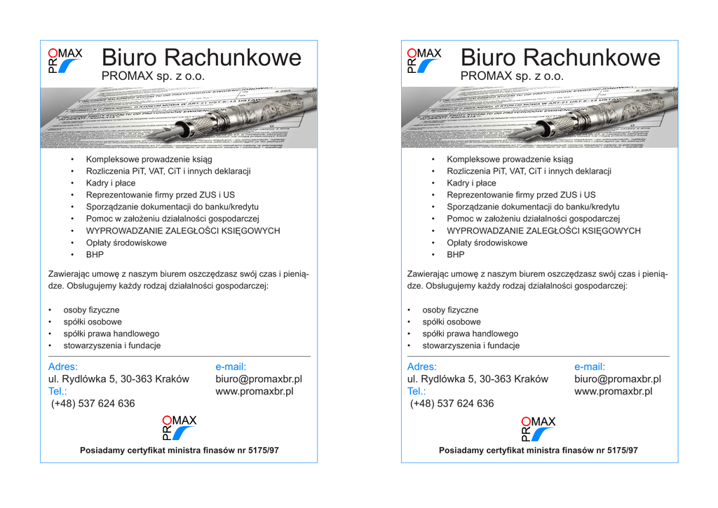 Biuro Rachunkowe Biuro Rachunkowe PROMAX sp. z o.o. • • • • • • • • • PROMAX sp. z o.o. Kompleksowe prowadzenie ksiąg Rozliczenia PiT, VAT, CiT i innych deklaracji Kadry i płace Reprezentowanie firmy przed ZUS i US Sporządzanie dokumentacji do banku/kredytu Pomoc w założeniu działalności gospodarczej WYPROWADZANIE ZALEGŁOŚCI KSIĘGOWYCH Opłaty środowiskowe BHP • • • • • • • • • Kompleksowe prowadzenie ksiąg Rozliczenia PiT, VAT, CiT i innych deklaracji Kadry i płace Reprezentowanie firmy przed ZUS i US Sporządzanie dokumentacji do banku/kredytu Pomoc w założeniu działalności gospodarczej WYPROWADZANIE ZALEGŁOŚCI KSIĘGOWYCH Opłaty środowiskowe BHP Zawierając umowę z naszym biurem oszczędzasz swój czas i pieniądze. Obsługujemy każdy rodzaj działalności gospodarczej: Zawierając umowę z naszym biurem oszczędzasz swój czas i pieniądze. Obsługujemy każdy rodzaj działalności gospodarczej: • • • • • • • • osoby fizyczne spółki osobowe spółki prawa handlowego stowarzyszenia i fundacje Adres: ul. Rydlówka 5, 30-363 Kraków Tel.: (+48) 537 624 636 e-mail: [email protected] www.promaxbr.pl Posiadamy certyfikat ministra finasów nr 5175/97 osoby fizyczne spółki osobowe spółki prawa handlowego stowarzyszenia i fundacje Adres: ul. Rydlówka 5, 30-363 Kraków Tel.: (+48) 537 624 636 e-mail: [email protected] www.promaxbr.pl Posiadamy certyfikat ministra finasów nr 5175/97