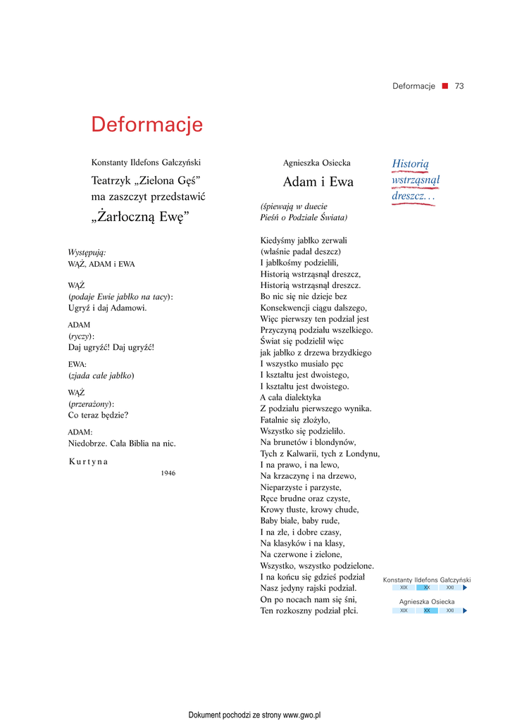 Deformacje 73 Deformacje Konstanty Ildefons Gałczyński Agnieszka Osiecka Historią Teatrzyk „Zielona Gęś” ma zaszczyt przedstawić Adam i Ewa wstrząsnął „Żarłoczną Ewę” Występują: WĄŻ, ADAM i EWA WĄŻ (podaje Ewie jabłko na tacy): Ugryź i daj Adamowi. ADAM (ryczy): Daj ugryźć! Daj ugryźć! EWA: (zjada całe jabłko) WĄŻ (przerażony): Co teraz będzie? ADAM: Niedobrze. Cała Biblia na nic. Kurtyna 1946 (śpiewają w duecie Pieśń o Podziale Świata) Kiedyśmy jabłko zerwali (właśnie padał deszcz) I jabłkośmy podzielili, Historią wstrząsnął dreszcz, Historią wstrząsnął dreszcz. Bo nic się nie dzieje bez Konsekwencji ciągu dalszego, Więc pierwszy ten podział jest Przyczyną podziału wszelkiego. Świat się podzielił więc jak jabłko z drzewa brzydkiego I wszystko musiało pęc I kształtu jest dwoistego, I kształtu jest dwoistego. A cała dialektyka Z podziału pierwszego wynika. Fatalnie się złożyło, Wszystko się podzieliło. Na brunetów i blondynów, Tych z Kalwarii, tych z Londynu, I na prawo, i na lewo, Na krzaczynę i na drzewo, Nieparzyste i parzyste, Ręce brudne oraz czyste, Krowy tłuste, krowy chude, Baby białe, baby rude, I na złe, i dobre czasy, Na klasyków i na klasy, Na czerwone i zielone, Wszystko, wszystko podzielone. I na końcu się gdzieś podział Nasz jedyny rajski podział. On po nocach nam się śni, Ten rozkoszny podział płci. Dokument pochodzi ze strony www.gwo.pl dreszcz. . . Konstanty Ildefons Gałczyński XIX XX XXI Agnieszka Osiecka XIX XX XXI 74 U ŹRÓDEŁ – KONFLIKT I PRZEBACZENIE zadania 1. Powiedz, do którego fragmentu Biblii nawiązują utwory Konstantego Ildefonsa Gałczyńskiego i Agnieszki Osieckiej. 2. Objaśnijcie, w jaki sposób oba utwory nawiązują do Biblii. W tym celu podzielcie klasę na dwie grupy. Jedna grupa wykonuje zadania, analizując tekst Żarłoczna Ewa, a druga – tekst Adam i Ewa. a) Porównajcie zachowania bohaterów we fragmencie Biblii i w analizowanym utworze. b) Określcie formę literacką utworu (gatunek, zastosowane zabiegi stylistyczne). c) Objaśnijcie, w jaki sposób przedstawienie postaci i forma literacka wpływają na wymowę utworu. d) Porównajcie metaforyczny sens biblijnej opowieści z wymową analizowanego utworu. W tym celu: przypomnijcie sobie przesłanie tekstu biblijnego, objaśnijcie, jak rozumiecie fragmenty: Niedobrze. Cała Biblia na nic (grupa 1.) oraz A cała dialektyka z podziału pierwszego wynika. [. . .] I na końcu się gdzieś podział nasz jedyny rajski podział (grupa 2.). e) Wnioski z analizy zapiszcie w tabeli. zachowanie bohaterów wymowa utworu fragment Biblii ? ? Żarłoczna Ewa ? ? Adam i Ewa ? ? 3. a) Porozmawiajcie o tym, na co należałoby zwrócić uwagę, przygotowując scenografię i rekwizyty do Żarłocznej Ewy Konstantego Ildefonsa Gałczyńskiego, oraz jakie melodie pasowałyby do Adama i Ewy Agnieszki Osieckiej. b) Podzielcie klasę na grupy składające się z 2 lub 3 osób i przygotujcie się do zaprezentowania jednego z utworów. 4. Zorganizujcie konkurs na najlepszą prezentację wybranego utworu. W tym celu: sporządźcie regulamin, wybierzcie jury, ustalcie datę konkursu. 5. W krótkiej pracy pisemnej opisz, jak wyobrażasz sobie scenografię do Żarłocznej Ewy lub Adama i Ewy. Zeszyt ćwiczeń, część 1. Werdykty Dokument pochodzi ze strony www.gwo.pl