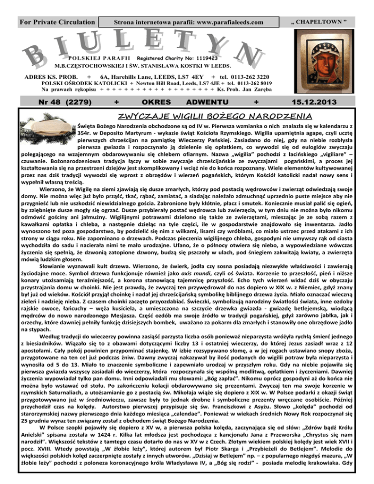 For Private Circulation Strona internetowa parafii: www.parafialeeds.com „ CHAPELTOWN ” P O L S K I E J P A R A F I I Registered Charity No: 1119423 M.B.CZĘSTOCHOWSKIEJ I ŚW. STANISŁAWA KOSTKI W LEEDS. ADRES KS. PROB. + 6A, Harehills Lane, LEEDS, LS7 4EY + tel. 0113-262 3220 POLSKI OŚRODEK KATOLICKI + Newton Hill Road, Leeds, LS7 4JE + tel. 0113-262 8019 Na prawach rękopisu + + + + + + + + + + + + + + + + + + + Ks. Prob. Jan Zaręba Nr 48 (2279) + OKRES ADWENTU + 15.12.2013 ZWYCZAJE WIGILII BOŻEGO NARODZENIA Święta Bożego Narodzenia obchodzone są od IV w. Pierwsza wzmianka o nich znalazła się w kalendarzu z 354r. w Deposito Martyrum ‐ wykazie świąt Kościoła Rzymskiego. Wigilia upamiętnia agape, czyli ucztę pierwszych chrześcijan na pamiątkę Wieczerzy Pańskiej. Zasiadano do niej, gdy na niebie rozbłysła pierwsza gwiazda i rozpoczynało ją dzielenie się opłatkiem, co wywodzi się od eulogiów zwyczaju polegającego na wzajemnym obdarowywaniu się chlebem ofiarnym. Nazwa „wigilia” pochodzi z łacińskiego „vigiliare” – czuwanie. Bożonarodzeniowa tradycja łączy w sobie zwyczaje chrześcijańskie ze zwyczajami pogańskimi, a proces jej kształtowania się na przestrzeni dziejów jest skomplikowany i wciąż nie do końca rozpoznany. Wiele elementów kultywowanej przez nas dziś tradycji wywodzi się wprost z obrzędów i wierzeń pogańskich, którym Kościół katolicki nadał nowy sens i wypełnił własną treścią. Wierzono, że Wigilę na ziemi zjawiają się dusze zmarłych, którzy pod postacią wędrowców i zwierząt odwiedzają swoje domy. Nie można więc już było prząść, tkać, rąbać, zamiatać, a siadając należało zdmuchnąć uprzednio puste miejsce aby nie przygnieść lub nie uszkodzić niewidzialnego gościa. Zabronione były kłótnie, płacz i smutek. Koniecznie musiał palić się ogień, by zziębnięte dusze mogły się ogrzać. Dusze przybierały postać wędrowca lub zwierzęcia, w tym dniu nie można było nikomu odmówić gościny ani jałmużny. Wigilijnymi potrawami dzielono się także ze zwierzętami, mieszając je ze sobą razem z kawałkami opłatka i chleba, a następnie dzieląc na tyle części, ile w gospodarstwie znajdowało się inwentarza. Jadło wynoszono też poza gospodarstwo, by podzielić się nim z wilkami, lisami czy wróblami, co miało ustrzec przed atakami z ich strony w ciągu roku. Nie zapominano o drzewach. Podczas pieczenia wigilijnego chleba, gospodyni nie umywszy rąk od ciasta wychodziła do sadu i nacierała nimi te mało urodzajne. Ufano, że o północy otwiera się niebo, a wypowiedziane wówczas życzenia się spełnią, że dzwonią zatopione dzwony, budzą się pszczoły w ulach, pod śniegiem zakwitają kwiaty, a zwierzęta mówią ludzkim głosem. Słowianie wyznawali kult drzewa. Wierzono, że świerk, jodła czy sosna posiadają niezwykłe właściwości i zawierają życiodajne moce. Symbol drzewa funkcjonuje również jako axis mundi, czyli oś świata. Korzenie to przeszłość, pień i niższe konary utożsamiają teraźniejszość, a korona stanowiącą tajemnicę przyszłość. Echo tych wierzeń widać dziś w obyczaju przystrajania domu w choinki. Nie jest prawdą, że zwyczaj ten przywędrował do nas dopiero w XIX w. z Niemiec, gdyż znany był już od wieków. Kościół przyjął choinkę i nadał jej chrześcijańską symbolikę biblijnego drzewa życia. Miało oznaczać wieczną zieleń i nadzieję nieba. Z czasem choinki zaczęto przyozdabiać. Świeczki, symbolizują narodziny światłości świata, inne ozdoby rajskie owoce, łańcuchy – węża kusiciela, a umieszczona na szczycie drzewka gwiazda ‐ gwiazdę betlejemską, wiodącą mędrców do nowo narodzonego Mesjasza. Część ozdób ma swoje źródło w tradycji pogańskiej, gdyż zarówno jabłka, jak i orzechy, które dawniej pełniły funkcję dzisiejszych bombek, uważano za pokarm dla zmarłych i stanowiły one obrzędowe jadło na stypach. Według tradycji do wieczerzy powinna zasiąść parzysta liczba osób ponieważ nieparzysta wróżyła rychłą śmierć jednego z biesiadników. Wiązało się to z obawami dotyczącymi liczby 13 i ostatniej wieczerzy, do której Jezus zasiadł wraz z 12 apostołami. Cały pokój powinien przypominać stajenkę. W izbie rozsypywano słomę, a w jej rogach ustawiano snopy zboża, przygotowane na ten cel już podczas żniw. Dawny zwyczaj nakazywał by ilość podanych do wigilii potraw była nieparzysta i wynosiła od 5 do 13. Miało to znaczenie symboliczne i zapewniało urodzaj w przyszłym roku. Gdy na niebie pojawiła się pierwsza gwiazda wszyscy zasiadali do wieczerzy, która rozpoczynała się wspólną modlitwą, opłatkiem i życzeniami. Dawniej życzenia wypowiadał tylko pan domu. Inni odpowiadali mu słowami: „Bóg zapłać”. Nikomu oprócz gospodyni aż do końca nie można było wstawać od stołu. Po zakończeniu kolacji obdarowywano się prezentami. Zwyczaj ten ma swoje korzenie w rzymskich Saturnaliach, a utożsamianie go z postacią św. Mikołaja wiąże się dopiero z XIX w. W Polsce podarki z okazji świąt przygotowywano już w średniowieczu, zawsze były to jednak drobne i symboliczne prezenty wręczane osobiście. Później przychodził czas na kolędy. Autorstwo pierwszej przypisuje się św. Franciszkowi z Asyżu. Słowo „kolęda” pochodzi od starorzymskiej nazwy pierwszego dnia każdego miesiąca „calendae”. Ponieważ w wiekach średnich Nowy Rok rozpoczynał się 25 grudnia wyraz ten związany został z obchodem świąt Bożego Narodzenia. W Polsce szopki pojawiły się dopiero z XV w, a pierwsza polska kolęda, zaczynająca się od słów: „Zdrów bądź Królu Anielski” spisana została w 1424 r. Kilka lat młodsza jest pochodząca z kancjonału Jana z Przeworska „Chrystus się nam narodził”. Większość tekstów z tamtego czasu dotarło do nas w XV w z Czech. Złotym wiekiem polskiej kolędy jest wiek XV