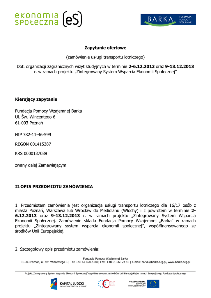 Zapytanie ofertowe (zamówienie usługi transportu lotniczego) Dot. organizacji zagranicznych wizyt studyjnych w terminie 2-6.12.2013 oraz 9-13.12.2013 r. w ramach projektu „Zintegrowany System Wsparcia Ekonomii Społecznej” Kierujący zapytanie Fundacja Pomocy Wzajemnej Barka Ul. Św. Wincentego 6 61-003 Poznań NIP 782-11-46-599 REGON 001415387 KRS 0000137089 zwany dalej Zamawiającym II.OPIS PRZEDMIOTU ZAMÓWIENIA 1. Przedmiotem zamówienia jest organizacja usługi transportu lotniczego dla 16/17 osób z miasta Poznań, Warszawa lub Wrocław do Mediolanu (Włochy) i z powrotem w terminie 26.12.2013 oraz 9-13.12.2013 r. w ramach projektu „Zintegrowany System Wsparcia Ekonomii Społecznej. Zamówienie składa Fundacja Pomocy Wzajemnej „Barka” w ramach projektu „Zintegrowany system wsparcia ekonomii społecznej”, współfinansowanego ze środków Unii Europejskiej. 2. Szczegółowy opis przedmiotu zamówienia: Fundacja Pomocy Wzajemnej Barka 61-003 Poznań, ul. św. Wincentego 6 | Tel: +48 61 668 23 00, Fax: +48 61 668 24 16 | e-mail: [email protected], www.barka.org.pl - organizacja transportu lotniczego dla 16/17 osób w dniach 2-6.12.2013 oraz 9-13.12.2013 r. w ramach projektu „Zintegrowany System Wsparcia Ekonomii Społecznej” - wylot opcjonalnie z miasta Poznań, Wrocław lub Warszawa do Mediolanu (Włochy) i z powrotem w dniach 2-6.12.2013 oraz 9-13.12.2013 r. w ramach projektu „Zintegrowany System Wsparcia Ekonomii Społecznej” 3.Termin składania oferty: - do 25.11.2013 III. MIEJSCE ORAZ TERMIN SKŁADANIA OFERT 1.Oferta powinna być przesłana za pośrednictwem: poczty elektronicznej na adres: [email protected] , nr kontaktowy +48 530 433 185, pocztą lub przy pomocy kuriera. 2.Ocena ofert zostanie dokonana w dniu 26.11.2013, a wyniki i wybór najkorzystniejszej oferty zostanie ogłoszony o godzinie 12:00 w siedzibie Fundacji Pomocy Wzajemnej „Barka” oraz na stronie internetowej pod adresem http://barka.org.pl 3.Oferty złożone po terminie nie będą rozpatrywane 4.Oferent może przed upływem terminu składania ofert zmienić lub wycofać swoją ofertę. 5.W toku badania i oceny ofert Zamawiający może żądać od oferentów wyjaśnień dotyczących treści złożonych ofert. 6.Zapytanie ofertowe zamieszczono na stronie: http://barka.org.pl IV. OCENA OFERT Zamawiający dokona oceny ważnych ofert na podstawie następujących kryteriów: 1 - Cena 100% Fundacja Pomocy Wzajemnej Barka 61-003 Poznań, ul. św. Wincentego 6 | Tel: +48 61 668 23 00, Fax: +48 61 668 24 16 | e-mail: [email protected], www.barka.org.pl Fundacja Pomocy Wzajemnej Barka 61-003 Poznań, ul. św. Wincentego 6 | Tel: +48 61 668 23 00, Fax: +48 61 668 24 16 | e-mail: [email protected], www.barka.org.pl