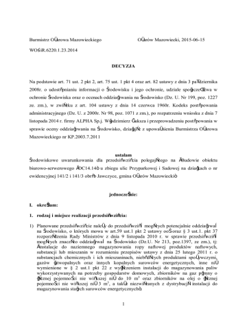 Burmistrz Ożarowa Mazowieckiego Ożarów Mazowiecki, 2015-06-15 WOŚiR.6220.1.23.2014 DECYZJA Na podstawie art. 71 ust. 2 pkt 2, art. 75 ust. 1 pkt 4 oraz art. 82 ustawy z dnia 3 października 2008r. o udostępnianiu informacji o środowisku i jego ochronie, udziale społeczeństwa w ochronie środowiska oraz o ocenach oddziaływania na środowisko (Dz. U. Nr 199, poz. 1227 ze. zm.), w związku z art. 104 ustawy z dnia 14 czerwca 1960r. Kodeks postępowania administracyjnego (Dz. U. z 2000r. Nr 98, poz. 1071 z zm.), po rozpatrzeniu wniosku z dnia 7 listopada 2014 r. firmy ALPHA Sp.j. Włodzimierz Łuksza i przeprowadzeniu postępowania w sprawie oceny oddziaływania na środowisko, działając z upoważnienia Burmistrza Ożarowa Mazowieckiego nr KP.2003.7.2011 ustalam środowiskowe uwarunkowania dla przedsięwzięcia polegającego na „Budowie obiektu biurowo-serwerowego „DC14.14” u zbiegu ulic Przyparkowej i Sadowej na działkach o nr ewidencyjnej 141/2 i 141/3 obręb Jawczyce, gmina Ożarów Mazowiecki” jednocześnie: I. określam: 1. rodzaj i miejsce realizacji przedsięwzięcia: 1) Planowane przedsięwzięcie należy do przedsięwzięć mogących potencjalnie oddziaływać na środowisko, o których mowa w art.59 ust.1 pkt 2 ustawy ooś oraz § 3 ust.1. pkt 37 rozporządzenia Rady Ministrów z dnia 9 listopada 2010 r. w sprawie przedsięwzięć mogących znacząco oddziaływać na środowisko (Dz.U. Nr 213, poz.1397, ze zm.), tj: „instalacje do naziemnego magazynowania ropy naftowej produktów naftowych, substancji lub mieszanin w rozumieniu przepisów ustawy z dnia 25 lutego 2011 r. o substancjach chemicznych i ich mieszaninach, niebędących produktami spożywczymi, gazów łatwopalnych oraz innych kopalnych surowców energetycznych, inne niż wymienione w § 2 ust.1 pkt 22 z wyłączeniem instalacji do magazynowania paliw wykorzystywanych na potrzeby gospodarstw domowych, zbiorników na gaz płynny o łącznej pojemności nie większej niż do 10 m3 oraz zbiorników na olej o łącznej pojemności nie większej niż 3 m3, a także niezwiązanych z dystrybucją instalacji do magazynowania stałych surowców energetycznych”. 1 „Planowane przedsięwzięcie polega na budowie obiektu biurowo-serwerowego DC14.14 u zbiegu ulic Przyparkowej i Sadowej na dz.ew.141/2 i 141/3 obręb Jawczyce, gmina Ożarów Mazowiecki. Łączna powierzchnia działek inwestycyjnych wynosi 30119,4 m3. Obecnie w północno-wschodniej części terenu inwestycyjnego znajduje się budynek o powierzchni ok. 90 m2, który zostanie rozebrany. Pozostałą część działki jest niezagospodarowana. Powierzchnia zabudowy wyniesie ok. 3607 m2, a powierzchnia utwardzona ok. 5610 m2. Łączna powierzchnia użytkowa obiektu wyniesie ok. 7500 m2. Obiekt składał się będzie z 3 –kondygnacyjnego budynku serwerowo-biurowego i dwóch 2-kondygnacyjnych budynków techniczno-energetycznych. Obiekt serwerowni pracował będzie całodobowo, natomiast obiekt biurowy w godzinach dziennych. Budynek zostanie zaopatrzony w system zasilania awaryjnego w ramach którego zainstalowanych zostanie 6 awaryjnych agregatów prądotwórczych o mocy 2 MWe każdy zasilanych olejem napędowym. Agregaty zlokalizowane będą na parterze budynku. Olej napędowy do zasilania agregatów będzie magazynowany w 4 dwupłaszczowych zbiornikach o pojemności ok. 13 m3 każdy, zlokalizowanych w wydzielonych pomieszczeniach budynków techniczno-energetycznych. Dodatkowo przy agregatach znajdować się będzie 8 zbiorników paliwa o pojemności do 1 m3 każdy. Jednocześnie w ramach inwestycji wykonany zostanie parking na 53 pojazdy wraz z towarzyszącą infrastrukturą o powierzchni użytkowej nie przekraczającej 0,1 ha. Dodatkowo zostaną wykonane 2 wjazdy i droga wewnętrzna. 3) Otoczenie miejsca realizacji przedsięwzięcia stanowią: - od północy niska zabudowa mieszkaniowa - od wschodu teren po byłym gospodarstwie hodowli roślin (obecnie nieużytek), a dalej pas drogowy drogi S8 - od południa teren po byłej szkółce drzew iglastych (obecnie nieużytek), dalej pas drogowy ulicy Przyparkowej, a w odległości ok. 100 m od granic terenu inwestycji budynek mieszkalny, dalej sady i pola uprawne. - od zachodu pas drogowy ulicy Sadowej, dalej niska zabudowa mieszkaniowo-usługowa Najbliższa zabudowa mieszkaniowa znajduje się w odległości 35 m od granicy planowanej inwestycji. 4) Teren inwestycji objęty jest miejscowym planem zagospodarowania przestrzennego zatwierdzonym uchwałą Nr 395/2013 Rady Miejskiej w Ożarowie Mazowieckim z dnia 12 września 2013 (Dz.Urz.Woj.Maz. poz. 9772 z dnia 23 września 2013 r.). Zgodnie z ww. miejscowym planem zagospodarowania przestrzennego dz.ew. 141/2 znajduje się na terenie zabudowy usługowej z dopuszczeniem funkcji mieszkaniowej jednorodzinnej (symbol planu: U/MN) oraz na terenie publicznej drogi lokalnej i dojazdowej (symbol planu: KDL i KDD). Natomiast dz.ew.141/3 w Jawczycach znajduje się na terenie przeznaczonym pod zabudowę usługową, obiekty produkcyjne, skałdy i magazyny (symbol planu U/P) oraz pod publiczną drogę dojazdową (symbol planu: KDD). Zarówno na terenie zabudowy usługowej z dopuszczeniem funkcji mieszkaniowej jednorodzinnej (symbol planu:U/MN), jak i zabudowy usługowej, obiektów produkcyjnych, składów i magazynów (symbol planu: U/P), przeznaczeniem podstawowym są m.in. serwerownie. 5) W trakcie realizacji przedsięwzięcia wystąpi emisja substancji do powietrza oraz hałasu, spowodowana eksploatacją sprzętu budowlanego i środków transportu. Uciążliwości związane z realizacją inwestycji będą okresowe i ustąpią po zakończeniu prac budowlanych. Wszystkie maszyny i urządzenia pracujące na terenie inwestycji utrzymywane będą w dobrym stanie technicznym i konserwowane systematycznie w sposób prawidłowy, pozwalający na uniknięcie wycieków płynów technicznych i paliw do środowiska gruntowo-wodnego. Transportowane i magazynowane na terenie budow