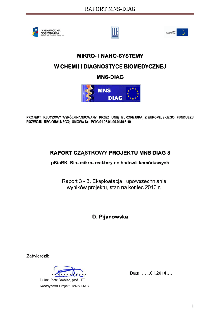 RAPORTMNS‐DIAG MIKRO- I NANO-SYSTEMY W CHEMII I DIAGNOSTYCE BIOMEDYCZNEJ MNS-DIAG PROJEKT KLUCZOWY WSPÓŁFINANSOWANY PRZEZ UNIĘ EUROPEJSKĄ Z EUROPEJSKIEGO FUNDUSZU ROZWOJU REGIONALNEGO; UMOWA Nr. POIG.01.03.01-00-014/08-00 RAPORT CZĄSTKOWY PROJEKTU MNS DIAG 3 µBioRK Bio- mikro- reaktory do hodowli komórkowych Raport 3 - 3. Eksploatacja i upowszechnianie wyników projektu, stan na koniec 2013 r. D. Pijanowska Zatwierdził: ……………………. Data: …...01.2014…. Dr inż. Piotr Grabiec, prof. ITE Koordynator Projektu MNS DIAG 1 RAPORTMNS‐DIAG 1. Planowana eksploatacja wyników projektu. IBIB PAN: W wyniku realizacji projektu powstały nowe modele miniaturowych bioreaktorów do hodowli komórkowych, dostosowanych do wymagań komórek wątrobowych - hepatocytów. Bioreaktory są wykorzystywane w pracach nad optymalizacją warunków hodowli np. badaniach wpływu różnych białek macierzy zewnątrzkomórkowej na rozwój i aktywność syntetyczną hepatocytów, a w niedalekiej przyszłości zostaną zastosowane do hodowli innych typów komórek. Na bazie uzyskanych wyników oraz doświadczeń zgromadzonych podczas wykonywania projektu (w tym wykorzystania nowych technologii m.in. miękkiej fotolitografii PDMS, obróbki plazmowej, obróbki laserowej) IBIB PAN planuje skonstruowanie bardziej złożonych układów, takich jak biosztuczna wątroba, czy bioreaktory z wbudowanymi układmi monitorowania stanu hodowli i aktywności metabolicznej komórek. Ponadto, uzyskane trwale fluoryzujące linie komórkowe (produkujące białka fluoryzujące GFP i DdRed2) są bardzo wygodnym materiałem badawczym, który może być wykorzystywany nie tylko w realizowanym projekcie, ale również w projektach kolejnych np. związanych z badaniem cytotoksyczności różnych substancji. Szczególną zaletą tych linii komórkowych jest możliwość bieżących obserwacji mikroskopowych komórek w kokulturach bez konieczności ich dodatkowego barwienia PŁ: Niezwykle interesującym rezultatem pod kątem wdrożenia jest wytworzenie mikrostruktur w diamencie polikrystalicznym przy pomocy lasera Nd:YAG o długości fali 355 nm. Badania przy pomocy spektroskopii ramanowskiej wykazały, że przy użyciu lasera można otrzymywać mikrostruktury zarówno nie zmieniając materiału wyjściowego jak również modyfikować materiał (diament) w konkretnych miejscach poprzez jego grafityzację, amorfizację, zmianę chropowatości itp. AGH: Opracowano układ detekcji fluorescencji z wykorzystaniem fotopowielaczy krzemowych oraz układ pomiarowy oparty na układzie ASIC i FPGA (programowalna matryca bramek). Jako demonstrator zaproponowanych rozwiązań technicznych przygotowano system wykorzystujący układ ASIC sterowany z programowalnego układu FPGA. Demonstrator został wykorzystany do badań nad detekcją wybranych związków fluoryzujących: fluoresceinian sodu, rezorufina w układach mikroprzepływowych. Zespoły IBIB PAN, AGH i ITE planują wykorzystanie opracowanych technologii w dalszych wspólnych projektach. 2. Zrealizowane działania upowszechniające. IBIB PAN: W ramach prac nad projektem, w dniach 21-24.05.2009 zostało zorganizowane seminarium poświęcone projektowi 3, na którym przedstawiono 8 referatów związanych z problematyką bioreaktorów komórkowych, ich konstrukcją i technologią. Celem seminarium było upowszechnienie informacji o rozpoczętej wówczas realizacji projektu MNS-DIAG oraz związanych z jego tematyką zagadnień naukowo-badawczych. W seminarium wzięli udział m.in. goście zagraniczni, w tym: dr Duncan Cheng-En Lue (CGU, Tao-Yuan, Taiwan) oraz dr Carlos Lopez (Hospital de Tortsa Verge de la Cinta, Hiszpania). Publikacje i doniesienia: F. Ilnicki, B. Wawro, D. Pijanowska, W. Torbicz. Modelowanie hydrodynamiki w układach mikroprzepływowych. Plakat, XI Konferencja Naukowa Czujniki Optoelektroniczne i Elektroniczne, 20-23 czerwca, 2010. F Ilnicki, B Wawro, D Pijanowska, W Torbicz. Modelowanie hydrodynamiki w układach przepływowych. Przegląd Elektrotechniczny, 2010, 10, 86, 27-29. W. Kaczorowski, D. Batory, A. Karczemska, B. Wawro, D. Pijanowska. (2010). Diamond-like coatings as supports for cell culturing. Plakat, 5-th Wide Bandgap Materials – Progress in synthesis and 2 RAPORTMNS‐DIAG applications / 7-th Diamond and related materials / 2-th International Workshop on Science and Applications of Nanoscale Diamond Materials, Zakopane 2010. Wyróżnienie. B. Wawro and D. Pijanowska. Mikro-Bioreactors for cell cultures. Forum: Best of East – for Eastern Partnership. Warszawa 28-30 listopada, 2011. M. Baszczyk, S. Głąb, P. Dorosz, W. Kucewicz, Ł.Mik, D.G. Pijanowska, M. Sapor, R. Szczypiński, Detection of fluorescent light using silicon photomultipliers. Forum: Best of East – for Eastern Partnership. Warszawa 28-30 listopada, 2011. A. Samluk, K. Zakrzewska, K. Pluta, Generation of fluorescently labelled cell lines: C3A hepatoma cells and human skin fibroblasts. Forum: Best of East – for Eastern Partnership. Warszawa 28-30 listopada, 2011. D.G. Pijanowska, Biosensors and microsystems for biochemical analysis and tissue engineering, The 4th LABONFOIL Annual Workshop “Lab-on-a-Chip multidisciplinary partnership”, Wrocław, May 11th, 2011. D.G. Pijanowska, Department of Hybrid and Analytical Micro-biosystems - Research Activities, Brain Storming Meeting. University of Strasbourg, Strasburg, France, April 14th, 2011. R. Szczypiński, J. Grzelka, A. Baraniecka, D.G. Pijanowska, M. Górska, R. Grodecki, A. Panas, P. Grabiec, J.M. Łysko, Microfluidic Preconcentrator and Microfluidic Chip for Bacterial Cells Detection. Acta Optica Applicata, XLI/2, 2011, 395-401. J. Grzelka, R. Szczypiński, D.G. Pijanowska, R. Grodecki, J. Lesiński, P. Grabiec, J.M. Łysko, Optoelectronic Bacteria Cells Detection System, Acta Optica Applicata, XLI/2, 2011, 403-408. B. Wawro, F. Ilnicki, D.G. Pijanowska, W. Torbicz. Micro-bioreactors for Cell Culturing. Lecture Notes of the 