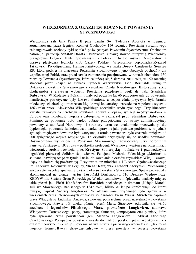 WIECZORNICA Z OKAZJI 150 ROCZNICY POWSTANIA STYCZNIOWEGO Wieczornica sali Jana Pawła II przy parafii Św. Tadeusza Apostoła w Legnicy, zorganizowana przez legnicki Komitet Obchodów 150 rocznicy Powstania Styczniowego zainaugurowała obchody cykl spotkań poświęconych Powstaniu Styczniowemu. Obchodom patronuje patronuje Senator Dorota Czudowska. Oprawę słowno muzyczną Wieczornicy przygotował Legnicki Klub Stowarzyszenia Polskich Chrześcijańskich Demokratów, a oprawę plastyczną legnicki klub Gazety Polskiej. Wieczornicę poprowadził Ryszard Jaśkowski. Po odśpiewaniu Hymnu Państwowego wystąpiła Dorota Czudowska Senator RP, która podkreśliła znaczenie Powstania Styczniowego i jego obecnych obchodów dla współczesnej Polski, oraz przedstawiła zamierzania podejmowane w ramach obchodów 150 rocznicy Powstania Styczniowego, które zakończą się 5 sierpnia 2014 roku, w 150 rocznicę stracenia przez Rosjan na stokach Cytadeli Warszawskiej Gen. Romualda Traugutta Dyktatora Powstania Styczniowego i członków Rządu Narodowego. Historyczny szkic okoliczności i przyczyn wybuchu Powstania przedstawił prof. dr hab. Stanisław Dąbrowski. W Królestwie Polskim trwały od początku lat 60 przygotowania do powstania, manifestacje patriotyczne były krwawo tłumione, a bezpośrednią przyczyną była branka młodzieŜy szlacheckiej i mieszczańskiej do wojska carskiego zarządzona w połowie stycznia 1863 roku przez Aleksandra Wielopolskiego naczelnika rządu cywilnego. Trzy kluczowe kwestie zawaŜyły na przebiegu powstania: sprawa chłopska, sytuacja międzynarodowa w Europie oraz liczebność wojska i uzbrojenie. – zaznaczył prof. Stanisław Dąbrowski. Pomimo, Ŝe powstanie było bardzo dobrze przygotowane od strony administracyjnej, powołany został Rząd Narodowy i struktury terenowe, znakomicie pracowała polska dyplomacja, powstanie funkcjonowało bardzo sprawnie jako państwo podziemne, to jednak sytuacja międzynarodowa nie była korzystna, a armia powstańcza była znacznie mniejsza od 200 tysięcznego wojska rosyjskiego. Te czynniki przyczyniły się do upadku powstania. Doświadczenia wyniesione z Powstania Styczniowego zaowocowały przy odrodzeniu Państwa Polskiego w 1918 roku – podkreślił prelegent. Wyjątkowe wraŜenie na uczestnikach wieczornicy zrobiła recytacja przez Krystynę Sobierajską – bohaterkę i przywódczynię legnickiej pierwszej Solidarności, wiersza Felicjana Medarda Faleńskiego „Morituri te salutant” nawiązującego w tytule i treści do zawołania z czasów rzymskich: Witaj, Cezarze, idący na śmierć cię pozdrawiają. Recytowała teŜ młodzieŜ z I Liceum Ogólnokształcacego im. Tadeusza Kościuszki w Legnicy, Michał Ratajczak i Robert Saczyński.. Wieczornicę zakończyło wspólne śpiewanie pieśni z okresu Powstania Styczniowego. Śpiew prowadził i akompaniował na gitarze Artur Torbiński DruŜynowy z 710 Druzyny Wędrowniczej KEDYW im. Stefana Grota Roweckiego. W okolicznościowym śpiewniku znalazły miejsce takie pieśni jak: Pieśń Konfederatów Barskich pochodząca z dramatu „Ksiądz Marek” Juliusza Słowackiego, napisanego w 1847 roku, blisko 70 lat po konfederacji, do której muzykę napisał Andrzej Kurylewicz. W okresie stanu wojennego była śpiewana w więzieniach przez internowanych działaczy solidarności. Pieśń Marsz Strzelców napisana przez Władysława Ludwika Anczyca, śpiewana powszechnie przez uczestników Powstania Styczniowego. Prawie pół wieku później pieśń Marsz Strzelców odrodziła się wśród strzelców i legionistów Piłsudskiego. Marsz powstańców Langiewicza, autorstwa Władysława Tarnowskiego, poety, dramaturga, tłumacza, kompozytora oraz pianisty, która była śpiewana przez powstańców gen, Mariana Langiewicza i oddział Dionizego Czachowskiego. Po upadku powstania weszła do tradycji polskich pieśni wojskowych i z czasem upowszechniła się jej potoczna nazwa wzięta z pierwszego wersu tekstu „Jak to na wojence ładnie”. Bywaj dziewczę zdrowe – pieśń powstała w okresie Powstania Listopadowego. Autor i kompozytor nieznany. Przypuszcza się, Ŝe twórcą jest Rajnold Suchodolski, autor wielu pieśni patriotycznych z tego okresu. Ostatni mazur – powszechnie znana, śliczna piosenka, której melodia niekiedy przypisywana jest Chopinowi. Opowiadano o powstańczym balu przed bitwą o Olszynkę Grochowską, na którym nad ranem tańczono „białego mazura”. Doszukiwano się pochodzenia melodii i tekstu w czasach ułanów księcia Józefa. Prawda nie jest tak romantyczna! Utwór napisał Ludwik Ksawery Łubiński adwokat, twórca wierszy patriotycznych, uczestnik Powstania Styczniowego, znacznie później, prawdopodobnie w okresie powstania styczniowego. Pieśń W krwawym polu, do której Wincenty Pol, napisał słowa, a muzykę skomponował Alfred Bojarski. Pieśń powstała w końcu lutego 1863 roku we Lwowie, jako akt poŜegnania męŜczyzn odchodzących do partyzantki. Początkowo utwór wykonywali tylko powstańcy w obozie Antoniego Jeziorańskiego. Szybko jednak zdobył powszechną popularność w oddziałach na terenie wszystkich zaborów. Marsz Obozowy jest jedną z ośmiu pieśni powstańczych, jakie skomponował Karol Kurpiński chcąc przyczynić się do wzrostu uczuć patriotycznych i nastrojów rewolucyjnych. Utwór powstał w nocy z 1 na 2 lutego 1831 r. Autorem słów jest Jędrzej Słowaczyński. Bardzo popularna w okresie Powstania Styczniowego.Pieśń „Chorał” powstała po upadku Powstania Krakowskiego zakończonego krwawą rzezią szlachty polskiej i spaleniem ok. 500 dworów przez chłopów z inspiracji zaborcy austriackiego w 1846 roku. Wstrząśnięty tymi wydarzeniami 19- letni kompozytor Józef Nikorowicz skomponował utwór o nazwie „Chorał”. Jego przyjaciel, poeta Kornel Ujejski będąc pod wpływem tej melodii napisał do niej tekst, który został opublikowany w 1847 roku w tomie „Skargi Jeremiego”. W swoim tek