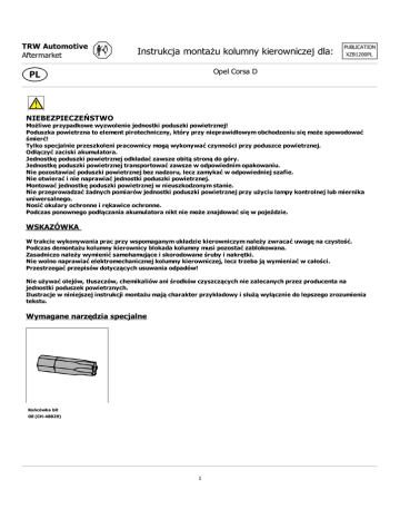 TRW Automotive Aftermarket Instrukcja montażu kolumny kierowniczej dla: PUBLICATION XZB1200PL Opel Corsa D NIEBEZPIECZEŃSTWO Możliwe przypadkowe wyzwolenie jednostki poduszki powietrznej! Poduszka powietrzna to element pirotechniczny, który przy nieprawidłowym obchodzeniu się może spowodować śmierć! Tylko specjalnie przeszkoleni pracownicy mogą wykonywać czynności przy poduszce powietrznej. Odłączyć zaciski akumulatora. Jednostkę poduszki powietrznej odkładać zawsze obitą stroną do góry. Jednostkę poduszki powietrznej transportować zawsze w odpowiednim opakowaniu. Nie pozostawiać poduszki powietrznej bez nadzoru, lecz zamykać w odpowiedniej szafie. Nie otwierać i nie naprawiać jednostki poduszki powietrznej. Montować jednostkę poduszki powietrznej w nieuszkodzonym stanie. Nie przeprowadzać żadnych pomiarów jednostki poduszki powietrznej przy użyciu lampy kontrolnej lub miernika uniwersalnego. Nosić okulary ochronne i rękawice ochronne. Podczas ponownego podłączania akumulatora nikt nie może znajdować się w pojeździe. WSKAZÓWKA W trakcie wykonywania prac przy wspomaganym układzie kierowniczym należy zwracać uwagę na czystość. Podczas demontażu kolumny kierownicy blokada kolumny musi pozostać zablokowana. Zasadniczo należy wymienić samohamujące i skorodowane śruby i nakrętki. Nie wolno naprawiać elektromechanicznej kolumny kierowniczej, lecz trzeba ją wymieniać w całości. Przestrzegać przepisów dotyczących usuwania odpadów! Nie używać olejów, tłuszczów, chemikaliów ani środków czyszczących nie zalecanych przez producenta na jednostki poduszek powietrznych. Ilustracje w niniejszej instrukcji montażu mają charakter przykładowy i służą wyłącznie do lepszego zrozumienia tekstu. Wymagane narzędzia specjalne Końcówka bit OE (CH-48829) 1 Momenty obrotowe Momenty dokręcania Śruby i nakrętki samozabezpieczające należy bezwzględnie wymienić. Śruba(-y) modułu kolumny (patrz rysunek 3) kierownicy (3) 20 Nm śruba(y) - przegubu krzyżowego (1) (patrz rysunek 5) Oczyścić gwint i użyć środka zabezpieczającego śruby. na górze 40 Nm; na dole 55 Nm Śruby (śruba) – kolumna kierownicza (2) (patrz rysunek 6) Zwracać uwagę na kolejność dociągania. 22 Nm Śruba(-y) wału kierowniczego (1) (patrz rysunek 7) Zastosować nową śrubę. przy kolumnie kierownicy 24 Nm + 60° Nakrętka (-i) kierownicy 30 Nm 2 Rysunek 1 Demontaż: Ustawić kierownicę w położeniu środkowym i zatrzasnąć zamek blokady kierownicy. Odłączyć biegun ujemny akumulatora. Zachować czas oczekiwania co najmniej 1 min. Wymontować poduszkę powietrzną kierowcy. Wymontować kierownicę. Wykręcić śrubę(-y) osłon(-y) kolumny kierowniczej. (1) Wymontować obudowę drążka kierowniczego. (2) Zdjąć przewód(-y) elektryczny(-e) z dolnej okładziny kolumny kierownicy. (patrz rysunek 1) 1 Śruba(-y) osłon(-y) kolumn(-y) kierowniczych(-ej) Rozłączyć złącze(-a) elektryczne tempomatu. (jeśli istnieje) (1) Zaczepy przełącznika na kolumnie kierownicy odblokować odpowiednim narzędziem. (2) Wymontować włącznik kierunkowskazów na kolumnie kierownicy. (3) Zaczepy przełącznika na kolumnie kierownicy odblokować odpowiednim narzędziem. (2) Wymontować włącznik wycieraczek na kolumnie kierownicy. (4) (patrz rysunek 2) 2 Okładzina kolumny kierownicy Rysunek 2 3 1 Elektryczne złącze(a) wtykowe 2 Narzędzie(-a) 3 Włącznik kierunkowskazów na kolumnie kierownicy 4 Włącznik wycieraczek na kolumnie kierownicy Rozłączyć złącze(-a) elektryczne modułu kolumny kierownicy. (1)(2) Wykręcić śrubę(-y) modułu kolumny kierownicy. (3) Rysunek 3 Potrzebne narzędzia specjalne: Końcówka bit OE (CH-48829) Zwolnić blokadę modułu kolumny kierownicy. (4) Kluczyk zapłonowy obrócić w pozycję 1. Zdemontować moduł kolumny kierownicy. (5) (patrz rysunek 3) 1 Elektryczne złącze(a) wtykowe 2 Elektryczne złącze(a) wtykowe 3 Śruba(-y) modułu kolumny kierownicy 4 Blokada modułu kolumny kierownicy 5 Moduł kolumny kierownicy Wymontować kanał nawiewu na nogi kierowcy. Otworzyć obudowę skrzynki bezpiecznikowej. Rysunek 4 Wykręcić śrubę(-y) okładziny wnęki na nogi po stronie kierowcy. (1) Wymontować osłonę wnęki na nogi. (2) (patrz rysunek 4) 1 Śruba(-y) okładziny wnęki na nogi po stronie kierowcy 4 2 Osłona przestrzeni na nogi Wykręcić śrubę(y) - przegubu krzyżowego. (1) Zdjąć przegub krzyżowy z przekładni kierowniczej w kierunku do góry. (2) (patrz rysunek 5) Rysunek 5 1 śruba(y) - przegubu krzyżowego Odłączyć złącze elektryczne od sterownika elektryczego wspomagania układu kierowniczego. (1) Wykręcić śrubę (śruby) kolumny kierowniczej. (2) (patrz rysunek 6) 2 Przegub krzyżowy układu kierowniczego Rysunek 6 Wymontować kolumnę kierownicy. 1 Elektryczne złącze(a) wtykowe 5 2 Śruby (śruba) – kolumna kierownicza Wykręcić śrubę(-y) wału kierowniczego. (1) Zdemontować wał kierownicy z kolumny kierownicy. (2) (patrz rysunek 7) Rysunek 7 Montaż: Regulacja pochylenia kolumny kierownicy musi być zamknięty! Montaż w odwrotnej kolejności do demontażu. Śrubę(-y) kolumny kierownicy dokręcić w podanej poniżej kolejności. (2) Śruby dokręcić w kolejności: dolna lewa, dolna prawa, górna lewa i górna prawa. (patrz rysunek 6) Dalszy montaż w odwrotnej kolejności do demontażu. Zdekodować radio, zaprogramować pamięć ulotną. Sprawdzić działanie urządzeń elektrycznych. Dokonać wyuczenia czujnika kąta odchylenia koła kierowanego. 1 Śruba(-y) wału kierowniczego 2 Wał obrotowy kierowniczy Sprawdzić pozycje jazdy na wprost, w razie potrzeby wyregulować ją. (maksymalna różnica 5°) Włączyć zapłon. Obrócić kierownicę w obie strony do oporu. Lampka kontrolna wspomagania układu kierowniczego gaśnie. Jeśli lampka kontrolna wspomagania układu kierowniczego nie zgaśnie, trzeba za pomocą odpowiedniego testera diagnostycznego skalibrować czujnik 