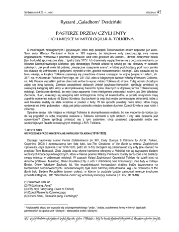 Simbelmynë # 20 – LATO STRONA 45 Ryszard „Galadhorn” Derdziński PASTERZE DRZEW CZYLI ENTY I ICH MIEJSCE W MITOLOGII J.R.R. TOLKIENA O inspiracjach mitologicznych i językowych, które dały początek Tolkienowskim entom napisano już wiele. Sam autor Władcy Pierścieni w liście nr 163 wyjawia, że książkowe enty zawdzięczają swą nazwę anglosaskiemu wersetowi z poematu Wędrowiec: eald enta geweorc idlu stodon... ‘dawne olbrzymów dzieła [tzn. budowle] spustoszone stały...’ (patrz Listy 317)1. Ich drzewiasty wygląd bierze się z poczucia niedosytu po lekturze Szekspirowskiego Makbeta, gdy dorastający Ronald widział tę sztukę po raz pierwszy w czasach szkolnych. Jak pisał wiele lat później, „niezręczne rozegranie sceny”, w której podchodzący pod mury zamku las okazuje się żołnierzami z gałęziami, wywołał w nim „gorzkie rozczarowanie i niechęć”. Gdy pojawiła się ku temu okazja, w książce Tolkiena pojawiają się prawdziwe drzewa ruszające na wojnę (więcej w Listach, str. 317 i np. w Kluczu do Tolkiena Perry’ego, str. 231-232, albo w Magicznym świecie Władcy Pierścieni Colberta, str. 44). Przede wszystkim jednak obecność entów to wyraz miłości Tolkiena do drzew. Tutaj jednak chciałbym zająć się inną kwestią. Zamiast poszukiwać dalszych źródeł językowo-literackich, spróbuję umieścić tę niezwykłą kategorię istot Ardy w skomplikowanej hierarchii bytów obecnych w dojrzałej formie Tolkienowskiej mitologii. Zamierzam dowieść, że enty (oraz zapewnie i inne inteligentne zwierzęta i rośliny, jak Orły Władców Zachodu, Huan, maerasy) są kategorią istot ontologicznie różną od krasnoludów, a przede wszystkim mają zupełnie odmienną naturę niż Dzieci Ilúvatara. Są duchami (a więc być może pomniejszymi Ainurami), które z woli Ilúvatara zostały na stałe wcielone w postaci z Ardy. W ten sposób powstały nowe istoty, które mogą wydawać na świat potomstwo - stoją zaś jakby pośrodku między światem duchów, Dzieci Ilúvatara oraz roślin i zwierząt. Opisanie entów i ich miejsca w mitologii Tolkiena to skomplikowana materia, bo nie wiadomo do końca czy da się pogodzić ze sobą wszystkie rozsiane u Tolkiena wzmianki o tych istotach. I czy takie działanie jest uprawnione? Zanim spróbuję zmierzyć się z tym zadaniem, chcę poszukać zapowiedzi entów we wcześniejszych fazach koncepcyjnych mitologii J.R.R. Tolkiena. 1. ISTOTY ARDY WE WCZESNEJ FAZIE KONCEPCYJNEJ MITOLOGII TOLKIENA (1918-1920) Czytając najnowszy numer Parma Eldalamberon (nr XIV, Early Quenya & Valmaric by J.R.R. Tolkien, Cupertino 2003) i zamieszczoną tam listę istot, tzw.The Creatures of the Earth (z okresu Zaginionych Opowieści, czyli zapewne z lat 1918-1920, patrz str. 9-10) zacząłem się zastanawiać czy enty (ale również na przykład Tom Bombadil, Złota Jagoda oraz słynne kamienne olbrzymy z Hobbita) nie są zwyczajnie śladem wczesnych koncepcji mitologicznych, które w trakcie pisania Władcy Pierścieni zostały zarzucone i nie znalazły swego miejsca w późniejszej mitologii. W czasach Księgi Zaginionych Opowieści Tolkien nie dzielił istot na Ainurów (Valarów i Maiarów), Dzieci Ilúvatara (Elfy i Ludzi z Hobbitami) oraz Krasnoludy i inne byty w rodzaju Entów, Orłów Władców Zachodu itd. We wcześniejszych koncepcjach drabina bytów (wzorowana na hierarchiach średniowiecznych i renesansowych) była dużo bardziej rozbudowana. Wg The Creatures of the Earth było Siedem Porządków (seven orders), w którym to podziale Ludzie zajmowali miejsce środkowe (czwarta kategoria). Oto "Stworzenia Ziemi" wg wczesnej koncepcji Tolkiena (PE XIV, str. 9-10): (1) Valarowie i ich lud (2) Wróżki (ang. Fays)* (3) Elfy czyli Faery (ang. Elves or Fairies) (4) Dzieci Plemienia Człowieczego (5) Dzieci Ziemi, Ziemianie (ang. Earthlings)* Anglosaskie słowo ent wywodzi się od pragermańskiego *antja-, *antjaz, a pokrewne formy w innych językach germańskich to: gockie ant- ‘olbrzym’ i starosaskie entisk ‘olbrzymi’. 1 STRONA 46 Simbelmynë # 20 – LATO (6) Zwierzęta i inne stworzenia (ang. beasts and creatures) (7) Potwory Kategoria nr (2) to wróżki łąk (qenya nermir), lasów (tavári), dolin (nandini), gór (orossi) i rzek. W późniejszym Legendarium nie ma takich istot, choć „wróżki” są zapowiedzią pojawiających się dość późno w mitologii Maiarów (Maiarowie różnią się od Valarów tylko mocą i nie przypominają tego typu „wróżek”. Tak na marginesie - czy Tom Bombadil i Złota Jagoda nie wydają się nam takimi właśnie „wróżkami” Starego Lasu i Wierzbowiji? Ponieważ jednak jest to podział nieaktualny w Legendarium z czasów po wydaniu Władcy Pierścieni - jak je nam przekazuje opublikowany Silmarillion, zaś bardziej szczegółowo trzy ostatnie tomy HoMe - Tom i Jagoda są elementami jakby wtrąconymi i niepasującymi do świata Władcy Pierścieni. Tolkien wielokrotnie musiał potem się tłumaczyć z ich obecności, np. w Listach). Ciekawa jest kategoria (5), do której zaliczają się olbrzymy leśne (ulbandi), olbrzymy górskie (taulir), krasnoludy (nautar) i skrzaty (ang. pygmies 'pigmej, skrzat', w qenya pilikir). Czy można dopatrywać się wśród tych istot kamiennych olbrzymów z Hobbita? A może skrzaty (pigmeje) to zapowiedź późniejszych hobbitów? Ciekawa sprawa. No i dochodzimy wreszcie do ulbandi ‘olbrzymów leśnych’. Czy jest to pierwowzór późniejszych entów? I czy Tolkien przypadkiem nie pomylił się w terminologii? Wydaje się, że ‘olbrzymy leśnie’ to raczej taulir, bo w qenya taule to 'wielkie drzewo'. A może enty mają swoich mitogicznych poprzedników nie wśród Earthlings, ale wśród Wróżek Fays, zwłaszcza wśród Tavári 'Wróżek (Duchów) lasów'. Duchy, które wstąpiły w drzewa są starsze od Ardy (dlatego enty określa się mianem najstarszych istot) i w późniejszej formie mitologii (po WP) Tolkien tak