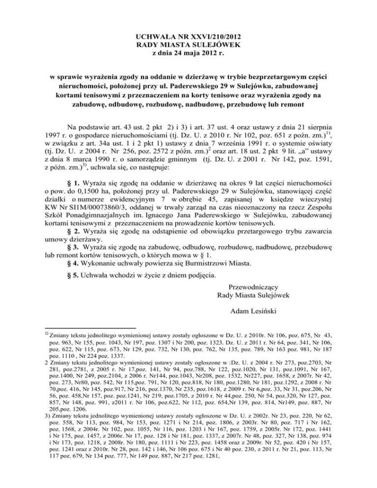 UCHWAŁA NR XXVI/210/2012 RADY MIASTA SULEJÓWEK z dnia 24 maja 2012 r. w sprawie wyrażenia zgody na oddanie w dzierżawę w trybie bezprzetargowym części nieruchomości, położonej przy ul. Paderewskiego 29 w Sulejówku, zabudowanej kortami tenisowymi z przeznaczeniem na korty tenisowe oraz wyrażenia zgody na zabudowę, odbudowę, rozbudowę, nadbudowę, przebudowę lub remont Na podstawie art. 43 ust. 2 pkt 2) i 3) i art. 37 ust. 4 oraz ustawy z dnia 21 sierpnia 1997 r. o gospodarce nieruchomościami (tj. Dz. U. z 2010 r. Nr 102, poz. 651 z poźn. zm.)1), w związku z art. 34a ust. 1 i 2 pkt 1) ustawy z dnia 7 września 1991 r. o systemie oświaty (tj. Dz. U. z 2004 r. Nr 256, poz. 2572 z późn. zm.)2 oraz art. 18 ust. 2 pkt 9 lit. „a” ustawy z dnia 8 marca 1990 r. o samorządzie gminnym (tj. Dz. U. z 2001 r. Nr 142, poz. 1591, z późn. zm.)3), uchwala się, co następuje: § 1. Wyraża się zgodę na oddanie w dzierżawę na okres 9 lat części nieruchomości o pow. do 0,1500 ha, położonej przy ul. Paderewskiego 29 w Sulejówku, stanowiącej część działki o numerze ewidencyjnym 7 w obrębie 45, zapisanej w księdze wieczystej KW Nr SI1M/00073860/3, oddanej w trwały zarząd na czas nieoznaczony na rzecz Zespołu Szkół Ponadgimnazjalnych im. Ignacego Jana Paderewskiego w Sulejówku, zabudowanej kortami tenisowymi z przeznaczeniem na prowadzenie kortów tenisowych. § 2. Wyraża się zgodę na odstąpienie od obowiązku przetargowego trybu zawarcia umowy dzierżawy. § 3. Wyraża się zgodę na zabudowę, odbudowę, rozbudowę, nadbudowę, przebudowę lub remont kortów tenisowych, o których mowa w § 1. § 4. Wykonanie uchwały powierza się Burmistrzowi Miasta. § 5. Uchwała wchodzi w życie z dniem podjęcia. Przewodniczący Rady Miasta Sulejówek Adam Lesiński 1) Zmiany tekstu jednolitego wymienionej ustawy zostały ogłoszone w Dz. U. z 2010r. Nr 106, poz. 675, Nr 43, poz. 963, Nr 155, poz. 1043, Nr 197, poz. 1307 i Nr 200, poz. 1323. Dz. U. z 2011 r. Nr 64, poz. 341, Nr 106, poz. 622, Nr 115, poz. 673, Nr 129, poz. 732, Nr 130, poz. 762, Nr 135, poz. 789, Nr 163 poz. 981, Nr 187 poz. 1110 , Nr 224 poz. 1337. 2 Zmiany tekstu jednolitego wymienionej ustawy zostały ogłoszone w :Dz. U. z 2004 r. Nr 273, poz.2703, Nr 281, poz.2781, z 2005 r. Nr 17,poz. 141, Nr 94, poz.788, Nr 122, poz.1020, Nr 131, poz.1091, Nr 167, poz.1400, Nr 249, poz.2104, z 2006 r. Nr144, poz.1043, Nr208, poz. 1532, Nr227, poz. 1658, z 2007r. Nr 42, poz. 273, Nr80, poz. 542, Nr 115,poz. 791, Nr 120, poz.818, Nr 180, poz.1280, Nr 181, poz.1292, z 2008 r. Nr 70,poz. 416, Nr 145, poz.917, Nr 216, poz.1370, Nr 235, poz.1618, z 2009 r. Nr 6,poz. 33, Nr 31, poz.206, Nr 56, poz. 458,Nr 157, poz. poz.1241, Nr 219, poz.1705, z 2010 r. Nr 44,poz. 250, Nr 54, poz.320, Nr 127, poz. 857, Nr 148, poz. 991, z2011 r. Nr 106, poz.622, Nr 112, poz. 654,Nr 139, poz. 814, Nr149, poz. 887, Nr 205,poz. 1206. 3) Zmiany tekstu jednolitego wymienionej ustawy zostały ogłoszone w Dz. U. z 2002r. Nr 23, poz. 220, Nr 62, poz. 558, Nr 113, poz. 984, Nr 153, poz. 1271 i Nr 214, poz. 1806, z 2003r. Nr 80, poz. 717 i Nr 162, poz. 1568, z 2004r. Nr 102, poz. 1055, Nr 116, poz. 1203 i Nr 167, poz. 1759, z 2005r. Nr 172, poz. 1441 i Nr 175, poz. 1457, z 2006r. Nr 17, poz. 128 i Nr 181, poz. 1337, z 2007r. Nr 48, poz. 327, Nr 138, poz. 974 i Nr 173, poz. 1218, z 2008r. Nr 180, poz. 1111 i Nr 223, poz. 1458 oraz z 2009r. Nr 52, poz. 420 i Nr 157, poz. 1241 oraz z 2010r. Nr 28, poz. 142 i 146, Nr 106 poz. 675 i Nr 40 poz. 230, z 2011 r. Nr 21, poz. 113, Nr 117 poz. 679, Nr 134 poz. 777, Nr 149 poz. 887, Nr 217 poz. 1281, UZASADNIENIE UCHWAŁY RADY MIASTA SULEJÓWEK w sprawie wyrażenia zgody na oddanie w dzierżawę w trybie bezprzetargowym części nieruchomości, położonej przy ul. Paderewskiego 29 w Sulejówku, zabudowanej kortami tenisowymi z przeznaczeniem na korty tenisowe oraz wyrażenia zgody na zabudowę, odbudowę, rozbudowę, nadbudowę, przebudowę lub remont W dniu 11.05.2012 r. wpłynął wniosek Dyrektora Zespołu Szkół Ponadgimnazjalnych im. Ignacego Jana Paderewskiego w Sulejówku z informacją o wydzierżawieniu na okres 3 miesięcy kortów tenisowych, położonych na terenie szkoły oraz wniosek o wyrażenie zgody na zawarcie kolejnej umowy dzierżawy na okres powyżej 10-u lat, z tym samym dzierżawcą. Z uzasadnienia wniosku wynika, iż szkoła nie posiada środków finansowych na racjonalne wykorzystanie kortów oraz ich utrzymanie we właściwym stanie. Dzierżawą kortów jest zainteresowana osoba fizyczna, która deklaruje przebudowę lub remont ww. obiektu, a także poza komercyjnym udostępnianiem kortów, zobowiązuje się do udostępniania terenu kortów szkole w celu organizacji zajęć sportowych. Nieruchomość oznaczona jako działka nr 7 w obrębie nr 45 została oddana w trwały zarząd Zespołowi Szkół Ponadgimnazjalnych im. Ignacego Jana Paderewskiego w Sulejówku na czas nieoznaczony. Na podstawie art. 43 ust. 2 pkt. 2) i 3) ustawy z dnia 21 sierpnia 1997 r. o gospodarce nieruchomościami jednostka organizacyjna ma prawo do zabudowy, odbudowy, rozbudowy, nadbudowy, przebudowy lub remontu obiektu budowlanego na nieruchomości, zgodnie z przepisami prawa budowlanego, za zgodą organu nadzorującego, a także oddania nieruchomości lub jej części w dzierżawę za zgodą właściwego organu i organu nadzorującego, jeżeli umowa jest zawierana na czas oznaczony dłuższy niż 3 lata lub czas nieoznaczony. Zgoda jest wymagana również w przypadku, gdy po umowie zawartej na czas oznaczony strony zawierają kolejne umowy, których przedmiotem jest ta sama nieruchomość. Na podstawie ustawy z dnia 7 września 1991 r. o systemie oświaty organem nadzorującym w zakresie prawidłowości gospodarowania powierzonym mieniem jest organ prowadzący szkołę, a w zakresie oceny stanu i warunków działalności dydaktycznej kurator oświaty. Oddanie nieruchomości w dzierżawę na czas oznaczony