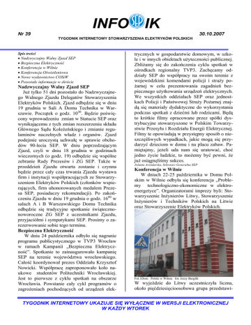 INFO IK Nr 39 30.10.2007 TYGODNIK INTERNETOWY STOWARZYSZENIA ELEKTRYKÓW POLSKICH • Spis treści • Nadzwyczajny Walny Zjazd SEP • Bezpieczna Elektryczność • Konferencja w Wilnie • Konferencja Oświetleniowa • Nowe wydawnictwo COSiW • Pozostałe informacje w skrócie Nadzwyczajny Walny Zjazd SEP Już tylko 51 dni pozostało do Nadzwyczajnego Walnego Zjazdu Delegatów Stowarzyszenia Elektryków Polskich. Zjazd odbędzie się w dniu 19 grudnia w Sali A Domu Technika w Warszawie. Początek o godz. 1030. Będzie poświęcony wprowadzeniu zmian w Statucie SEP oraz wynikającemu z tych zmian rozszerzeniu składu Głównego Sądu Koleżeńskiego i zmianie regulaminów naczelnych władz i organów. Zjazd podejmie uroczystą uchwałę w sprawie obchodów 90-lecia SEP. W dniu poprzedzającym Zjazd, czyli w dniu 18 grudnia w godzinach wieczornych (o godz. 19) odbędzie się wspólne zebranie Rady Prezesów i ZG SEP. Także w przeddzień Zjazdu otwarta zostanie i czynna będzie przez cały czas trwania Zjazdu wystawa firm i instytucji współpracujących ze Stowarzyszeniem Elektryków Polskich (członków wspierających, firm uhonorowanych medalem Prezesa SEP, posiadaczy rekomendacji). Po zakończeniu Zjazdu w dniu 19 grudnia o godz. 1600 w salach A i B Warszawskiego Domu Technika odbędzie się tradycyjne spotkanie świątecznonoworoczne ZG SEP z uczestnikami Zjazdu, przyjaciółmi i sympatykami SEP. Prosimy o zarezerwowanie sobie tego terminu. Bezpieczna Elektryczność W dniu 24 października odbyło się nagranie programu publicystycznego w TVP3 Wrocław w ramach Kampanii „Bezpieczna Elektryczność”. Spotkanie to zainaugurowało kampanię SEP na terenie województwa wrocławskiego. Całość koordynował prezes Oddziału Krzysztof Nowicki. Współpracę zaproponowało koło naukowe studentów Politechniki Wrocławskiej. Jest to pierwsze z cyklu spotkań na obszarze Wrocławia. Powstanie cały cykl programów o zagrożeniach pochodzących od urządzeń elek- trycznych w gospodarstwie domowym, w szkole i w innych obiektach użyteczności publicznej. Zbliżamy się do zakończenia cyklu spotkań w ośrodkach regionalny TVP3. Zachęcamy oddziały SEP do współpracy na swoim terenie z wojewódzkimi komendami policji i straży pożarnej w celu prezentowania zagadnień bezpiecznego użytkowania urządzeń elektrycznych. We wszystkich oddziałach SEP oraz jednostkach Policji i Państwowej Straży Pożarnej znajdą się materiały dydaktyczne do wykorzystania podczas spotkań z dziećmi lub rodzicami. Będą to krótkie filmy opracowane przez spółki dystrybucyjne stowarzyszone w Polskim Towarzystwie Przesyłu i Rozdziału Energii Elektrycznej. Filmy te opowiadają w przystępny sposób o nieszczęśliwych wypadkach, jakie mogą się przydarzyć dzieciom w domu i na placu zabaw. Pamiętajmy, jeżeli uda nam się uratować, choć jedno życie ludzkie, to możemy być pewni, że już osiągnęliśmy sukces. Jolanta Arendarska, Sekretarz Generalna SEP Konferencja w Wilnie W dniach 22-25 października w Domu Polskim w Wilnie odbyła się konferencja „Problemy technologiczno-ekonomiczne w elektroenergetyce”. Organizatorami imprezy byli: Stowarzyszenie Inżynierów Litwy, Stowarzyszenie Inżynierów i Techników Polskich na Litwie oraz Stowarzyszenie Elektryków Polskich. Fot.1Dom Polski w Wilnie fot. Jerzy Barglik W wyjeździe do Litwy uczestniczyła liczna, około pięćdziesięcioosobowa grupa przedstawi- TYGODNIK INTERNETOWY UKAZUJE SIĘ WYŁĄCZNIE W WERSJI ELEKTRONICZNEJ W KAŻDY WTOREK -2cieli SEP i polskich instytucji energetycznych z Warszawy, Ostrołęki, Suwałk, Słupska, Łodzi, Będzina, Chorzowa i wielu innych miast. Stowarzyszenie Elektryków Polskich reprezentowali: prezes Jerzy Barglik, Sekretarz Generalna Jolanta Arendarska, prezes Oddziału Suwalskiego SEP Zenon Sosnowski, przewodniczący Polskiego Komitetu Bezpieczeństwa w Elektryce SEP Bogumił Dudek. W pierwszym dniu konferencji uczestnicy odbyli spacer z przewodnikiem po starym mieście, odwiedzili Ostrą Bramę oraz muzeum Adama Mickiewicza. Cześć z nich została wydrukowana w specjalnym wydaniu Technika Wileńskiego. Autorzy z Litwy mówili o problemach bieżącej eksploatacji elektrowni atomowej w Ignalinie, o koncepcji rozwoju energetyki w krajach bałtyckich oraz o problemie składowania i unieszkodliwiania odpadów promieniotwórczych. Prezes SEP mówił o Stowarzyszeniu i o strategii rozwoju polskiej energetyki. Przewodniczący Polskiego Komitetu Bezpieczeństwa w Elektryce SEP Bogumił Dudek wygłosił referat na temat prac pod napięciem. Fot.2 Ostra Brama w wieczornej scenerii Fot.5 Referat „Prace pod napięciem w Polsce” wygłasza Bogumił Dudek fot. Jerzy Barglik fot. Jerzy Barglik W dniu 23 października w pięknej, choć nieco wychłodzonej, sali Domu Polskiego rozpoczęły się obrady konferencji. Uczestników z Polski i Litwy powitał przewodniczący Związku Inżynierów Litwy Donaldas Zanevicius. Następnie głos zabrali: prezes SEP Jerzy Barglik i przewodniczący Związku Inżynierów i Techników Polskich na Litwie Jan Andrzejewski. Prezes Elbudu Warszawa Marek Wróblewski omówił zagadnienie projektowania i budowy linii elektroenergetycznych. Leszek Kuraś z Instytutu Meteorologii i Gospodarki Wodnej mówił o wykorzystaniu energii słonecznej, a Andrzej Kukuczka szeroko zarysował kwestie niekorzystnego oddziaływania CO na organizm człowieka. Fot32 Otwarcie konferencji Od lewej: Jolanta Arendarska, Jerzy Barglik, Donaldas Zanevicius, Jan Andrzejewski, Violetta Cepanko fot. Bogumił Dudek Fot.4 Wywiad Sekretarz Generalnej SEP dla Telewizji Polonia fot. Jerzy Barglik Wystąpili także przedstawiciele Ambasady RP w Wilnie. Wygłoszono kilkanaście referatów. Przebieg konferencji był szeroko komentowany w prasie, radiu i telewizji. Ukazały się także ar- INFOSEPIK NR 39 30 października 2007 -3tykuły w polonijnym Kurierze Wileńskim redagowanym przez Wiktorię Czepenko. Trzeci d