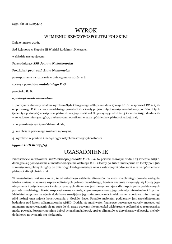 Sygn. akt III RC 254/15 WYROK W IMIENIU RZECZYPOSPOLITEJ POLSKIEJ Dnia 03 marca 2016r. Sąd Rejonowy w Słupsku III Wydział Rodzinny i Nieletnich w składzie następującym : Przewodniczący SSR Joanna Kwiatkowska Protokolant prot. sąd. Anna Nazarewicz po rozpoznaniu na rozprawie w dniu 03 marca 2016r. w S. sprawy z powództwa małoletniego F. G. przeciwko R. G. o podwyższenie alimentów 1. podwyższa alimenty ustalone wyrokiem Sądu Okręgowego w Słupsku z dnia 27 maja 2010r. w sprawie I RC 242/10 od pozwanego R. G. na rzecz małoletniego powoda F. G. z kwoty po 700 złotych miesięcznie do kwoty po 1000 złotych (jeden tysiąc złotych) miesięcznie, płatne do rąk jego matki – J. S., poczynając od dnia 13 kwietnia 2015r. do dnia 10 – go każdego miesiąca z góry, z ustawowymi odsetkami w razie opóźnienia w płatności każdej z rat; 2. w pozostałej części powództwo oddala; 3. nie obciąża pozwanego kosztami sądowymi; 4. wyrokowi w punkcie 1. nadaje rygor natychmiastowej wykonalności. Sygn. akt III RC 254/15 UZASADNIENIE Przedstawicielka ustawowa małoletniego powoda F. G. – J. S. pozwem złożonym w dniu 13 kwietnia 2015 r. domagała się podwyższenia alimentów od ojca małoletniego R. G. z kwoty po 700 zł miesięcznie do kwoty po 1.500 zł miesięcznie, płatnych z góry do dnia 10-go każdego miesiąca wraz z ustawowymi odsetkami w razie opóźnienia w płatności którejkolwiek z rat. W uzasadnieniu wskazała m.in., że od ostatniego ustalenia alimentów na rzecz małoletniego powoda nastąpiła istotna zmiana w zakresie usprawiedliwionych potrzeb małoletniego, bowiem znacznie zwiększyły się koszty jego utrzymania i dotychczasowa kwota przyznanych alimentów jest niewystarczająca dla zaspokojenia podstawowych potrzeb małoletniego. Powód rozpoczął naukę w szkole, a tym samym wzrosły jego potrzeby intelektualne i fizyczne. Małoletni uczęszcza na zajęcia dodatkowe rozwijające jego zainteresowania intelektualne i sportowe. min. treningi piłki nożnej oraz zajęcia konstruowania z klocków Lego. Ponadto małoletni poddawany jest specjalistycznym badaniom pod kątem zdiagnozowania ADHD. Dodała, że możliwości finansowe pozwanego wzrosły znacząco od momentu przeprowadzenia się na stałe do N., czego pozwany nie omieszkał wielokrotnie podkreślać w rozmowach z matką powoda. Pozwany, pomimo dobrej sytuacji majątkowej, oprócz alimentów w dotychczasowej kwocie, nie łoży dodatkowo na syna, nic mu nie kupuje. Pozwany R. G. , działający przez pełnomocnika – adwokata K. K. , w odpowiedzi na pozew wniósł o oddalenie powództwa w całości oraz o obciążenie powoda kosztami procesu, w tym zastępstwa procesowego, co uzasadnił tym, że nie doszło do takiej zmiany stosunków, która uzasadniałaby zmianę zakresu obowiązku alimentacyjnego. Stwierdził, że sytuacja finansowa pozwanego nie uległa polepszeniu. Podał, że pozwany zmienił miejsce zamieszkania, przeprowadził się za granicę, jednakże w żaden sposób nie świadczy to o tym, że jego sytuacja materialna uległa znacznej poprawie. Wskazał, że R. G. zatrudniony jest w firmie (...) z siedzibą w A. K. w N., z wynagrodzeniem w wysokości 1.760 euro miesięcznie. Żona pozwanego - S. G. zatrudniona jest w firmie (...). zoo w N. z wynagrodzeniem w wysokości 1.770 euro miesięcznie. Podkreślił, że pozwany oprócz powoda ma na utrzymaniu małoletniego syna M. G., który uczęszcza do przedszkola, gdzie opłata miesięczna wynosi 85 euro. Podał, że pozwany wraz z żoną wynajmują lokal mieszkalny, ponosząc koszt utrzymania mieszkania wraz z dodatkowymi opłatami w wysokości 912 euro miesięcznie. Zaznaczył, iż sytuacja majątkowa pozwanego nie pozwala na uiszczanie alimentów w kwocie wyższej niż dotychczasowa. (k. 19-22) Ostatecznie na rozprawie w dniu 03 marca 2016 r. strony podtrzymały swoje dotychczasowe stanowisko. (k. 177) Sąd ustalił następujący stan faktyczny: Małoletni F. G., urodzony (...) w L., pochodzi ze związku małżeńskiego J. G. z domu S. i R. G., rozwiązanego przez rozwód wyrokiem Sądu Okręgowego w Słupsku z dnia 27 maja 2010 r. w sprawie IRC 242/10. W wyroku tym wykonywanie władzy rodzicielskiej nad małoletnim F. G. powierzono jego matce, ograniczając ojcu wykonywanie tej władzy do współdecydowania o jego istotnych sprawach. Nadto zobowiązano oboje rodziców do ponoszenia kosztów utrzymania i wychowania małoletniego F. G. i zasądzono od R. G. na rzecz małoletniego F. G. alimenty w kwocie po 700 zł miesięcznie, płatne do rak jego matki do 10-go każdego miesiąca z góry, z ustawowymi odsetkami w razie opóźnienia w płatności każdej z rat, poczynając od uprawomocnienia się wyroku. Orzeczenie jest prawomocne od dnia 18 czerwca 2010 r. Małoletni F. G. w dacie orzekania rozwodu miał niespełna 3 lata. Był zdrowy. Pozostawał pod bezpośrednią opieką swojej matki. W czasie kiedy jego matka pracowała, małoletnim zajmowała się opiekunka. Koszt opiekunki wynosił 600 - 700 zł miesięcznie. J. G. miała wówczas 33 lata. Była zdrowa. Poza małoletnim nie miała innych dzieci na utrzymaniu. Była związana z mężczyzną, z którym planowała przyszłość. Pracowała w Zespole Szkół Ogólnokształcących nr (...) w S. jako nauczyciel języka angielskiego i zarabiała wraz z nadgodzinami ok. 2.000 zł netto miesięcznie. Dodatkowo dorabiała jako nauczyciel języka angielskiego, udzielając korepetycji. Z tego tytułu uzyskiwała dochód w wysokości od 600 do 800 zł miesięcznie. Wspierali ją także finansowo rodzice. Mieszkała wraz z małoletnim w mieszkaniu własnościowym o powierzchni 47 m2 w S.. Koszt utrzymania mieszkania wynosił: czynsz- 350 zł miesięcznie, energia- 120 zł miesięcznie, telewizja, internet, telefon- 150 zł miesięcznie. Dodatkowo spłacała raty kredytu hipotecznego w wysokości 650 zł miesięcznie. R. G., z zawodu technik obsługi turystycznej, miał wtedy 31 lat. Był zdrow