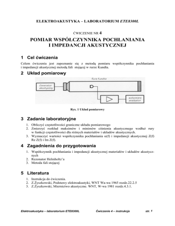 ELEKTROAKUSTYKA – LABORATORIUM ETE8300L ĆWICZENIE NR 4 POMIAR WSPÓŁCZYNNIKA POCHŁANIANIA I IMPEDANCJI AKUSTYCZNEJ 1 Cel ćwiczenia Celem ćwiczenia jest zapoznanie się z metodą pomiaru współczynnika pochłaniania i impedancji akustycznej metodą fali stojącej w rurze Kundta. 2 Układ pomiarowy Rys. 1 Układ pomiarowy 3 Zadanie laboratoryjne 1. Obliczyć częstotliwości graniczne układu pomiarowego 2. Zmierzyć rozkład maksimów i minimów ciśnienia akustycznego wzdłuż rury w funkcji częstotliwości dla różnych materiałów i układów akustycznych. 3. Wyznaczyć wartości współczynnika pochłaniania α(f) i impedancji akustycznej Z(f) Re Z(f) i Im Z(f). 4 Zagadnienia do przygotowania 1. Współczynnik pochłaniania i impedancji akustycznej materiałów i układów akustycznych 2. Rezonator Helmholtz’a 3. Metoda fali stojącej 5 Literatura 1. Instrukcja do ćwiczenia. 2. Z.Żyszkowski, Podstawy elektroakustyki, WNT Wa-wa 1965 rozdz.22.2.5 3. Z.Żyszkowski, Miernictwo akustyczne. WNT, W-wa 1981 rozdz.4.3.1. Elektroakustyka – laboratorium ETE8300L Ćwiczenie 4 – instrukcja str. 1 6 Dźwięk i fale dźwiękowe - teoria Dźwiękiem nazywamy zaburzenie falowe środowiska sprężystego, jakim jest najczęściej powietrze, objawiające się drganiami cząstek tego środowiska i wytwarzające wrażenie słuchowe u człowieka o normalnym słuchu. Dźwiękiem nazywa się również samo wrażenie słuchowe wytworzone drganiami akustycznymi. Drgania cząsteczek powietrza powodują powstawanie zagęszczeń i rozrzedzeń ośrodka. Źródła Pobudzanie do drgań cząstek powietrza może nastąpić przez drgania membran, płyt, prętów i strun, jak również przez dławienie przepływu powietrza przez otwory. Podstawowe dźwięki to mowa i muzyka. Dźwięki niepożądane nazywa się hałasem. Drgania cząstek powietrza wywołujące dźwięk są na ogół bardzo złożone. Pojawiają się i znikają w czasie a więc są funkcją czasu x(t). Najprostszy przebieg drgań, wywołujący dźwięk, ma kształt sinusoidalny (rys.1) i wyraża się wzorem: A(t) = A0 sin(ωt) przy czym: A0 - amplituda drgań;ω -pulsacja (ω = 2π f), f -częstotliwość drgań. Rys. 2 Zagęszczenia i rozrzedzenia podłużnej fali płaskiej. a) zmiany ciśnienia akustycznego fali sinusoidalnej (tonu), b) rozchodzenie się fali płaskiej w kanale. Dźwięk o takim przebiegu nazywa się tonem. Każdy ton można określić dwiema wartościami: wartością maksymalną (szczytową) amplitudy drgań i częstotliwością. Znajomość tych wartości wystarcza do wykreślenia przebiegu czasowego drgań odpowiadających danemu tonowi. Elektroakustyka – laboratorium ETE8300L Ćwiczenie 4 – instrukcja str. 2 Oprócz wartości szczytowej posługujemy się zwykle wartością skuteczną amplitudy przebiegu A(t). Wartość skuteczną dowolnego przebiegu Ask(t) (oznaczaną często przez ARMS) określa się wzorem: T ARMS 1 = A 2 (t )dt ∫ T 0 Rys. 3 Relacje między wartością skuteczną (Arms),maksymalną (A0 = Apeak), międzyszczytową (Apeak-peak) dla sygnału sinusoidalnego Dla przebiegów sinusoidalnych między wartością skuteczną a wartością szczytową występuje zależność: ARMS 1 = = 0.71 A0 2 Dla dowolnych przebiegów złożonych stosunek wartości ARMS/A0 , w zależności od kształtu przebiegu może mieć inną wartość, ale nie będzie większy od 1. Drgania cząstek powietrza rozprzestrzeniają się w ten sposób, że jedna cząstka ośrodka pobudza do drgań cząstkę sąsiednią i tak łańcuchowo dalej. W ten sposób powstaje fala dźwiękowa, którą stanowią następujące po sobie zagęszczenia i rozrzedzenia cząstek ośrodka (rys.1b). W zależności od sposobu wzbudzenia ośrodka do drgań rozróżniamy: falę płaską wytwarzaną przez dużą płaską powierzchnię drgającą; falę cylindryczną wytwarzaną przez drgającą powierzchnię cylindryczną i falę kulistą gdy źródło drgań ma bardzo małe rozmiary (tzw. punktowe źródło dźwięku) lub jest pulsującą kulą. W dużej odległości od źródła dźwięku fala cylindryczna i kulista może być traktowana jako lokalnie płaska. W zależności od kierunku drgań cząstek w odniesieniu do kierunku rozchodzenia się fali rozróżniamy fale podłużne i fale poprzeczne. Fale podłużne występują wówczas, gdy kierunek drgań cząstek pokrywa się z kierunkiem rozchodzenia się fali. Fale dźwiękowe w gazach, cieczach i ciałach stałych są falami podłużnymi. Fale poprzeczne występują wówczas, gdy drgania cząstek są prostopadłe do kierunku rozchodzenia się fali (drgania strun, sprężyn, płyt i folii). Elektroakustyka – laboratorium ETE8300L Ćwiczenie 4 – instrukcja str. 3 Wielkościami obiektywnymi charakteryzującymi falę dźwiękową są: • • • • • • • prędkość rozchodzenia się fali dźwiękowej; częstotliwość drgań cząstek ośrodka; długość fali dźwiękowej; prędkość akustyczna; ciśnienie akustyczne; natężenie dźwięku; moc akustyczna. Prędkość rozchodzenia się fali dźwiękowej - prędkość dźwięku ( c ) określa się długością drogi, którą przebiega zaburzenie równowagi ośrodka w ciągu jednej sekundy. Prędkość rozchodzenia się dźwięku zależy od właściwości ośrodka, w którym dźwięk się rozchodzi. W gazach prędkość dźwięku c można zapisać za pomocą wzoru: c= Psκ ρ0 gdzie: Ps - ciśnienie statyczne (atmosferyczne) [Pa]; κ - stosunek ciepła właściwego przy stałym ciśnieniu do ciepła właściwego przy stałej objętości (κ = cp / cv ) - dla powietrza, κ = 1.4; ρo- średnia gęstość gazu [kg/m3]. Można przyjąć, że średnia prędkość dźwięku w powietrzu wynosi 340 [m/s] w temperaturze ok. 20 [oC] przy normalnym ciśnieniu atmosferycznym 760 (mmHg). W cieczach prędkość dźwięku wynosi ok. 1500 m/s. W ciałach stałych, takich jak cegła, drewno, metale, szkło, prędkość dźwięku jest dużo większa. Wynosi o