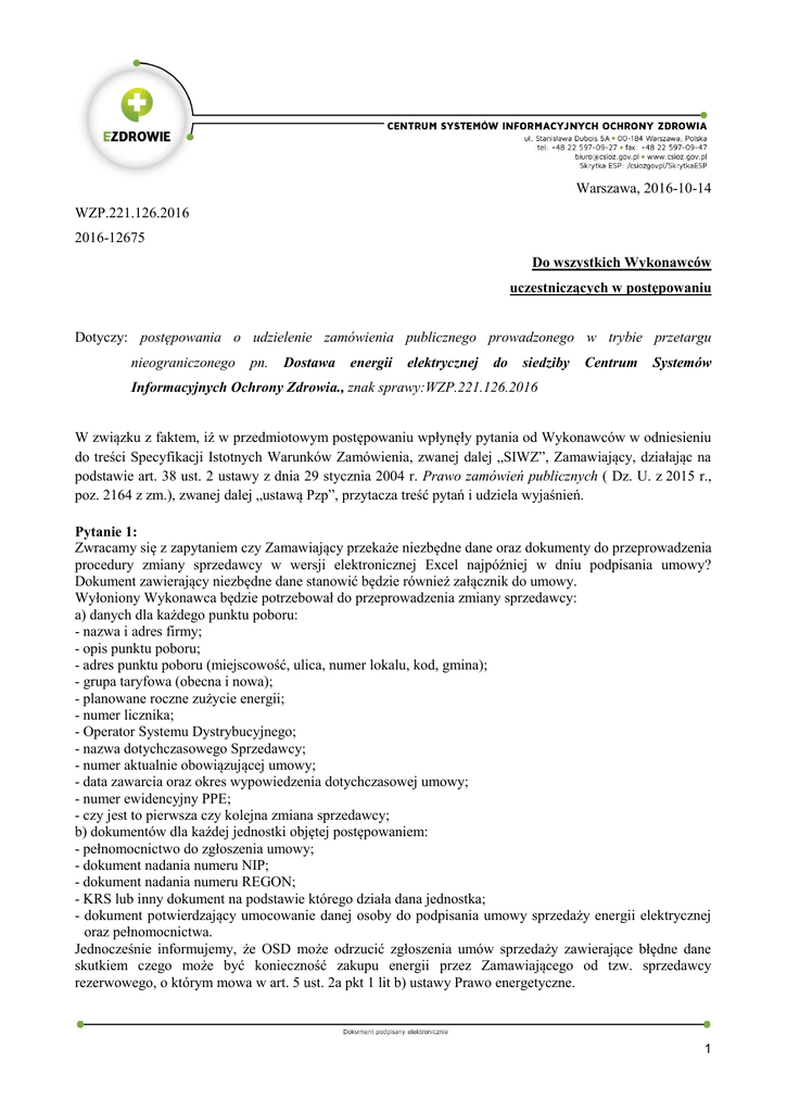 Warszawa, 2016-10-14 WZP.221.126.2016 2016-12675 Do wszystkich Wykonawców uczestniczących w postępowaniu Dotyczy: postępowania o udzielenie zamówienia publicznego prowadzonego w trybie przetargu nieograniczonego pn. Dostawa energii elektrycznej do siedziby Centrum Systemów Informacyjnych Ochrony Zdrowia., znak sprawy:WZP.221.126.2016 W związku z faktem, iż w przedmiotowym postępowaniu wpłynęły pytania od Wykonawców w odniesieniu do treści Specyfikacji Istotnych Warunków Zamówienia, zwanej dalej „SIWZ”, Zamawiający, działając na podstawie art. 38 ust. 2 ustawy z dnia 29 stycznia 2004 r. Prawo zamówień publicznych ( Dz. U. z 2015 r., poz. 2164 z zm.), zwanej dalej „ustawą Pzp”, przytacza treść pytań i udziela wyjaśnień. Pytanie 1: Zwracamy się z zapytaniem czy Zamawiający przekaże niezbędne dane oraz dokumenty do przeprowadzenia procedury zmiany sprzedawcy w wersji elektronicznej Excel najpóźniej w dniu podpisania umowy? Dokument zawierający niezbędne dane stanowić będzie również załącznik do umowy. Wyłoniony Wykonawca będzie potrzebował do przeprowadzenia zmiany sprzedawcy: a) danych dla każdego punktu poboru: - nazwa i adres firmy; - opis punktu poboru; - adres punktu poboru (miejscowość, ulica, numer lokalu, kod, gmina); - grupa taryfowa (obecna i nowa); - planowane roczne zużycie energii; - numer licznika; - Operator Systemu Dystrybucyjnego; - nazwa dotychczasowego Sprzedawcy; - numer aktualnie obowiązującej umowy; - data zawarcia oraz okres wypowiedzenia dotychczasowej umowy; - numer ewidencyjny PPE; - czy jest to pierwsza czy kolejna zmiana sprzedawcy; b) dokumentów dla każdej jednostki objętej postępowaniem: - pełnomocnictwo do zgłoszenia umowy; - dokument nadania numeru NIP; - dokument nadania numeru REGON; - KRS lub inny dokument na podstawie którego działa dana jednostka; - dokument potwierdzający umocowanie danej osoby do podpisania umowy sprzedaży energii elektrycznej oraz pełnomocnictwa. Jednocześnie informujemy, że OSD może odrzucić zgłoszenia umów sprzedaży zawierające błędne dane skutkiem czego może być konieczność zakupu energii przez Zamawiającego od tzw. sprzedawcy rezerwowego, o którym mowa w art. 5 ust. 2a pkt 1 lit b) ustawy Prawo energetyczne. 1 Odpowiedź: Zamawiający przekaże niezbędne dane i dokumenty do przeprowadzenia procedury zmiany sprzedawcy w wersji elektronicznej Excel najpóźniej w dniu podpisania umowy. Pytanie 2: Czy Zamawiający udzieli Wykonawcy stosownego pełnomocnictwa do zgłoszenia w imieniu Zamawiającego zawartej umowy sprzedaży energii elektrycznej do OSD oraz wykonania czynności niezbędnych do przeprowadzenia procesu zmiany sprzedawcy u OSD wg wzoru stosowanego powszechnie przez Wykonawcę ? W przypadku braku zgody na powyższe prosimy o wyjaśnienie czy Zamawiający ponosił będzie odpowiedzialność za treść przedstawionego wzoru pełnomocnictwa i za jego ewentualne zakwestionowanie przez OSD? Odpowiedź: Zamawiający udzieli Wykonawcy stosownego pełnomocnictwa do zgłoszenia w imieniu Zamawiającego zawartej umowy sprzedaży energii elektrycznej do OSD oraz wykonania czynności niezbędnych do przeprowadzenia procesu zmiany sprzedawcy u OSD. Pytanie3: W Rozdziale IV SIWZ w Formularzu ofertowym oraz w Załączniku nr 2 do SIWZ w § 2 ust. 7 Informujemy, że zgodnie z zapisami Instrukcji Ruchu i Eksploatacji Sieci Dystrybucyjnej (IRiESD) poszczególnych OSD, zatwierdzonych przez Prezesa URE, do rozpoczęcia sprzedaży energii elektrycznej konieczne jest zgłoszenie umowy do OSD, przeprowadzenie procesu zmiany sprzedawcy oraz przyjęcie umowy do realizacji przez OSD.. Z uwagi na powyższe zwracamy się z uprzejmą prośbą o modyfikację § 2 ust. 7 do treści: „Sprzedaż energii elektrycznej odbywać się będzie przez okres 12 miesięcy począwszy od dnia 2016.12.01 r. od godz. 00:00 jednak nie wcześniej niż po skutecznym przeprowadzeniu procesu zmiany sprzedawcy u OSD oraz przyjęciu umowy do realizacji przez OSD do dnia 30.11.2017 r do godz. 24:00 lub do wyczerpania kwoty maksymalnego wynagrodzenia brutto określonego w § 6 ust. 1 w zależności od tego które ze zdarzeń nastąpi wcześniej.” Prosimy o uwzględnienie powyższej zmiany w dalszych postanowieniach SIWZ. Odpowiedź: Zamawiający podtrzymuje zapisy w SIWZ w przedmiotowym zakresie. Pytanie 4: W Rozdziale IV SIWZ w Załączniku nr 2 do SIWZ w § 2 ust. 7 Informujemy, iż z uwagi na konieczność zawarcia umowy w terminach określonych w art. 94 ustawy Prawo zamówień publicznych, a następnie na konieczność przeprowadzenia procedury zmiany sprzedawcy trwającej - zgodnie z dyspozycją art. 4j ust. 6 ustawy Prawo energetyczne - 21 dni, termin rozpoczęcia sprzedaży energii elektrycznej od dnia 01.12.2016 może nie być możliwy do spełnienia przez Wykonawcę. Mając na uwadze powyższe zwracamy się z uprzejmą prośbą o rozważenie zmiany terminu rozpoczęcia dostaw. Odpowiedź: Zamawiający podtrzymuje zapisy w SIWZ w przedmiotowym zakresie. 2 Pytanie 5: SIWZ Rozdział XII W związku z tym że standardowo w postępowaniach przetargowych na dostawę energii elektrycznej Wykonawcy składając ofertę przedstawiają ceny jednostkowe z dokładności do czterech miejsc po przecinku Wykonawca zwraca się z prośbą o możliwość podania ceny jednostkowej netto i brutto za kWh z dokładnością do 4 miejsc po przecinku. Odpowiedź: Zamawiający nie dopuszcza aby cena 1kWh netto w zł była wyrażona z dokładnością do 4 miejsc po przecinku. Pytanie 6: Proszę o informację kto jest Operatorem Systemu dystrybucyjnego punktów poboru objętych postępowaniem przetargowym oraz czy to pierwsza czy kolejna zmiana sprzedawcy. Czy obecne umowy na sprzedaż energii elektrycznej kończą się same czy trzeba je wypowiadać? Odpowiedź: Operatorem Systemu dystrybucyjnego jest Innogy Stoen Operator Sp. z o.o. Jest to pierwsza zmiana sprzedawcy. Termin obowiązywania obecnej umowy na s