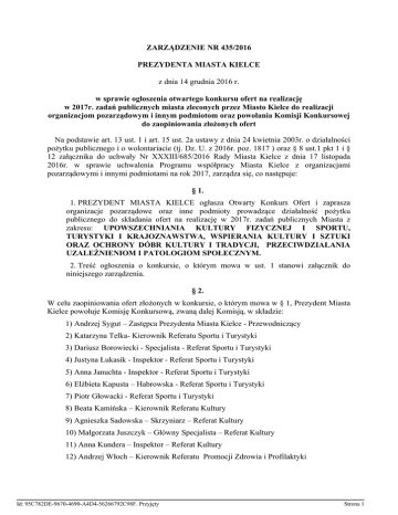 ZARZĄDZENIE NR 435/2016 PREZYDENTA MIASTA KIELCE z dnia 14 grudnia 2016 r. w sprawie ogłoszenia otwartego konkursu ofert na realizację w 2017r. zadań publicznych miasta zleconych przez Miasto Kielce do realizacji organizacjom pozarządowym i innym podmiotom oraz powołania Komisji Konkursowej do zaopiniowania złożonych ofert Na podstawie art. 13 ust. 1 i art. 15 ust. 2a ustawy z dnia 24 kwietnia 2003r. o działalności pożytku publicznego i o wolontariacie (tj. Dz. U. z 2016r. poz. 1817 ) oraz § 8 ust.1 pkt 1 i § 12 załącznika do uchwały Nr XXXIII/685/2016 Rady Miasta Kielce z dnia 17 listopada 2016r. w sprawie uchwalenia Programu współpracy Miasta Kielce z organizacjami pozarządowymi i innymi podmiotami na rok 2017, zarządza się, co następuje: § 1. 1. PREZYDENT MIASTA KIELCE ogłasza Otwarty Konkurs Ofert i zaprasza organizacje pozarządowe oraz inne podmioty prowadzące działalność pożytku publicznego do składania ofert na realizację w 2017r. zadań publicznych Miasta z zakresu: UPOWSZECHNIANIA KULTURY FIZYCZNEJ I SPORTU, TURYSTYKI I KRAJOZNAWSTWA, WSPIERANIA KULTURY I SZTUKI ORAZ OCHRONY DÓBR KULTURY I TRADYCJI, PRZECIWDZIAŁANIA UZALEŻNIENIOM I PATOLOGIOM SPOŁECZNYM. 2. Treść ogłoszenia o konkursie, o którym mowa w ust. 1 stanowi załącznik do niniejszego zarządzenia. § 2. W celu zaopiniowania ofert złożonych w konkursie, o którym mowa w § 1, Prezydent Miasta Kielce powołuje Komisję Konkursową, zwaną dalej Komisją, w składzie: 1) Andrzej Sygut – Zastępca Prezydenta Miasta Kielce - Przewodniczący 2) Katarzyna Telka- Kierownik Referatu Sportu i Turystyki 3) Dariusz Borowiecki - Specjalista - Referat Sportu i Turystyki 4) Justyna Łukasik - Inspektor - Referat Sportu i Turystyki 5) Anna Januchta - Inspektor - Referat Sportu i Turystyki 6) Elżbieta Kapusta – Habrowska - Referat Sportu i Turystyki 7) Piotr Głowacki - Referat Sportu i Turystyki 8) Beata Kamińska – Kierownik Referatu Kultury 9) Agnieszka Sadowska – Skrzyniarz – Referat Kultury 10) Małgorzata Juszczyk – Główny Specjalista – Referat Kultury 11) Anna Kundera – Inspektor – Referat Kultury 12) Andrzej Włoch – Kierownik Referatu Promocji Zdrowia i Profilaktyki Id: 95C782DE-9670-4690-A4D4-56266792C98F. Przyjęty Strona 1 13) Iwona Czech – Inspektor - Inspektor -Referat Promocji Zdrowia i Profilaktyki 14) Małgorzata Lachowska - Inspektor - Referat Promocji Zdrowia i Profilaktyki 15) Milena Ziomkiewicz - Referat Promocji Zdrowia i Profilaktyki 16) Anna Dusza- Ciechanowska – Główny Specjalista - Referat Promocji Zdrowia i Profilaktyki 17) Agnieszka Nowak – Opuchlik - Inspektor - Referat Promocji Zdrowia i Profilaktyki § 3. Wykonanie zarządzenia powierza się dyrektorom wydziałów: Edukacji, Profilaktyki i Pożytku Publicznego oraz Kultury i Promocji Miasta. § 4. Zarządzenie wchodzi w życie z dniem podpisania. Prezydent Miasta Kielce Wojciech Lubawski Id: 95C782DE-9670-4690-A4D4-56266792C98F. Przyjęty Strona 2 Załącznik do Zarządzenia Nr 435/2016 Prezydenta Miasta Kielce z dnia 14 grudnia 2016 r. § 1. Prezydent Miasta Kielce ogłasza otwarty konkurs ofert na zlecenie realizacji w 2017r. zadań publicznych w następujących zakresach: 1. UPOWSZECHNIANIA KULTURY FIZYCZNEJ I SPORTU 1)Zadania zlecone do realizacji w formie powierzenia: Lp. Nazwa zadania i warunki realizacji I. Prowadzenie działalności z zakresu upowszechniania kultury fizycznej w formie ośrodka, na rzecz poprawy bezpieczeństwa imprez sportowych w Mieście w ramach projektu „Kibice Razem” poprzez działania edukacyjno-informacyjne oraz zwalczanie negatywnych zjawisk w sporcie. Realizacja zadania polegać będzie, w szczególności na: 1/aktywizacji kibiców piłki nożnej w kierunku działania na rzecz środowiska lokalnego, 2/upowszechnianiu sportu jako formy spędzania czasu wolnego oraz rozwijania zachowań prospołecznych poprzez organizację: a) turniejów sportowo-rekreacyjnych dla dzieci i młodzieży, b) festynu dla mieszkańców Kielc, c) cyklu spotkań z dziećmi i młodzieżą szkolną zachęcającego do aktywnego spędzania czasu wolnego, 3/ upowszechnianiu rodzinnego uczestnictwa w sporcie i kibicowaniu; 4/upowszechnianiu mechanizmów współpracy z klubami sportowymi, władzami miejskimi, szkołami, lokalnymi organizacjami pozarządowymi, 5/stworzeniu koła niepełnosprawnych sympatyków kibiców piłkarskich, 6/wydanie biuletynu kibiców promującego oraz informującego o Id: 95C782DE-9670-4690-A4D4-56266792C98F. Przyjęty Wysokość środków publicznych przeznaczona na realizację zadania tego samego rodzaju w roku 2016 (w zł) Wysokość środków publicznych przeznaczona na realizację zadania tego samego rodzaju w roku 2017 (w zł) Wysokość środków publicznych przeznaczona na realizację zadania objętego konkursem (w zł) 60.000 0 60.000 Termin realizacji zadania styczeń grudzień 2017 r. Strona 1 inicjatywach ośrodka. Warunek dodatkowy: Posiadanie odpowiedniej bazy lokalowej pomieszczenia typu świetlica, pomieszczenia biurowe, magazyn. Ogółem: 60.000 0 60.000 2)Zadania zlecone do realizacji w formie wspierania: Lp. Nazwa zadania i warunki realizacji I. 1. 2. 3. 4. Szkolenie sportowe, w sportach indywidualnych i zespołowych dla grup treningowych biorących udział w współzawodnictwie sportowym dzieci i młodzieży, w ramach „Systemu Sportu Młodzieżowego” /organizowanego przez: - Zespół Sportu Młodzieżowego Instytutu Sportu, - Związki Sportowe /. Zakres szkolenia w czterech kategoriach wiekowych: - młodzik, - junior młodszy, - junior, - młodzieżowiec, obejmuje: 1/ wynajem specjalistycznych obiektów sportowych do prowadzenia zajęć treningowych i rozgrywania zawodów sportowych, 2/ udział w zawodach organizowanych przez poszczególne związki sportowe i komitety organizacyjne, 3/ udział w obozach sportowo szkoleniowych i turniejach kontrolnych /miejskich, wojewódzkich, ogólnopolskich i międzynarodowych/, 4/ zakup niezbę