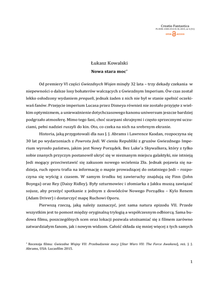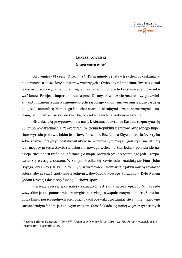 Creatio Fantastica PL ISSN: 2300-2514 R. XI, 2015, nr 4 (51) Łukasz Kowalski Nowa stara moc Od premiery VI części Gwiezdnych Wojen minęły 32 lata – trzy dekady czekania w niepewności o dalsze losy bohaterów walczących z Gwiezdnym Imperium. Ów czas został lekko osłodzony wydaniem prequeli, jednak żaden z nich nie był w stanie spełnić oczekiwań fanów. Przejęcie imperium Lucasa przez Disneya również nie zostało przyjęte z wielkim optymizmem, a unieważnienie dotychczasowego kanonu uniwersum jeszcze bardziej podgrzało atmosferę. Mimo tego fani, choć szarpani skrajnymi i często sprzecznymi uczuciami, pełni nadziei ruszyli do kin. Oto, co czeka na nich na srebrnym ekranie. Historia, jaką przygotowali dla nas J. J. Abrams i Lawrence Kasdan, rozpoczyna się 30 lat po wydarzeniach z Powrotu Jedi. W cieniu Republiki z gruzów Gwiezdnego Imperium wyrosło państwo, jakim jest Nowy Porządek. Bez Luke'a Skywalkera, który z tylko sobie znanych przyczyn postanowił ukryć się w nieznanym miejscu galaktyki, nie istnieją Jedi mogący przeciwstawić się zakusom nowego wcielenia Zła. Jednak pojawia się nadzieja, ruch oporu trafia na informację o mapie prowadzącej do ostatniego Jedi – rozpoczyna się wyścig z czasem. W samym środku tej zawieruchy znajdują się Finn (John Boyega) oraz Rey (Daisy Ridley). Były szturmowiec i złomiarka z Jakku muszą zawiązać sojusz, aby przeżyć spotkanie z jednym z dowódców Nowego Porządku – Kylo Renem (Adam Driver) i dostarczyć mapę Ruchowi Oporu. Pierwszą rzeczą, jaką należy zaznaczyć, jest sama natura epizodu VII. Przede wszystkim jest to pomost między oryginalną trylogią a współczesnym odbiorcą. Sama budowa filmu, poszczególnych scen oraz lokacji pozwala utożsamiać się z filmem zarówno zatwardziałym fanom, jak i nowym widzom. Całość składa się mniej więcej z tych samych Recenzja filmu: Gwiezdne Wojny VII: Przebudzenie mocy [Star Wars VII: The Force Awakens], reż. J. J. Abrams, USA: Lucasfilm 2015. 1 modułów i schematów jak Nowa Nadzieja. W równym stopniu jest to reboot serii, co kontynuacja wcześniejszych wątków. To równocześnie wielka siła, jak i minus nowej odsłony. Oczywiście takie podejście do tematu mocno rzutuje na budowę scenariusza, który wywołuje zarówno łezkę nostalgii, jak i lekką irytację o nazwie „już to gdzieś widziałem”. Kolejne wydarzenia przedstawione na ekranie nie zaskoczą nikogo, może poza najmłodszą widownią. Nie licząc pomniejszych rzeczy, całość pędzi w zawrotnym tempie w raz obranym kierunku i nawet nie próbuje udawać, że jest inaczej. Dotyczy to jednak tylko głównych wątków. Historia zostawia wiele pytań, na których odpowiedzi będziemy musieli poczekać do następnych części. Pod tym względem również niewiele różni się to od tego, jak George Lucas dawkował widzom wiedzę o swoim uniwersum. Scenarzystom nie udało się również uniknąć kilku nielogicznych posunięć i wciskania pojedynczych wydarzeń tylko dlatego, że miało się to tak stać, choć teoretycznie nie powinno. Jednym z głównych przykładów takich posunięć jest sam Finn i jego nagłe wyzwolenie się spod indoktrynacji Nowego Porządku, do którego nie było praktycznie żadnej logicznej przesłanki. Jakby na to nie spojrzeć, zaskakująca historia nie była celem twórców. Przebudzenie mocy miało przede wszystkim przedstawić nowych bohaterów, osadzić ich w znanym i rozpoznawanym przez fanów otoczeniu oraz pozwolić im przejąć pałeczkę od starej ekipy. Jest to element, który działa dokładnie tak, jak sobie zamierzyli filmowcy. Kreacja bohaterów jest zadziwiająco dobra i realistyczna. Dotyczy to praktycznie wszystkich nowych członków obsady. Przed premierą największe obawy dotyczyły oczywiście Kylo Rena, muszącego mierzyć się z cieniem samego Lorda Vadera. Na szczęście okazały się bezpodstawne. O ile można kłócić się, czy aparycja Adama Drivera jest odpowiednia do tej roli, o tyle młody rycerz ciemnej strony mocy w żadnej mierze nie jest jednowymiarowy, dając aktorowi duże pole do popisu w dalszej perspektywie czasu. Wiodącą postacią jest jednak Rey, która podbiła chyba serca wszystkich fanów. Daisy Ridley tchnęła w swoją postać tyle życia i emocji, że niemożliwym jest powiedzenie o niej złego słowa. Należy jednak nadmienić, że ani Ren, ani Rey nie są jeszcze w pełni uformowanymi bytami. Każda z nowych postaci stawia dopiero pierwsze kroki na drodze ku potędze i chwale, przez co nie mogą być aż tak wyraziste, jak niektórzy by oczekiwali. Kilka dodatkowych słów należy się nowemu członkowi rodziny droidów. BB-8, będący spadkobiercą R2-D2 (i jak niektórzy twierdzą, jego nieślubny dzieckiem z Gwiazdą 2 Śmierci) ma tendencję do skradania show pozostałym aktorom. Ten uroczy malec wywołuje uśmiech na twarzy już od pierwszych sekund, gdy pojawia się na ekranie. Jego asortyment gadżetów oraz pomysłowego wykorzystania każdego z nich jest źródłem całkiem sporej ilości salw śmiechu w sali kinowej. To zadziwiające, jak ktoś porozumiewający się jedynie różnego rodzaju „bipnięciami” może być obdarzony aż taką ekspresją. Nie tylko BB-8 był źródłem śmiechu, jaki przelewał się falą po widowni. Całość filmu upstrzona jest różnego rodzaju gagami, ciętymi ripostami oraz zgrabnymi podsumowaniami obecnych lub nadchodzących wydarzeń. Momentami można nawet odnieść wrażenie, że jest ich zbyt dużo jak na Gwiezdne Wojny. Z drugiej strony to najbrutalniejszy ze wszystkich dotychczasowych epizodów i pomimo zaszeregowania filmu jako PG-13 ilość trupów jest zaiste wielka. Należy wziąć to pod uwagę, jeśli chce się zabrać na seans młodszych widzów. Tak dobre wieści dla zakładów pogrzebowych różnych planet są konsekwencją ilości scen akcji, bitew, pojedynków i nade wszystko ich rozmachu. Ogrom wpompowanych w ten obraz pieniędz