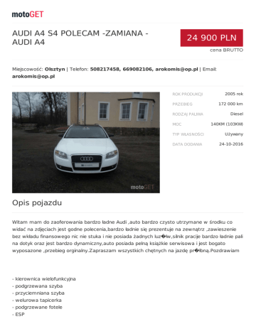 AUDI A4 S4 POLECAM -ZAMIANA AUDI A4 24 900 PLN cena BRUTTO Miejscowość: Olsztyn | Telefon: 508217458, 669082106, [email protected] | Email: [email protected] 2005 rok 172 000 km Diesel 140KM (103KW) Używany 24-10-2016 Opis pojazdu Witam mam do zaoferowania bardzo ładne Audi ,auto bardzo czysto utrzymane w środku co widać na zdjęciach jest godne polecenia,bardzo ładnie się prezentuje na zewnątrz ,zawieszenie bez wkładu finansowego nic nie stuka i nie posiada żadnych luz�łw,silnik pracije bardzo ładnie pali na dotyk oraz jest bardzo dynamiczny,auto posiada pelną książkie serwisowa i jest bogato wyposazone ,przebieg orginalny.Zapraszam wszystkich chętnych na jazdę pr�łbną.Pozdrawiam - kierownica wielofunkcyjna - podgrzewana szyba - przyciemniana szyba - welurowa tapicerka - podgrzewane fotele - ESP - ABS - alarm - alufelgi - centr. zamek - el. lusterka - el. szyby - hak - immobiliser - komputer - poduszki - radio z CD - wsp. kierownicy