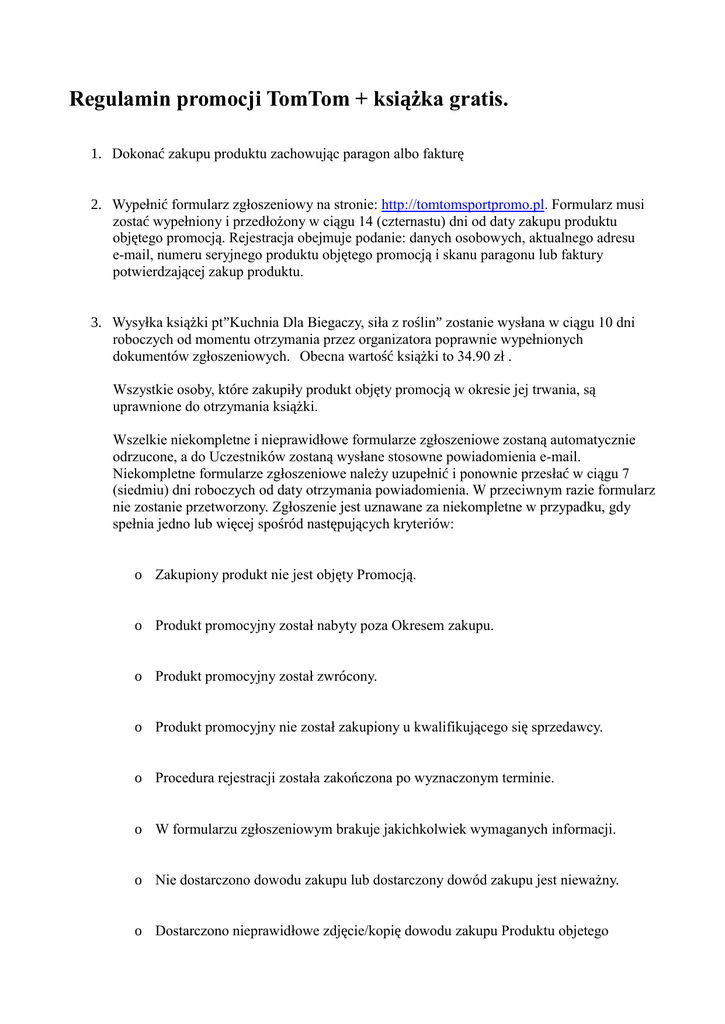 Regulamin promocji TomTom + książka gratis. 1. Dokonać zakupu produktu zachowując paragon albo fakturę 2. Wypełnić formularz zgłoszeniowy na stronie: http://tomtomsportpromo.pl. Formularz musi zostać wypełniony i przedłożony w ciągu 14 (czternastu) dni od daty zakupu produktu objętego promocją. Rejestracja obejmuje podanie: danych osobowych, aktualnego adresu e-mail, numeru seryjnego produktu objętego promocją i skanu paragonu lub faktury potwierdzającej zakup produktu. 3. Wysyłka książki pt”Kuchnia Dla Biegaczy, siła z roślin” zostanie wysłana w ciągu 10 dni roboczych od momentu otrzymania przez organizatora poprawnie wypełnionych dokumentów zgłoszeniowych. Obecna wartość książki to 34.90 zł . Wszystkie osoby, które zakupiły produkt objęty promocją w okresie jej trwania, są uprawnione do otrzymania książki. Wszelkie niekompletne i nieprawidłowe formularze zgłoszeniowe zostaną automatycznie odrzucone, a do Uczestników zostaną wysłane stosowne powiadomienia e-mail. Niekompletne formularze zgłoszeniowe należy uzupełnić i ponownie przesłać w ciągu 7 (siedmiu) dni roboczych od daty otrzymania powiadomienia. W przeciwnym razie formularz nie zostanie przetworzony. Zgłoszenie jest uznawane za niekompletne w przypadku, gdy spełnia jedno lub więcej spośród następujących kryteriów: o Zakupiony produkt nie jest objęty Promocją. o Produkt promocyjny został nabyty poza Okresem zakupu. o Produkt promocyjny został zwrócony. o Produkt promocyjny nie został zakupiony u kwalifikującego się sprzedawcy. o Procedura rejestracji została zakończona po wyznaczonym terminie. o W formularzu zgłoszeniowym brakuje jakichkolwiek wymaganych informacji. o Nie dostarczono dowodu zakupu lub dostarczony dowód zakupu jest nieważny. o Dostarczono nieprawidłowe zdjęcie/kopię dowodu zakupu Produktu objetego promocją, 4. Uczestnik musi postępować zgodnie z opisaną procedurą oraz z warunkami ogólnymi, w tym także stosować się do określonych terminów i wymogów Promocji. Uczestnicy muszą zakończyć procedurę rejestracji do godziny 23:59 czasu środkowoeuropejskiego w dniu 01 stycznia 2016 r. Warunki ogólne: 1. Promocja jest otwarta dla osób mających ukończone 18 lat w dniu zgłoszenia udziału w Promocji. Uczestnicy mają prawo ubiegać się o maksymalnie 1 (jedną) książkę na osobę (to samo nazwisko i/lub adres). Promocja nie łączy się z żadną inną ofertą ani promocją. 2. Firma TomTom szanuje prywatność Uczestników i dba o to, aby wszystkie dane osobowe były przetwarzane zgodnie z polityką prywatności firmy TomTom. Szczegóły znajdują się na stronie www.tomtom.com/legal/privacy/. 3. Uczestnicy mają prawo do uzyskania informacji o swoich danych, a jeśli zajdzie taka potrzeba, również do sprostowania lub usunięcia swoich danych przechowywanych przez firmę TomTom. Tego typu prośby należy kierować do firmy TomTom na adres: [email protected]. 4. Firma TomTom nie ponosi odpowiedzialności (także prawnej) za zagubione, opóźnione, uszkodzone lub mylnie skierowane zgłoszenia rejestracyjne. Firma TomTom nie ponosi odpowiedzialności za jakiekolwiek opóźniony lub nieprawidłowo przekazanych książek. 5. Firma TomTom zastrzega sobie prawo do jednostronnego odwołania, wprowadzenia poprawek, modyfikacji lub zmiany niniejszej Promocji i/lub do wprowadzenia poprawek do warunków ogólnych w dowolnym czasie, bez wcześniejszego powiadomienia. Uiszczenie podatków federalnych, stanowych, krajowych i lokalnych stanowi obowiązek Uczestnika. Promocja nie łączy się z innymi promocjami oferowanymi przez firmę TomTom — od momentu rozpoczęcia Promocji do Dnia zakończenia. 6. Aby uzyskać dalsze informacje o Promocji, produktach i usługach firmy TomTom lub skontaktować się z działem obsługi klienta firmy TomTom, należy przejść na stronę www.tomtom.com/support. 7. Jeśli którekolwiek postanowienie lub część postanowienia Promocji lub niniejszych warunków ogólnych zostanie uznane przez dowolne władze lub sąd właściwy miejscowo za niezgodne z prawem, nieprawidłowe lub niemożliwe do wyegzekwowania, postanowienie to lub jego część zostanie uznane za niestanowiące części niniejszej Promocji i nie będzie miało wpływu na zgodność z prawem, ważność lub możliwość wyegzekwowania pozostałych postanowień Promocji, o ile obowiązujące prawo nie stanowi inaczej. 8. Firma TomTom wyłącza swoją odpowiedzialność w stopniu dozwolonym przez prawo. Jednak żaden element Promocji ani niniejszych warunków ogólnych nie wyklucza ani nie ogranicza odpowiedzialności firmy TomTom za śmierć lub obrażenia ciała wynikłe na skutek zaniedbań ani innej odpowiedzialności, której nie można wykluczyć ani ograniczyć zgodnie z prawem. 9. Nieskorzystanie z jakichkolwiek praw, uprawnień lub środków przysługujących na mocy Promocji bądź niniejszych warunków ogólnych lub prawa, lub też zwłoka w tym zakresie nie stanowi zrzeczenia się tych praw, uprawnień ani środków. Jeśli firma TomTom zrzeknie się dochodzenia praw z tytułu naruszenia któregokolwiek postanowienia niniejszej Umowy, nie będzie to stanowić zrzeczenia się możliwości dochodzenia praw z tytułu późniejszych naruszeń tego samego lub innego postanowienia. 10. W przypadku Promocji mają zastosowanie lokalne przepisy prawa.