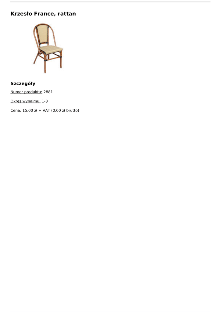 Krzesło France, rattan Szczegóły Numer produktu: 2881 Okres wynajmu: 1-3 Cena: 15.00 zł + VAT (0.00 zł brutto) Powered by TCPDF (www.tcpdf.org)
