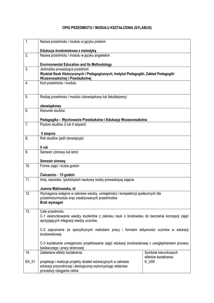 OPIS PRZEDMIOTU / MODUŁU KSZTAŁCENIA (SYLABUS) 1. Nazwa przedmiotu / modułu w języku polskim 2. Edukacja środowiskowa z metodyką Nazwa przedmiotu / modułu w języku angielskim 4. Environmental Education and Its Methodology Jednostka prowadząca przedmiot Wydział Nauk Historycznych i Pedagogicznych, Instytut Pedagogiki, Zakład Pedagogiki Wczesnoszkolnej i Przedszkolnej Kod przedmiotu / modułu 5. Rodzaj przedmiotu / modułu (obowiązkowy lub fakultatywny) 6. obowiązkowy Kierunek studiów 7. Pedagogika – Wychowanie Przedszkolne i Edukacja Wczesnoszkolna Poziom studiów (I lub II stopień) 8. II stopnia Rok studiów (jeśli obowiązuje) 9. II rok Semestr (zimowy lub letni) 10. Semestr zimowy Forma zajęć i liczba godzin 11. Ćwiczenia - 15 godzin Imię, nazwisko, tytuł/stopień naukowy osoby prowadzącej zajęcia 3. 12. 13. Joanna Malinowska, dr Wymagania wstępne w zakresie wiedzy, umiejętności i kompetencji społecznych dla przedmiotu/modułu oraz zrealizowanych przedmiotów Brak wymagań Cele przedmiotu C-1 ukierunkowanie wiedzy studentów z zakresu nauk o środowisku do tworzenia koncepcji zajęć sprzyjających integracji wiedzy uczniów, C-2 zapoznanie ze specyficznymi metodami pracy i formami aktywności uczniów w edukacji środowiskowej 14. EK_01 C-3 kształcenie umiejętności projektowanie zajęć edukacji środowiskowej z uwzględnieniem procesu badawczego i pracy terenowej Zakładane efekty kształcenia: Symbole kierunkowych efektów kształcenia: projektuje i realizuje projekty działań edukacyjnych w zakresie K_U09 edukacji przyrodniczej i ekologicznej wykorzystując właściwe procedury osiągania celów EK_02 zna strukturę organizacji ekologicznych i ich ofertę edukacyjną K_W10 EK_03 dobiera właściwe strategie, metody i techniki pracy z uczniami w zależności od grupy wiekowej i specjalnych potrzeb edukacyjnych do realizacji celów edukacji środowiskowej K_U13 EK_04 dostrzega możliwości wykorzystania ofert instytucji działających w środowisku lokalnym K_K10 EK_05 zna specyfikę pracy z uczniem w wieku przedszkolnym i wczesnoszkolnym w zakresie edukacji środowiskowej K_U11 EK_06 dąży do poszerzania wiedzy z zakresu nauk o środowisku K_K01 umożliwiającej doskonalenie działalności dydaktycznej Treści programowe Edukacja ekologiczna a edukacja środowiskowa. Edukacja ekologiczna o charakterze ciągłym i okazjonalnym. Wieloaspektowość edukacji środowiskowej. Cele i zasady i treści edukacji środowiskowej w przedszkolu i na I etapie kształcenia. Założenia konstruktywistycznej teorii kształcenia w edukacji środowiskowej. Proces badawczy i jego fazy. Poznanie wielozmysłowe. Struktura zajęć. Projektowanie zajęć z wykorzystaniem procedury badawczej. Style pracy terenowej. Zasady i techniki pracy w terenie. Organizowanie „zielonych szkół”. Specyficzne formy aktywności ucznia. Organizacja zajęć sprzyjająca integracji wiedzy uczniów. Ekologia a ochrona przyrody. Kalendarium Świąt związanych z ekologią i ochroną środowiska. Trwały i zrównoważony rozwój jako podstawa edukacji ekologicznej. Krajowe i międzynarodowe organizacje, instytucje, fundacje i programy pomocowe z zakresu ochrony środowiska i przyrody jako sojusznicy nauczycieli. Zalecana literatura (podręczniki) Arciszewska E., Lekcję po portugalsku ...raz, proszę!, [w:] D. Klus-Stańska (red.), Światy dziecięcych znaczeń, Warszawa 2004. Bogucka B., Edukacja ekologiczna w klasach I-III, Jelenia Góra 2001. Dylak S.,(red.), Przyroda-Badania-Język, Warszawa 1997. Dymara B., Dziecko w świecie przyrody, Kraków, 2000. Grodzińska-Jurczak M., Jamka R., Edukacja ekologiczna. Zbiór materiałów dla nauczycieli i studentów, Kraków 2000. Kalinowska A., Ekologia- wybór przyszłości, Warszawa 1998. Klus - Stańska D., Nowicka M., Sensy i bezsensy edukacji wczesnoszkolnej, Warszawa 2005. Parczewska T., Metody aktywizujące w edukacji przyrodniczej uczniów klas I-III, Lublin 2005. Przyroda bliska uczniom [w:] Biblioteczka Reformy, zeszyt nr 14: O nauczaniu przyrody, MEN 1999. Pyłka-Gutowska E., Ekologia z ochroną środowiska, Warszawa 1997. Soida D., Bądź mistrzem - przyjacielem, Kraków 1996. Soida D., Jak z klocków edukację budować, Kraków 1999. Soida D., Zasady i techniki edukacji ekologicznej. Organizujemy zielone szkoły, Kraków –Ojców 1994. Tyralska-Wojtycza E., Śmieci mniej-ziemi lżej. Pakiet Edukacyjny, Kraków 2001. Forma zaliczenia poszczególnych komponentów przedmiotu/modułu, sposób sprawdzenia osiągnięcia zamierzonych efektów kształcenia: 15. 16. 17. 1. Praca kontrolna: − Ocena umiejętności projektowania działań edukacyjnych w zakresie edukacji przyrodniczej i ekologicznej z wykorzystaniem właściwych procedur osiągania celów – EK_01 − Ocena umiejętności doboru strategii, metod i technik pracy z uczniami w zależności od grupy wiekowej i specjalnych potrzeb edukacyjnych – EK_03 − Ocena umiejętności wykorzystania ofert edukacyjnych i programowych z różnych źródeł – EK_04 Kryteria oceny: − Ocena bardzo dobra – praca składa się z 3 części: 1. Pogłębione wprowadzenie teoretyczne; opisane założenia, cele i treści edukacji środowiskowej na I etapie kształcenia, odniesienia do obu filarów edukacji środowiskowej, wyczerpujące omówienie warunków integracji wiedzy (z odwołaniem do literatury przedmiotu w formie przypisów). 2. Przedstawienie projektu działań edukacyjnych w odniesieniu do wybranej tematyki; projekt uwzględnia wszystkie warunki integracji wiedzy; zbudowany jest z elementów: problem dla uczniów – warsztat pracy ucznia wraz z materiałami źródłowymi – oczekiwany efekt uczniowskiej aktywności. 3. Spis bibliografii i innych wykorzystanych źródeł. Praca jest spójną całością, jest napisana na temat i wskazuje na sposób pracy z uczniem w zakresie wybranego zagadnienia. Poprawny język, właściwie stosowane nazewnictwo z zakresu pedagogiki i edukacji śro