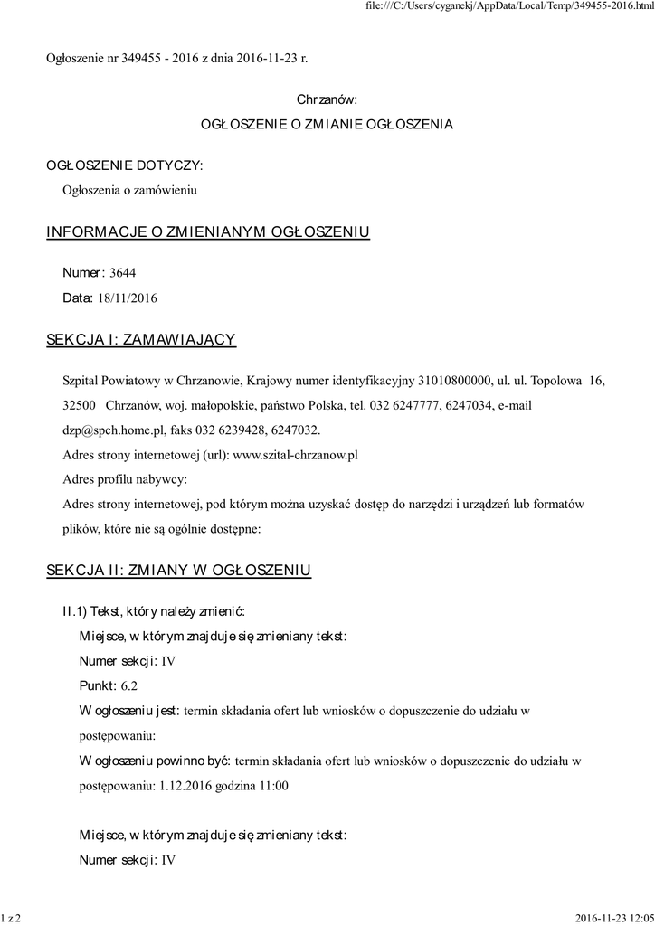 Ogłoszenie zmiana - Szpital Powiatowy w Chrzanowie
