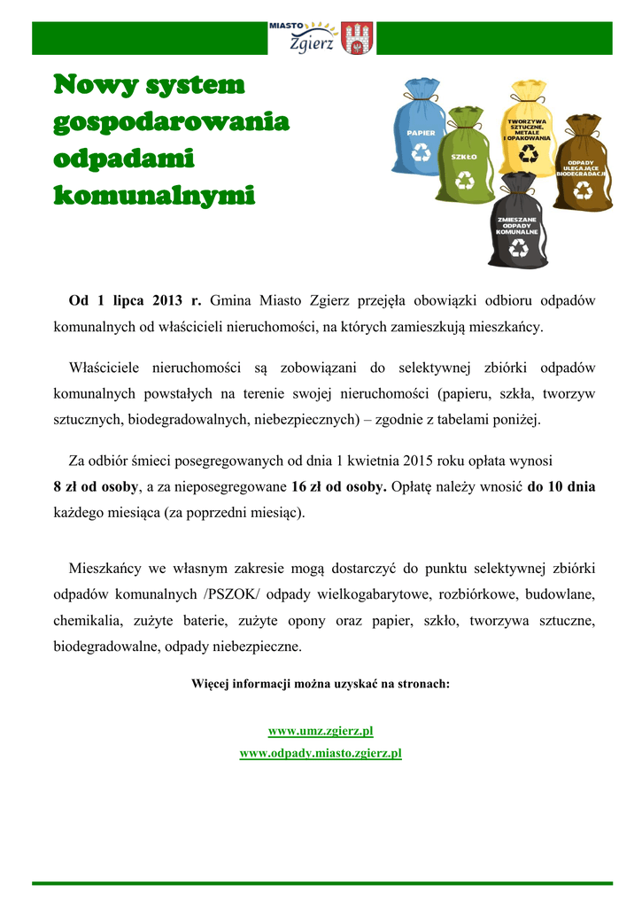Nowy system gospodarowania odpadami komunalnymi Od 1 lipca 2013 r. Gmina Miasto Zgierz przejęła obowiązki odbioru odpadów komunalnych od właścicieli nieruchomości, na których zamieszkują mieszkańcy. Właściciele nieruchomości są zobowiązani do selektywnej zbiórki odpadów komunalnych powstałych na terenie swojej nieruchomości (papieru, szkła, tworzyw sztucznych, biodegradowalnych, niebezpiecznych) – zgodnie z tabelami poniżej. Za odbiór śmieci posegregowanych od dnia 1 kwietnia 2015 roku opłata wynosi 8 zł od osoby, a za nieposegregowane 16 zł od osoby. Opłatę należy wnosić do 10 dnia każdego miesiąca (za poprzedni miesiąc). Mieszkańcy we własnym zakresie mogą dostarczyć do punktu selektywnej zbiórki odpadów komunalnych /PSZOK/ odpady wielkogabarytowe, rozbiórkowe, budowlane, chemikalia, zużyte baterie, zużyte opony oraz papier, szkło, tworzywa sztuczne, biodegradowalne, odpady niebezpieczne. Więcej informacji można uzyskać na stronach: www.umz.zgierz.pl www.odpady.miasto.zgierz.pl Rodzaj odpadów i oznaczenie pojemnika PAPIER SZKŁO KOLOROWE Kolor pojemnika NIEBIESKI ZIELONY ZIELONY SZKŁO BEZBARWNE Rodzaj odpadów gromadzonych w pojemnikach nadających się do recyklingu Odpady nie podlegające procesowi recyklingu, których wrzucanie jest zabronione Uwagi Papier i tektura: - gazety i czasopisma, - katalogi, prospekty, foldery, - papier szkolny i biurowy, - książki i zeszyty, - torebki papierowe, - papier pakowy, - pudełka kartonowe, - tektura. - papier zabrudzony i tłusty, - papier z folią i kalkę, - papier termiczny i faksowy, - kartony po mleku i napojach, - papier przebitkowy, - pieluchy jednorazowe i podpaski, - worki po cemencie i innych materiałach budowlanych, - tapety, - inne odpady komunalne. Pouczenie: - przed wrzuceniem należy usunąć metalowe części i plastikowe opakowania. Szkło kolorowe: - butelki i słoiki szklane po napojach i żywności, - butelki po napojach alkoholowych, - szklane opakowania po kosmetykach. - szkło stołowe, - fajans i porcelana, - ceramika, doniczki i znicze, - lustra i witraże, - szkło okienne i zbrojone, - żarówki, - szkło kryształowe, - reflektory i izolatory, - opakowania po lekach, - szkło żaroodporne i okularowe, - termometry i strzykawki, - ekrany i lampy telewizyjne, - szyby samochodowe, - inne odpady komunalne. Pouczenie: - wrzucać należy czyste opakowania, - nie tłuc szkła przed wrzuceniem do pojemnika, - opakowania wrzucać bez zamknięć i zakrętek. Szkło bezbarwne: - butelki i słoiki szklane po napojach i żywności, - butelki po napojach alkoholowych, - szklane opakowania po kosmetykach, - szklanki. - szkło stołowe, - fajans i porcelana, - ceramika i doniczki, - lustra, - szkło okienne i zbrojone, - żarówki, - lampy neonowe, fluoroscencyjne i rtęciowe, - reflektory i izolatory, - opakowania po lekach, - szkło żaroodporne i okularowe, - termometry i strzykawki, - ekrany i lampy telewizyjne, - szyby samochodowe, - inne odpady komunalne. Pouczenie: - wrzucać należy czyste opakowania, - nie tłuc szkła przed wrzuceniem do pojemnika, - opakowania wrzucać bez zamknięć i zakrętek. Rodzaj odpadów i oznaczenie pojemnika METALE, TWORZYWA SZTUCZNE Kolor pojemnika ŻÓŁTY ODPADY BRĄZOWY ULEGAJĄCE BIODEGRADACJI I ODPADY ZIELONE ZMIESZANE ODPADY KOMUNALNE CZARNY Rodzaj odpadów Odpady nie podlegające gromadzonych procesowi recyklingu, w pojemnikach nadających których wrzucanie jest się do recyklingu zabronione Uwagi Tworzywa sztuczne: - butelki po napojach, - opakowania po chemii gospodarczej (np. szamponach, proszkach, płynach), - opakowania po produktach spożywczych, - plastikowe zakrętki, - plastikowe torebki, worki, reklamówki i folie, - plastikowe koszyczki po owocach posiadające symbol recyklingu (wstęga Mobiusa) i chemiczną nazwę tworzywa PET, PE-HD, PE-LD, PP i PS. Metale: - puszki po napojach, sokach, - puszki z blachy stalowej po żywności, - drobny złom żelazny i metale kolorowe, - kapsle z butelek, - folia aluminiowa, Wielomateriałowe odpady opakowaniowe: - po płynnej żywności, kosmetykach i farmaceutykach. - odpady z tworzyw sztucznych PVC (PCV, PCW) PVDC, PA, OPA, PC, ABS, - butelki i pojemniki po olejach silnikowych i przemysłowych, - butelki i pojemniki po płynach chłodniczych i hydraulicznych, - opakowania po lekach i strzykawki, - pojemniki po wyrobach garmażeryjnych, - zabawki, - skrzynki po napojach, - styropian i inne odpady budowlane i rozbiórkowe, - opakowania po farbach, lakierach i olejach, - tworzywa piankowe, - kauczuk, guma i silikon, - opakowania po aerozolach, - zużyte baterie i akumulatory przenośne, - zużyty sprzęt elektryczny i elektroniczny, - inne odpady komunalne. Pouczenie: - wrzucać czyste opakowania i zgnieść je przed wrzuceniem, - zgnieść aluminiowe puszki przed wrzuceniem. Bioodpady: - organiczne odpady kuchenne, - liście, kwiaty i skoszona trawa, - nienadające się do spożycia warzywa i owoce, - resztki produktów mlecznych i skorupki jaj, - drobne gałęzie drzew i krzewów, - trociny i kora drzew, - stary chleb, - odpady opakowaniowe ulegające biodegradacji. - kości zwierząt, - olej jadalny, - mięso i padlina zwierząt, - drewno, - leki, - piasek i kamienie, - odchody zwierząt, - popiół z systemów grzewczych, - papier i karton, - inne odpady komunalne. Pouczenie: - odpady ulegające biodegradacji można zbierać do pojemników (worów) ulegających biodegradacji. Odpady sortowane: - niesegregowane odpady komunalne. - odpady ulegające biodegradacji, - inne odpady niebezpieczne, - odpady budowlane i rozbiórkowe. Pouczenie: - bez uwag. Uwaga! - nie wrzucać opakowań posiadających symbol recyklingu (wstęga Mobiusa) i chemiczną nazwę tworzywa PVC (PCV, PCW).