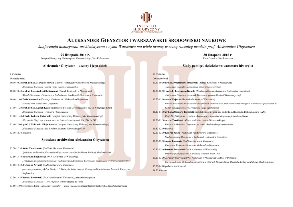 ALEKSANDER GIEYSZTOR I WARSZAWSKIE ŚRODOWISKO NAUKOWE konferencja historyczno-archiwistyczna z cyklu Warszawa ma wiele twarzy w setną rocznicę urodzin prof. Aleksandra Gieysztora 29 listopada 2016 r. 30 listopada 2016 r. Instytut Historyczny Uniwersytetu Warszawskiego, Sala Kolumnowa Pałac Staszica, Sala Lustrzana Aleksander Gieysztor – uczony i jego dzieło Ślady pamięci, dziedzictwo warsztatu historyka 9.45-10.00 10.00-10.10 Otwarcie obrad Otwarcie obrad 10.00-10.20 prof. dr hab. Maria Koczerska (Instytut Historyczny Uniwersytetu Warszawskiego) 10.10-10.30 dr hab. Przemysław Mrozowski (Zamek Królewski w Warszawie) Aleksander Gieysztor - mistrz i jego naukowe dziedzictwo 10.20-10.40 prof. dr hab. Andrzej Rottermund (Zamek Królewski w Warszawie) Aleksander Gieysztor jako badacz sztuki średniowiecznej 10.30-10.50 prof. dr hab. Adam Koseski (Akademia Humanistyczna im. Aleksandra Gieysztora) Wkład Aleksandra Gieysztora w badania nad Zamkiem Królewskim w Warszawie 10.40-11.00 Zofia Kozłowska (Fundacja Naukowa im. Aleksandra Gieysztora) Aleksander Gieysztor – historyk Mazowsza, patron Akademii Humanistycznej 10.50-11.10 Anna Wajs (Archiwum Państwowe w Warszawie) Fundacja im. Aleksandra Gieysztora Postać Aleksandra Gieysztora w materiałach archiwalnych Archiwum Państwowego w Warszawie - przyczynek do 11.00-11.20 prof. dr hab. Leszek Kuźnicki (Instytut Biologii Doświadczalnej im. M. Nenckiego PAN) Aleksander Gieysztor – rozwaga i konsolidacja badań dotyczących osoby Profesora i jego działalności 11.10-11.30 dr hab. Zbigniew Tucholski (Instytut Historii Nauki im. Ludwika i Aleksandra Birkenmajerów PAN) 11.20-11.40 dr hab. Tadeusz Rutkowski (Instytut Historyczny Uniwersytetu Warszawskiego) Aleksander Gieysztor w warszawskim środowisku akademickim (1945 - 1975) Prof. Józef Gieysztor – twórca ekonomicznych podstaw eksploatacji handlowej kolei 11.30-11.50 Adam Tyszkiewicz (Muzeum Uniwersytetu Warszawskiego) 11.40-12.00 prof. UW dr hab. Alicja Kulecka (Instytut Historyczny Uniwersytetu Warszawskiego) Aleksander Gieysztor jako dyrektor Instytutu Historycznego UW 12.00-12.30 Przerwa Badania Aleksandra Gieysztora na temat akademickiego ceremoniału 11.50-12.10 Przerwa 12.10-12.30 Konrad Szuba (Archiwum Państwowe w Warszawie) Spuścizna archiwalna Aleksandra Gieysztora Średniowieczna Warszawa w badaniach Aleksandra Gieysztora 12.30-12.50 Agata Łazowska (PAN Archiwum w Warszawie) Powstanie Warszawskie oczami Aleksandra Gieysztora 12.30-12.50 Anita Chodkowska (PAN Archiwum w Warszawie) 12.50-13.10 Bartosz Borkowski (PAN Archiwum w Warszawie) Spuścizna archiwalna Aleksandra Gieysztora w zasobie Archiwum Polskiej Akademii Nauk 12.50-13.10 Katarzyna Słojkowska (PAN Archiwum w Warszawie) Wizyty dyplomatyczne w Warszawie w latach 1989-1999 13.10-13.30 Jarosław Matysiak (PAN Archiwum w Warszawie Oddział w Poznaniu) „Przeżycie historyczne przeszłości” nad spuścizną Aleksandra Gieysztora: prezentacja wybranych materiałów 13.10-13.30 dr Joanna Arvaniti (PAN Archiwum w Warszawie) prezentacja wystawy Byłem i będę… O historyku, który tworzył historię, realizacja Joanna Arvaniti, Katarzyna Słojkowska Korespondencja Aleksandra Gieysztora w zbiorach Poznańskiego Oddziału Archiwum Polskiej Akademii Nauk 13.30-14.00 podsumowanie obrad 14.30 Koncert 13.30-13.50 Bartosz Borkowski (PAN Archiwum w Warszawie), Anna Gruszczyńska Aleksander Gieysztor — życie i pasja, wprowadzenie do filmu 13.50-15.00 prezentacja filmu Aleksander Gieysztor — życie i pasja, realizacja Bartosz Borkowski, Anna Gruszczyńska