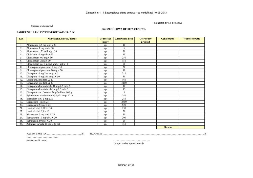 Załacznik nr 1_1 Szczegółowa oferta cenowa - po modyfikacji 10-05-2013 Załącznik nr 1.1 do SIWZ (pieczęć wykonawcy) SZCZEGÓŁOWA OFERTA CENOWA PAKIET NR 1 LEKI PSYCHOTROPOWE GR. P IV L.p. 1. 2. 3. 4. 5. 6. 7. 8. 9. 10. 11. 12. 13. 14. 15. 16. 17. 18. 19. 20. 21. 22. 23. 24. 25. 26. Nazwa leku, dawka, postać Alprazolam 0,5 mg tabl. x 30 Alprazolam 1 mg tabl.x 30 Alprazolam o,25 tabl.mg x 30 Clobazam 10 mg.tabl.x 20 Clonazepam 0,5 mg x 30 Clonazepam 2 mg x 30 Clonazepam inj. 1 mg/ml amp. 1 ml x 10 Clorazepate dipotasium 5 mg x 30 Clorazepate dipotasium 10 mg x 30 Diazepam 10 mg/2ml amp. X 5 Diazepam 10 mg/2ml amp. X 50 Diazepam 2 mg tabl. X 20 Diazepam 5 mg tabl. X 20 Diazepam wlewki doodb. 10 mg/2,5 ml x 5 Diazepam wlewki doodb.5 mg/2,5 ml x 5 Diazepam zaw. Doustna 2mg/5ml but. 100 g Ephedrinum h/chloricum inj.0,025 amp. X 10 Estazolam tabl. 2 mg x 20 Lorazepam 1 mg x 25 Lorazepam 2,5 mg x 25 Luminal tabl. 0,015 x 10 Luminal tabl. 0,1 x 10 Nitrazepam 5 mg tabl. X 20 Temazepam 10 mg tabl. X 20 Tetrazepam 50 mg X 20 Zolpidem tartrate 10 mg x 20 szt. Jednostka miary op. op. op. op. op. op. op. op. op. op. op. op. op. op. op. op. op. op. op. op. op. op. op. op. op. op. Zamawiana ilość Oferowany produkt Cena brutto Wartość brutto 10 5 30 10 250 150 70 20 10 210 50 160 3100 10 15 5 240 280 2800 520 130 20 50 200 20 750 Razem RAZEM BRUTTO:……………………………………zł ……………………………….. (miejscowość i data) SŁOWNIE:…………………………………………………………………………………….……………………..zł …………………………………….. (podpis osoby upowaŜnionej) Strona 1 z 155 Załacznik nr 1_1 Szczegółowa oferta cenowa - po modyfikacji 10-05-2013 (pieczęć wykonawcy) SZCZEGÓŁOWA OFERTA CENOWA PAKIET NR 2 MIDAZOLAM L.p. 1. 2. 3. 4. 5. 6. 7. Nazwa leku, dawka, postać Midazolam 7.5 mg x 10 Midazolam 5 mg/ml amp. 3ml x 5 Midazolam 1 mg/ml amp. 5 ml x 10 Midazolam 2mg/2ml amp. X 10 Midazolam 5 mg/ml amp. 1 ml x 10 Midazolam 5 mg/ml amp. 10 ml x 5 Midazolam.15 mg x 100 Jednostka miary op. op. op. op. op. op. op. Zamawiana ilość Oferowany produkt Cena brutto Wartość brutto 1800 65 300 200 25 130 180 Razem RAZEM BRUTTO:……………………………………zł ……………………………….. (miejscowość i data) SŁOWNIE:…………………………………………………………………………………….……………………..zł …………………………………….. (podpis osoby upowaŜnionej) Strona 2 z 155 Załacznik nr 1_1 Szczegółowa oferta cenowa - po modyfikacji 10-05-2013 (pieczęć wykonawcy) SZCZEGÓŁOWA OFERTA CENOWA PAKIET NR 3 ŚRODKI ODURZAJĄCE I PSYCHOTROPOWE GR. P II L.p. 1. 2. 3. 4. 5. 6. 7. 8. 9. 10. 11. 13. 14. 15. 16. Nazwa leku, dawka, postać Concerta tabl.18 mg tabl. o przedł. uwaln.x 30 Medikinet 10 mg tabl. X 20 Medikinet 5 mg tabl. X 20 Medikinet CR 10 mg kaps. O przedł. Uwaln.x 30 Medikinet CR 20 mg kaps. O przedł. Uwaln.x 30 Morphini sulfas inj. 10 mg amp. X 10 Morphini sulfas inj. 20 mg amp. X 10 Pentazocini lactate inj. 30 mg/ml amp. X 10 Pethidine h/chloricum 50 mg/ml amp.1 ml X 10 Pethidine h/chloricum 50 mg/ml amp 2 ml X 10 Fentanyl citrate inj. 0,1mg/2ml amp. 2ml x 50 Morphini sulfas tabl.10 mg o przedł. lub zmodyfikowanym uwaln.x 20 Morphini sulfas tabl.30 mg o przedł. lub zmodyfikowanym uwaln.x 20 Morphini sulfas tabl.60 mg o przedł. lub zmodyfikowanym uwaln.x 20 Buprenorphinum 52,5 µg/h, system transdermalny, 30 mg Jednostka miary op. op. op. op. op. op. op. op. op. op. op. op. Zamawiana ilość op. 10 op. 10 op. 3 Oferowany produkt Cena brutto Wartość brutto 20 10 10 10 5 500 80 30 200 50 180 10 Razem RAZEM BRUTTO:……………………………………zł ……………………………….. (miejscowość i data) SŁOWNIE:…………………………………………………………………………………….……………………..zł …………………………………….. (podpis osoby upowaŜnionej) Strona 3 z 155 Załacznik nr 1_1 Szczegółowa oferta cenowa - po modyfikacji 10-05-2013 (pieczęć wykonawcy) SZCZEGÓŁOWA OFERTA CENOWA PAKIET NR 4 ŚRODKI ODURZAJĄCE I L.p. 1. 2. Nazwa leku, dawka, postać Sufentanil inj. 5 µg/ml amp. 10 ml.x 5 Sufentanil inj. 50 µg/ml amp. 5 ml.x 5 Jednostka miary op. op. Zamawiana ilość Oferowany produkt Cena brutto Wartość brutto 30 20 Razem RAZEM BRUTTO:……………………………………zł ……………………………….. (miejscowość i data) SŁOWNIE:…………………………………………………………………………………….……………………..zł …………………………………….. (podpis osoby upowaŜnionej) Strona 4 z 155 Załacznik nr 1_1 Szczegółowa oferta cenowa - po modyfikacji 10-05-2013 (pieczęć wykonawcy) SZCZEGÓŁOWA OFERTA CENOWA PAKIET NR 5 ŚRODKI ODURZAJĄCE I I L.p. 1. 2. 3. Nazwa leku, dawka, postać Remifentanyl 5 mg Remifentanyl 2 mg Remifentanyl 1 mg. Jednostka miary amp. amp. amp. Zamawiana ilość Oferowany produkt Cena brutto Wartość brutto 120 140 120 Razem RAZEM BRUTTO:……………………………………zł ……………………………….. (miejscowość i data) SŁOWNIE:…………………………………………………………………………………….……………………..zł …………………………………….. (podpis osoby upowaŜnionej) Strona 5 z 155 Załacznik nr 1_1 Szczegółowa oferta cenowa - po modyfikacji 10-05-2013 (pieczęć wykonawcy) SZCZEGÓŁOWA OFERTA CENOWA PAKIET NR 6 ŚRODKI ODURZAJĄCE III L.p. 1. 2. 3. Nazwa leku, dawka, postać Oxycodone hydrochloride 10 mg./ml amp. 2 ml.x 10 Oxycodone hydrochloride tabl.o przedł.uwln. 10 mg.x 60 Oxycodone hydrochloride tabl.o przedł.uwln. 5 mg.x 60 Jednostka miary op. op. op. Zamawiana ilość Oferowany produkt Cena brutto Wartość brutto 90 50 50