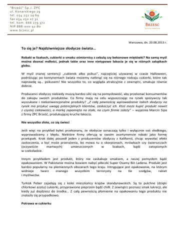 "Brześć" Sp. J. Z PC ul. Konarskiego 19 tel. 054 252 19 69 fax 054 252 27 31 tel. kom. 6 66 279 372 NIP 888-000-51-80 www.brzesc.pl Warszawa, dn. 20.08.2013 r. To się je? Najdziwniejsze słodycze świata… Robaki w lizakach, cukierki o smaku ośmiornicy z cebulą czy bekonowe miętówki? Na samą myśl można doznad mdłości, jednak takie oraz inne nietypowe łakocia je się w różnych zakątkach globu. W myśl znanej sentencji „cukierek albo psikus”, najczęściej używanej w czasie Halloween, podróżując po kontynentach świata możemy natknąd się na różnego rodzaju cukierki, które tak naprawdę są… psikusem! Nie wszystko to, co wygląda atrakcyjnie z zewnątrz, smakuje równie dobrze. Producenci słodyczy niekiedy muszą bardzo silid się na pomysłowośd, aby przekonad konsumentów do zakupu swoich produktów. Co firmy mają na celu wypuszczając na rynek spożywczy tak wyszukane i niekonwencjonalne produkty? „Z całą pewnością wprowadzenie takich słodyczy na rynek ma przykuć uwagę potencjalnych klientów, zaskoczyć ich. Ktoś może kupić produkt nawet z czystej ciekawości, a markę zapamięta na stałe, na czym firmie zależy” – wyjaśnia Marcin Sipa z firmy ZPC Brześd, produkującej kruche łakocia. Nie wszystko złote, co się świeci Jeśli więc na przykład byłeś przekonany, że słodycze oznaczają tylko i wyłącznie coś słodkiego, wyprowadzamy z błędu. Niektóre firmy oferują w swoim asortymencie robaki jako formę przekąsek. Krok dalej poszedł jeden z producentów słodyczy z Kalifornii, chcąc wywoład efekt zaskoczenia, a byd może przerażenia, bo mowa tu o skorpionach, mrówkach czy świerszczach (oczywiście martwych) umieszczonych w lizakach, bądź zatopionych w czekoladzie. Innym przykładem jest produkt, który nie zaskakuje smakiem, a raczej pomysłem bądź opakowaniem. W Pakistanie można bowiem nabyd piłeczki Super Osamy Bin Ladena. Produkt jest bardzo popularny na plemiennych obszarach tego kraju. Intrygujące jest opakowanie, na którym widnieje twarz znanego wszystkim terrorysty na tle czołgów, rakiet i myśliwców. Tyrkisk Peber zajadają się z kolei mieszkaocy krajów skandynawskich. Są to pulchne (dzięki chlorkowi azotu) cukierki, przyprawione pieprzem bądź chilli. Z zewnątrz poznasz smak lukrecji, ale kiedy już dojdziesz do środka… Z całą pewnością płomienie na opakowaniu tego produktu nie znalazły się przypadkowo. Potrawa w cukierku "Brześć" Sp. J. Z PC ul. Konarskiego 19 tel. 054 252 19 69 fax 054 252 27 31 tel. kom. 6 66 279 372 NIP 888-000-51-80 www.brzesc.pl Popularnym daniem w Osace w Japonii jest takoyaki. Na tę potrawę składa się smażona ośmiornica, przyozdobiona zieloną cebulą i majonezem. Cukierki takoyaki to dokładnie ten sam smak, tyle że zmieszczony w małych dropsach. Z kolei lokum to nazwa tureckiej rozkoszy, jest niezwykle popularny na Bałkanach i Środkowym Wschodzie. Są to cukierki o zapachu różanej wody, cytryny bądź mięty, często posypane z wierzchu cukrem pudrem bądź mąką. W środku mogą zawierad pistacje bądź orzechy włoskie. W Grecji lokum serwuje się do tureckiej kawy, zamiast ciastek. Będąc w Australii lub Nowej Zelandii możemy skosztowad piżmowych lizaków. Piżmo to substancja wydzielana z gruczołów około odbytniczych piżmowca, o intensywnym zapachu, z reguły używana w przemyśle perfumeryjnym. Wydawad by się mogło, że nie da się tego wziąd do ust, a jednak! W obu tych krajach możemy natknąd się na piżmowe lizaki bądź gumy do żucia. Salsagheti to gumowe węże o smaku arbuza bądź mango, pokryte z wierzchu chilli, solą i cukrem. Nazwa pochodzi od salsy (meksykaoskiego sosu z pomidorów, papryki i cebuli z dodatkiem chilli), którym polewa się długie nitki makaronu. Słodycze wyglądają dokładnie tak jak pasta polana ostrym sosem. W Stanach Zjednoczonych miętówki niekoniecznie mają na celu odświeżenie oddechu, bowiem na półkach sklepowych można znaleźd dropsy o smaku… boczku! Nie można zagwarantowad, że oddech po zjedzeniu takiego cukierka będzie nazbyt świeży, aczkolwiek Amerykanom ponod smakuje. Jak ktoś lubi boczek w naturalnej postaci, może polubid także w formie do ssania. Jak widad producenci słodyczy na świecie prześcigają się w nietypowych produktach, czym chcą przyciągnąd uwagę, a dalej nowych klientów. W Polsce pod tym względem na sklepowych półkach jest raczej normalnie… Kontakt dla mediów: Korneliusz Smolik [email protected] Tel: +48 510 796 217 ___ "Brześd" Sp.J. ZPC - Rodzinna firma istniejąca od 1984 roku. Brześd specjalizuje się w tradycyjnych, opartych na domowych recepturach wyrobów cukierniczych. Produkty Brześcia są sprzedawane poprzez przedstawicieli i dystrybutorów na terenie całej Polski.