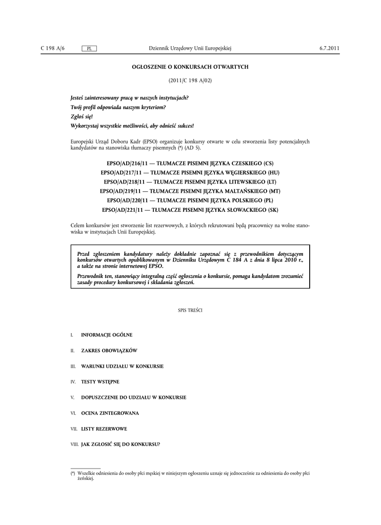 C 198 A/6 Dziennik Urzędowy Unii Europejskiej PL OGŁOSZENIE O KONKURSACH OTWARTYCH (2011/C 198 A/02) Jesteś zainteresowany pracą w naszych instytucjach? Twój profil odpowiada naszym kryteriom? Zgłoś się! Wykorzystaj wszystkie możliwości, aby odnieść sukces! Europejski Urząd Doboru Kadr (EPSO) organizuje konkursy otwarte w celu stworzenia listy potencjalnych kandydatów na stanowiska tłumaczy pisemnych (*) (AD 5). EPSO/AD/216/11 — TŁUMACZE PISEMNI JĘZYKA CZESKIEGO (CS) EPSO/AD/217/11 — TŁUMACZE PISEMNI JĘZYKA WĘGIERSKIEGO (HU) EPSO/AD/218/11 — TŁUMACZE PISEMNI JĘZYKA LITEWSKIEGO (LT) EPSO/AD/219/11 — TŁUMACZE PISEMNI JĘZYKA MALTAŃSKIEGO (MT) EPSO/AD/220/11 — TŁUMACZE PISEMNI JĘZYKA POLSKIEGO (PL) EPSO/AD/221/11 — TŁUMACZE PISEMNI JĘZYKA SŁOWACKIEGO (SK) Celem konkursów jest stworzenie list rezerwowych, z których rekrutowani będą pracownicy na wolne stano wiska w instytucjach Unii Europejskiej. Przed zgłoszeniem kandydatury należy dokładnie zapoznać się z przewodnikiem dotyczącym konkursów otwartych opublikowanym w Dzienniku Urzędowym C 184 A z dnia 8 lipca 2010 r., a także na stronie internetowej EPSO. Przewodnik ten, stanowiący integralną część ogłoszenia o konkursie, pomaga kandydatom zrozumieć zasady procedury konkursowej i składania zgłoszeń. SPIS TREŚCI I. INFORMACJE OGÓLNE II. ZAKRES OBOWIĄZKÓW III. WARUNKI UDZIAŁU W KONKURSIE IV. TESTY WSTĘPNE V. DOPUSZCZENIE DO UDZIAŁU W KONKURSIE VI. OCENA ZINTEGROWANA VII. LISTY REZERWOWE VIII. JAK ZGŁOSIĆ SIĘ DO KONKURSU? (*) Wszelkie odniesienia do osoby płci męskiej w niniejszym ogłoszeniu uznaje się jednocześnie za odniesienia do osoby płci żeńskiej. 6.7.2011 6.7.2011 PL Dziennik Urzędowy Unii Europejskiej C 198 A/7 I. INFORMACJE OGÓLNE 1. Liczba laureatów 2. Uwagi Wariant 1 — Wariant 2 EPSO/AD/216/11 (CS) 17 2 EPSO/AD/217/11 (HU) 12 11 EPSO/AD/218/11 (LT) 14 8 EPSO/AD/219/11 (MT) 24 35 EPSO/AD/220/11 (PL) 19 2 EPSO/AD/221/11 (SK) 17 2 Dla każdego konkursu przewidziano dwa warianty. Można zgłaszać się tylko do jednego konkursu, wybierając jeden wariant. Wyboru należy dokonać w momencie rejestracji elektronicznej i nie ma możliwości jego zmiany po zatwierdzeniu i przesłaniu formularza zgłoszeniowego drogą elektroniczną. Laureaci będą zatrudniani głównie w Luksemburgu. Omawiane konkursy skierowane są do kandydatów posiadających doskonałą znajo mość, zarówno w mowie, jak i piśmie, języka konkursowego (na poziomie języka ojczystego lub jemu równym). Stanowczo odradzamy zgłaszanie się do konkursu, jeśli kandydat nie zna języka na takim poziomie. II. ZAKRES OBOWIĄZKÓW Grupa zaszeregowania AD 5 jest grupą zaszeregowania, na której poziomie administratorzy — zarówno administratorzy lingwiści, jak i inni administratorzy — rozpoczynają pracę zawodową w instytucjach euro pejskich. Głównym zadaniem administratorów lingwistów (tłumaczy pisemnych) jest realizacja zadań instytucji lub organów, w których są zatrudnieni, poprzez wykonywanie wysokiej jakości tłumaczeń pisemnych w okreś lonym terminie oraz doradztwo językowe. Do zakresu obowiązków administratora lingwisty (tłumacza pisemnego) należy tłumaczenie pisemne i wery fikacja dokumentów oraz praca terminologiczna, z przynajmniej dwóch języków obcych na język główny. Dokumenty, często o wysokim stopniu trudności, dotyczą zazwyczaj tematów politycznych, prawnych, ekonomicznych, finansowych, naukowych i technicznych i odnoszą się do wszystkich obszarów działania Unii Europejskiej. Praca wymaga korzystania ze specjalistycznych narzędzi informatycznych i biurowych. Ogólny profil kandydatów do pracy w instytucjach europejskich opisano w pkt 1.2 przewodnika dotyczącego konkursów otwartych. III. WARUNKI UDZIAŁU W KONKURSIE W momencie upływu terminu zgłoszeń drogą elektroniczną kandydat musi spełniać wszystkie następu jące warunki ogólne i szczegółowe: 1. Warunki ogólne a) b) c) d) Posiadać obywatelstwo jednego z państw członkowskich Unii Europejskiej. Korzystać z pełni praw obywatelskich. Mieć uregulowany stosunek do służby wojskowej. Posiadać odpowiednie cechy charakteru niezbędne do wykonywania przyszłych obowiązków. 2. Warunki szczegółowe 2.1. Dyplom Poziom wykształcenia odpowiadający ukończonym studiom uniwersyteckim trwającym co najmniej trzy lata, potwierdzony dyplomem ukończenia studiów. C 198 A/8 PL 2.2. Dziennik Urzędowy Unii Europejskiej Doświadczenie zawodowe Doświadczenie zawodowe nie jest wymagane. 2.3. Znajomość języków Języki urzędowe Unii Europejskiej to: BG (bułgarski) FI (fiński) NL (niderlandzki) CS (czeski) FR (francuski) PL (polski) DA (duński) GA (irlandzki) PT (portugalski) DE (niemiecki) HU (węgierski) RO (rumuński) EL (grecki) IT (włoski) SK (słowacki) EN (angielski) LT (litewski) SL (słoweński) ES (hiszpański) LV (łotewski) SV (szwedzki) ET (estoński) MT (maltański) WARIANT 1 Język 1 — język podstawowy: doskonała znajomość języka konkursowego Język 2 — pierwszy język źródłowy: biegła znajomość jednego z następujących języków: DE (niemiecki), EN (angielski), FR (francuski) Język 3 — drugi język źródłowy (obowiązkowo inny niż język 2): biegła znajomość jednego z następujących języków: DE (niemiecki), EN (angielski), FR (francuski) WARIANT 2 Język 1 — język podstawowy: doskonała znajomość języka konkursowego Język 2 — pierwszy język źródłowy: biegła znajomość jednego z następujących języków: DE (niemiecki), EN (angielski), FR (francuski) Język 3 — drugi język źródłowy, obowiązkowo inny niż język 1 oraz niebędący niemieckim, angielskim ani francuskim: doskonała znajomość jednego z pozostałych języków urzędowych Unii Europejskiej IV. TESTY WSTĘPNE 1. Zaproszenie do udziału w testach Do udziału w testach zostaną zaproszeni kandydaci, którzy dokonali zgłoszenia w terminie (zob. roz