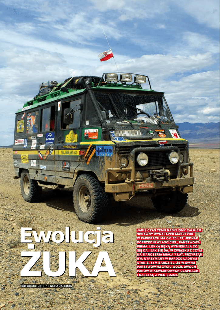 ewolucja żuka tekst i zdjęcia: JACEK i KUBA JAROSIK Jakiś Jakiś czas czas temu temu nabyliśmy nabyliśmy całkiem całkiem sprawny sprawny wynalazek wynalazek marki marki Żuk. Żuk. W papierach W papierach ma ma ok. ok. 20 20 lat, lat, jednak jednak poprzedni poprzedni właściciel, właściciel, państwowa państwowa firma, firma, lekką lekką ręką ręką wymieniała wymieniała co co się się da da i jak i jak się się da, da, w związku w związku z czym z czym np. np. karoseria karoseria miała miała 77 lat. lat. Przyrząd Przyrząd był w bardzo ładnym ładnym był utrzymany utrzymany w bardzo stanie, tym bardziej, że w swym w swym stanie, tym bardziej, że państwowym państwowym życiu życiu woził woził dwóch dwóch panów w kewlarowych czapkach panów w kewlarowych czapkach i kasetkę i kasetkę z pieniędzmi. z pieniędzmi. 4x4| ŻUK W naszym władaniu Żuk zaczął pracować. W związku z tym, że w ramach pracy i zainteresowań poruszamy się często po drogach, które tylko z nazwy są drogami, szybko zaczęliśmy doświadczać ułomności polskiej myśli inżynierskiej. Najboleśniej odczuwaliśmy ciągłe niedomagania przedniego zawieszenia. Reszta po “małym” udoskonaleniu działała zupełnie przyzwoicie. Pierwszym małym zabiegiem było wbudowanie swoistego czterobiegowego reduktora. To znaczy, tuż za czterobiegową skrzynią szosową wbudowana została druga, tym razem trzybiegowa, połączona sprzęgłem gumowym. Dawało to piorunujące przełożenia. W opcji ekstremalnej – dwa wsteczne – uzyskiwaliśmy na most przełożenie ok. 11:1. Ponadto na dachu zamontowaliśmy bagażnik, wymieniliśmy przednie fotele na wygodniejsze i bezpieczniejsze, a miejsce bocznych ławeczek zajęła jedna 3-osobowa kanapa umieszczona poprzecznie. Z czasem zrodził się pomysł zbudowania na bazie Żuka terenówki. Ale nie takiej na przeprawy czy do ścigania – bardziej do turystyki. Bliższej i dalszej. Zaczęliśmy od wyrzucenia oryginalnego silnika i przedniego zawieszenia. Poszło szybko – szlifierka kątowa jest cudownym wynalazkiem. Potem zaczęło się dopasowywanie podzespołów, które teoretycznie nie mają prawa pasować do siebie, tym bardziej w tej karoserii. Udało się. Po pierwszym etapie przeróbek pojazd był wyposażony w gaźnikowy silnik Mercedes 2.3 benzyna/gaz, czterobiegową skrzynię Mercedesa, reduktor i mosty napędowe Uaza (tylny z blokadą mechanizmu różnicowego). Konieczne było również zmodyfikowanie deski rozdzielczej – polskie wskaźniki nie chciały współpracować z niemieckimi czujnikami – oraz nadbudowanie wewnętrznej maski silnika, aby zmieścić trochę wyższą i wyżej posadowioną jednostkę napędową. Przyszła kolej na “kangura”. Odpowiednio wyprofilowany na kształt zderzaka ceownik z blachy 4 mm, w to wszystko wspawana główna rura 2,25 cala plus po obu stronach elementy uzupełniające z ciut cieńszych rur. Na zderzaku u góry dwa małe “nosorożce” od Uaza, centralnie pod zderzakiem hak z zapadką “żywcem” wyrwany ze zezłomowanych fragmentów Uaza 452. Wszystko to zamocowane do ramy – dla sztywności w 3 płaszczyznach. Na dwóch śrubach 14, dwóch 12, dwóch 10 i czterech 8. Stabilne. Również tylny zderzak jest wytrzymały – bez obaw możemy podłożyć pod niego hi-lifta i podnieść auto z pełnym ładunkiem. Za sprawą Adama Sasa pozyskaliśmy dla naszej wyprawówki LISTOPAD / GRUDZIEŃ 08 53 4x4| ŻUK wyciągarkę Monthana 9500. Została ona wkomponowana w przedni zderzak samochodu. Z wyprawy w Karpaty 2007 roku wróciliśmy ze wstępną koncepcją dalszej przebudowy i zmian. Zaczęliśmy od wymiany bębnowych „spowalniaczy” na skuteczniejsze, a przede wszystkim bardziej niezawodne i właściwie bezobsługowe hamulce tarczowe. Zmieniliśmy również koła – miejsce wysłużonych AT-ków na felgach Uaza zajęły 31-calowe MT FEDIMA na felgach Mangels 15x7 ET(-12). Poszerzyło to samochód o kilka centymetrów, częściowo równoważąc jego podniesienie na resorach i większych kołach. Obecnie rozstaw kół jest o blisko 30 cm większy niż w oryginalnym Żuku. Po niemiłych doświadczeniach z Rumunii zmodyfikowaliśmy blokadę tylnego mostu – pomysł Grzegorza z Kościerzyny. Po naszych zmianach mechanizm bezawaryjnie przejechał tegoroczną wyprawę do Mongolii. Przebudowa mechanizmu blokady w stosunku do pierwotnej konstrukcji zastosowanej przez Grzegorza polega na użyciu łożysk kulkowych i tulei brązowych pracujących w kąpieli olejowo-tawotowej. Całość mechanizmu przesuwania została umieszczona w walcowatej komorze pogrubiającej rurę lewej pochwy mostu. Komora ta została wspawana po wycięciu fragmentu rury tuż za obudową mechanizmu różnicowego. Mechanizm włączania uruchamiany jest za pomocą cięgła stalowego i dźwigni podobnej do dźwigni hamulca ręcznego. Podczas przygotowań do azjatyckiej wyprawy w naszym aucie dokonaliśmy jeszcze kilku zmian. Miejsce niepraktycznej, wręcz pokracznej tylnej klapy zajęły dwuskrzydłowe drzwi własnej konstrukcji, przymocowane do solidnej ramy z kątowników, dodatkowo zwiększającej sztywność karoserii. Silnik benzynowy zamieniliśmy na poczciwego, pięciocylindrowego diesla o pojemności 3 litrów. Obecnie współpracuje on z pięciostopniową skrzynią biegów – przełożenie na pierwszym biegu 4.7, na „piątce” nadbieg, przydatny na długich trasach. Z myślą o mongolskim kurzu filtr powietrza „powędrował” na dach. Miejsce butli gazowej zajął zbiornik własnej konstrukcji o pojemności 157 litrów. W połączeniu ze zbiornikiem głównym daje to blisko 230 litrów zapasu paliwa. Stare, wysłużone resory zastąpiliśmy wzmacnianymi, wykonanymi na zamówienie przez firmę ŚNIEŻEK. Sprawdziły się. W układzie chłodzenia wykorzystany został wentylator elektryczny zamontowany na chłodnicy pochodzącej z Żuka diesla, dwa razy grubszej od tej z wersji benzynowej. Obok zamontowa