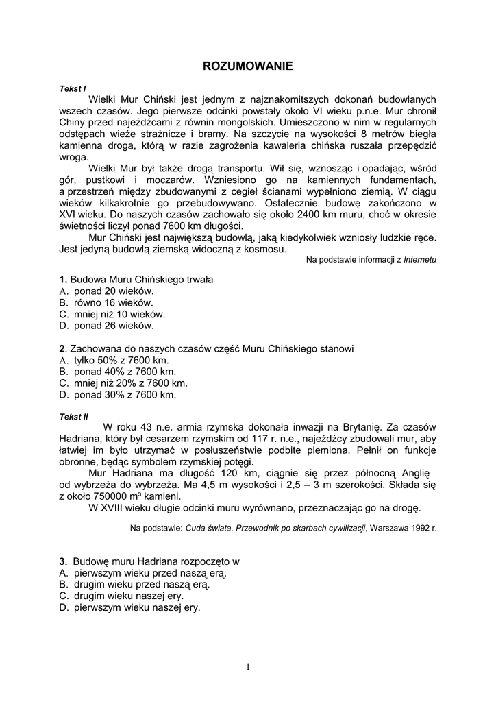 ROZUMOWANIE Tekst I Wielki Mur Chiński jest jednym z najznakomitszych dokonań budowlanych wszech czasów. Jego pierwsze odcinki powstały około VI wieku p.n.e. Mur chronił Chiny przed najeźdźcami z równin mongolskich. Umieszczono w nim w regularnych odstępach wieże strażnicze i bramy. Na szczycie na wysokości 8 metrów biegła kamienna droga, którą w razie zagrożenia kawaleria chińska ruszała przepędzić wroga. Wielki Mur był także drogą transportu. Wił się, wznosząc i opadając, wśród gór, pustkowi i moczarów. Wzniesiono go na kamiennych fundamentach, a przestrzeń między zbudowanymi z cegieł ścianami wypełniono ziemią. W ciągu wieków kilkakrotnie go przebudowywano. Ostatecznie budowę zakończono w XVI wieku. Do naszych czasów zachowało się około 2400 km muru, choć w okresie świetności liczył ponad 7600 km długości. Mur Chiński jest największą budowlą, jaką kiedykolwiek wzniosły ludzkie ręce. Jest jedyną budowlą ziemską widoczną z kosmosu. Na podstawie informacji z Internetu 1. Budowa Muru Chińskiego trwała A. ponad 20 wieków. B. równo 16 wieków. C. mniej niż 10 wieków. D. ponad 26 wieków. 2. Zachowana do naszych czasów część Muru Chińskiego stanowi A. tylko 50% z 7600 km. B. ponad 40% z 7600 km. C. mniej niż 20% z 7600 km. D. ponad 30% z 7600 km. Tekst II W roku 43 n.e. armia rzymska dokonała inwazji na Brytanię. Za czasów Hadriana, który był cesarzem rzymskim od 117 r. n.e., najeźdźcy zbudowali mur, aby łatwiej im było utrzymać w posłuszeństwie podbite plemiona. Pełnił on funkcje obronne, będąc symbolem rzymskiej potęgi. Mur Hadriana ma długość 120 km, ciągnie się przez północną Anglię od wybrzeża do wybrzeża. Ma 4,5 m wysokości i 2,5 – 3 m szerokości. Składa się z około 750000 m³ kamieni. W XVIII wieku długie odcinki muru wyrównano, przeznaczając go na drogę. Na podstawie: Cuda świata. Przewodnik po skarbach cywilizacji, Warszawa 1992 r. 3. A. B. C. D. Budowę muru Hadriana rozpoczęto w pierwszym wieku przed naszą erą. drugim wieku przed naszą erą. drugim wieku naszej ery. pierwszym wieku naszej ery. 1 4. Mur Hadriana zbudowano od wybrzeża do wybrzeża, aby A. ułatwić komunikację między wybrzeżami. B. zgromadzić materiał do budowy dróg. C. bronić się przed wrogimi plemionami. D. uniknąć wtargnięcia Rzymian. Tekst III W Polsce buduje się drogi szybkiego ruchu. Hałas i spaliny samochodowe stają się uciążliwe dla mieszkańców pobliskich miast i wsi. W celu ochrony sąsiadujących z drogami szybkiego ruchu osiedli buduje się specjalne ściany zwane ekranami. Na podstawie informacji z Internetu 5. Ekrany budowane przy drogach mają przede wszystkim na celu A. upiększenie drogi. B. wytłumienie hałasu. C. uspokojenie kierowców. D. odizolowanie pieszych od jezdni. 6. Na podstawie tekstów I, II i III napisz, do czego mogą służyć mury. Podaj dwa przykłady. 1. ……………………………………………………………………………………… 2. ……………………………………………………………………………………… Tekst do zadań 7. i 8. Pierwsze igrzyska olimpijskie odbyły się w 776 r. p.n.e. Potem odbywały się regularnie co cztery lata. Ostatnie antyczne igrzyska odbyły się w 394 roku n.e. Ponad 1500 lat później pod koniec XIX wieku zorganizowano w 1896 roku w Atenach pierwsze nowożytne igrzyska. Od dnia pierwszych nowożytnych igrzysk ich symbolem jest pięć splecionych, kolorowych kółek na białym tle. Kolor niebieski oznacza Europę, czarny – Afrykę, czerwony – obie Ameryki, zielony – Australię i Oceanię, a żółty – Azję. Aby uczcić setną rocznicę nowożytnych igrzysk, Grecja starała się o ponowną organizację olimpiady, przegrała jednak z Atlantą. Olimpiada w Atenach odbyła się dopiero w 2004 roku. 7. W którym wieku odbyły się pierwsze igrzyska olimpijskie? A. W VII n.e. B. W VIII p.n.e. C. W VII p.n.e. D. W VIII n.e. 8. Ateny przegrały z Atlantą rywalizację o organizację olimpiady w A. 1994 roku. B. 1995 roku. C. 1996 roku. D. 1997 roku. Tekst do zadania 9. Próby uruchomienia telewizji w Polsce były podejmowane jeszcze przed rokiem 1939. Prowadzone od 1935 roku prace badawcze nad przekazem telewizyjnym przerwała jednak II wojna światowa. Ich wznowienie stało się możliwe dopiero w roku 1947. W październiku 1952 roku z eksperymentalnego studia w Warszawie został wyemitowany pierwszy polski program telewizyjny. Na podstawie książki S. Miszczaka 2 9. Próby uruchomienia telewizji w Polsce podjęto A. w pierwszej połowie XIX wieku. B. w drugiej połowie XIX wieku. C. w pierwszej połowie XX wieku. D. w drugiej połowie XX wieku. 10. Pierwsze polskie programy telewizyjne były oglądane na ekranach mających kształt zbliżony do prostokąta o wymiarach 12 cm i 18 cm. Na którym rysunku prostokąt ten jest przedstawiony w skali 1 : 6? A. B. C. D. 1cm Tekst do zadania 11. Pędy zbóż są zakończone kłosami lub wiechami. W kłosach kwiaty, a potem ziarna, osadzone są wprost na łodydze. W wiechach znajdują się na końcach rozgałęzień. 11. Najbliżej młyna rośnie zboże tworzące wiechy. Które to zboże? A. B. C. D. żyto owies pszenica jęczmień Tekst do zadań 12. i 13. Kacper kupił chleb, który był pokrojony na równej wielkości kromki i miał długi okres przydatności do spożycia. Oto etykieta z opakowania tego chleba: Chleb żytni 100 g chleba zawiera przeciętnie: Masa netto: 500 g 30,0 g węglowodanów, Liczba kromek: 10 5,5 g białka, Najlepiej spożyć przed 31. 01. 2004 r. 1,5 g tłuszczu, Wartość energetyczna 100 g chleba: 154 kcal 9,0 g błonnika. 12. Które wyrażenie prowadzi do obliczenia wartości energetycznej 1 kromki kupionego chleba? A. 154:100 B. 500:10 C. (154⋅5):10 D. (154⋅10):5 3 13. Który diagram ilustruje zawartość substancji odżywczych w kupionym chlebie? A. C. B. D. masa [g] 150 masa [g] 150 masa