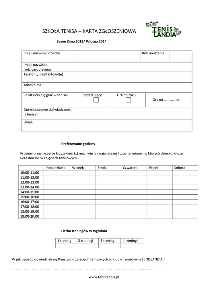 SZKOŁA TENISA – KARTA ZGŁOSZENIOWA Sezon Zima 2013/ Wiosna 2014 Imię i nazwisko dziecka Rok urodzenia Imię i nazwisko rodzica/opiekuna Telefon(y) kontaktowy(e) Adres e-mail Ile lat uczy się grać w tenisa? Początkujący Gra od roku Gra od ………… lat Dotychczasowe doświadczenia z tenisem Uwagi Preferowane godziny Prosimy o zaznaczenie krzyżykiem (x) możliwie jak największej liczby terminów, w których dziecko może uczestniczyć w zajęciach tenisowych. Poniedziałek Wtorek Środa Czwartek Piątek 10:00-11:00 11:00-12:00 12:00-13:00 13:00-14:00 14:00-15:00 15:00-16:00 16:00-17:00 17:00-18:00 18:00-19:00 19:00-20:00 Liczba treningów w tygodniu 1 trening 2 treningi 3 treningi 4 treningi W jaki sposób dowiedzieli się Państwo o zajęciach tenisowych w Klubie Tenisowym TENISLANDIA ? ………………………………………………………………………………………………………………………………............................ www.tenislandia.pl Sobota