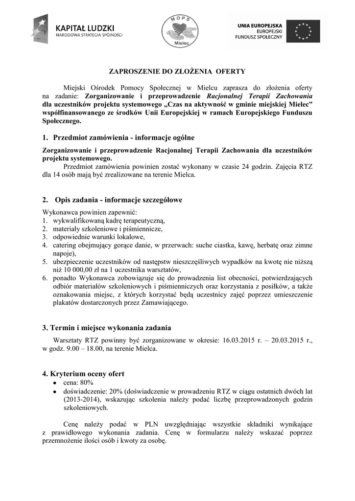 ZAPROSZENIE DO ZŁOŻENIA OFERTY Miejski Ośrodek Pomocy Społecznej w Mielcu zaprasza do złożenia oferty na zadanie: Zorganizowanie i przeprowadzenie Racjonalnej Terapii Zachowania dla uczestników projektu systemowego ,,Czas na aktywność w gminie miejskiej Mielec” współfinansowanego ze środków Unii Europejskiej w ramach Europejskiego Funduszu Społecznego. 1. Przedmiot zamówienia - informacje ogólne Zorganizowanie i przeprowadzenie Racjonalnej Terapii Zachowania dla uczestników projektu systemowego. Przedmiot zamówienia powinien zostać wykonany w czasie 24 godzin. Zajęcia RTZ dla 14 osób mają być zrealizowane na terenie Mielca. 2. Opis zadania - informacje szczegółowe Wykonawca powinien zapewnić: 1. wykwalifikowaną kadrę terapeutyczną, 2. materiały szkoleniowe i piśmiennicze, 3. odpowiednie warunki lokalowe, 4. catering obejmujący gorące danie, w przerwach: suche ciastka, kawę, herbatę oraz zimne napoje), 5. ubezpieczenie uczestników od następstw nieszczęśliwych wypadków na kwotę nie niższą niż 10 000,00 zł na 1 uczestnika warsztatów, 6. ponadto Wykonawca zobowiązuje się do prowadzenia list obecności, potwierdzających odbiór materiałów szkoleniowych i piśmienniczych oraz korzystania z posiłków, a także oznakowania miejsc, z których korzystać będą uczestnicy zajęć poprzez umieszczenie plakatów dostarczonych przez Zamawiającego. 3. Termin i miejsce wykonania zadania Warsztaty RTZ powinny być zorganizowane w okresie: 16.03.2015 r. – 20.03.2015 r., w godz. 9.00 – 18.00, na terenie Mielca. 4. Kryterium oceny ofert cena: 80% doświadczenie: 20% (doświadczenie w prowadzeniu RTZ w ciągu ostatnich dwóch lat (2013-2014), wskazując szkolenia należy podać liczbę przeprowadzonych godzin szkoleniowych. Cenę należy podać w PLN uwzględniając wszystkie składniki wynikające z prawidłowego wykonania zadania. Cenę w formularzu należy wskazać poprzez przemnożenie ilości osób i kwoty za osobę. 5. Inne istotne warunki zadania Prosimy, aby oferta Wykonawcy zawierała: 1. wypełniony formularz oferty (załącznik nr 1), 2. harmonogram oraz program zajęć RTZ, 3. kserokopie zaświadczeń dokumentujących doświadczenie kadry wyznaczonej do prowadzenia zajęć, 4. aktualny odpis (lub kserokopię potwierdzoną za zgodność z oryginałem) z właściwego rejestru lub aktualne zaświadczenie o wpisie do ewidencji działalności gospodarczej. Uwaga: 1. Zamawiający zastrzega sobie prawo po wyborze oferty możliwości zwiększenia lub zmniejszenia ilości osób biorących udział w zajęciach (z tolerancją do 2 osób). W takim przypadku cena ogólna będzie mnożnikiem ilości osób i kwoty za osobę przedstawionej w formularzu oferty. 2. Wykonawca powinien posiadać wpis do rejestru instytucji szkoleniowych. 6. Termin składania ofert Ofertę należy złożyć do dnia 20.02.2015 r., do godz. 15.00, w sekretariacie MOPS w Mielcu, ul. Łukasiewicza 1c, pokój nr 29. 7. Sposób przygotowania oferty Oferta powinna być sporządzona w formie pisemnej w języku polskim i złożona w siedzibie zamawiającego osobiście lub drogą pocztową w zaklejonej kopercie z napisem: ,,Oferta na realizację RTZ”. 7. Uwagi 1. Oferty, które nie zostaną złożone na druku przygotowanym wg załącznika nr 1, nie będą rozpatrywane. 2. Druk formularza ofertowego (załącznik nr 1) będzie udostępniony w wersji edytora tekstowego Word na stronie internetowej MOPS Mielec: http://www.mops.mielec.pl/ oraz stronie internetowej projektu: www.mops.mielec.pl/efs 3. Niniejsze zaproszenie nie jest zamówieniem i otrzymanie od Państwa oferty nie powoduje żadnych zobowiązań wobec strony. 4. Informacja o wynikach wyboru zostanie umieszczona na stronie internetowej MOPS Mielec oraz projektu nie później niż w terminie 7 dni od daty terminu końcowego składania ofert. 5. W razie ewentualnych wątpliwości prosimy o kontaktowanie się z pracownikami biura projektowego w pokoju nr 18, tel. 17 581 82 78 lub w pokoju nr 2, tel. 17 581 82 62. załącznik nr 1 do zaproszenia do złożenia oferty w ramach zadania: ,,Zorganizowanie i przeprowadzenie Racjonalnej Terapii Zachowania dla uczestników projektu systemowego ,,Czas na aktywność w gminie miejskiej Mielec” współfinansowanego ze środków Unii Europejskiej w ramach EFS”. Formularz ofertowy Dane dotyczące wykonawcy Nazwa: ................................................ Siedziba: ................................................ Adres poczty elektronicznej: ................................................ Strona internetowa: ................................................ Numer telefonu: ............................................... Numer faksu: .............................................. Dane dotyczące zamawiającego Miejski Ośrodek Pomocy Społecznej 39-300 Mielec ul. Łukasiewicza 1c Po zapoznaniu się z zapytaniem ofertowym składam swoją ofertę na zadanie:: Zorganizowanie i przeprowadzenie Racjonalnej Terapii Zachowania dla uczestników projektu systemowego ,,Czas na aktywność w gminie miejskiej Mielec” współfinansowanego ze środków Unii Europejskiej w ramach Europejskiego Funduszu Społecznego: 1/ Składam ofertę na: Zorganizowanie i przeprowadzenie Racjonalnej Terapii Zachowania dla 14 osób uczestników projektu systemowego. Oferuję wykonanie w/w zadania w cenie brutto:……………………………………..………… słownie:……………………………………………………………………………….………… Oferuję cenę brutto za 1 osobę: :.................................................................................................. słownie: ........................................................................................................................................ 2/ Doświadczenie trenera RTZ w realizacji usługi odpowiadającej tematyce przedmiotu zamówienia w ciągu ostatnich dwóch lat: l.p. imię i nazwisko trenera R