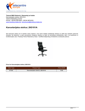 Telenet M&S Network | Namestaj za hotele Kancelarijska stolica | BG101A Telenet Marketing Center Phone: +38164 9874264; +38164 9874232; www.booking-hotels.biz; [email protected] Kancelarijska stolica | BG101A Set executive stolica sa tri razlicite visine naslona I dve sirine sedista predstavlja resenje za veliki broj razlicitih poslovnih situacija. Sa klasicnim, a ipak savremenim dizajnom idealne su kako za kancelariju predsednika, tako i za boardroom ili konferencijsku salu. Poseduju Flame Retardancy Class 1 sertifikat italijanskog ministarstva unutrasnjih poslova. Price for Kancelarijska stolica | BG101A Index Type Product Type Price (EUR) 67194 Kancelarijska stolica | BG101A 0.00 page 1 / 1