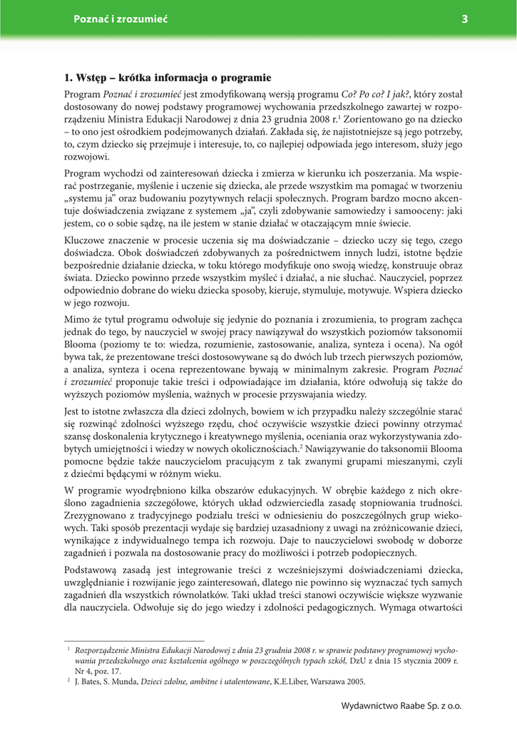 3 Poznać i zrozumieć 1. Wstęp – krótka informacja o programie Program Poznać i zrozumieć jest zmodyfikowaną wersją programu Co? Po co? I jak?, który został dostosowany do nowej podstawy programowej wychowania przedszkolnego zawartej w rozporządzeniu Ministra Edukacji Narodowej z dnia 23 grudnia 2008 r.1 Zorientowano go na dziecko – to ono jest ośrodkiem podejmowanych działań. Zakłada się, że najistotniejsze są jego potrzeby, to, czym dziecko się przejmuje i interesuje, to, co najlepiej odpowiada jego interesom, służy jego rozwojowi. Program wychodzi od zainteresowań dziecka i zmierza w kierunku ich poszerzania. Ma wspierać postrzeganie, myślenie i uczenie się dziecka, ale przede wszystkim ma pomagać w tworzeniu „systemu ja” oraz budowaniu pozytywnych relacji społecznych. Program bardzo mocno akcentuje doświadczenia związane z systemem „ja”, czyli zdobywanie samowiedzy i samooceny: jaki jestem, co o sobie sądzę, na ile jestem w stanie działać w otaczającym mnie świecie. Kluczowe znaczenie w procesie uczenia się ma doświadczanie – dziecko uczy się tego, czego doświadcza. Obok doświadczeń zdobywanych za pośrednictwem innych ludzi, istotne będzie bezpośrednie działanie dziecka, w toku którego modyfikuje ono swoją wiedzę, konstruuje obraz świata. Dziecko powinno przede wszystkim myśleć i działać, a nie słuchać. Nauczyciel, poprzez odpowiednio dobrane do wieku dziecka sposoby, kieruje, stymuluje, motywuje. Wspiera dziecko w jego rozwoju. Mimo że tytuł programu odwołuje się jedynie do poznania i zrozumienia, to program zachęca jednak do tego, by nauczyciel w swojej pracy nawiązywał do wszystkich poziomów taksonomii Blooma (poziomy te to: wiedza, rozumienie, zastosowanie, analiza, synteza i ocena). Na ogół bywa tak, że prezentowane treści dostosowywane są do dwóch lub trzech pierwszych poziomów, a analiza, synteza i ocena reprezentowane bywają w minimalnym zakresie. Program Poznać i zrozumieć proponuje takie treści i odpowiadające im działania, które odwołują się także do wyższych poziomów myślenia, ważnych w procesie przyswajania wiedzy. Jest to istotne zwłaszcza dla dzieci zdolnych, bowiem w ich przypadku należy szczególnie starać się rozwinąć zdolności wyższego rzędu, choć oczywiście wszystkie dzieci powinny otrzymać szansę doskonalenia krytycznego i kreatywnego myślenia, oceniania oraz wykorzystywania zdobytych umiejętności i wiedzy w nowych okolicznościach.2 Nawiązywanie do taksonomii Blooma pomocne będzie także nauczycielom pracującym z tak zwanymi grupami mieszanymi, czyli z dziećmi będącymi w różnym wieku. W programie wyodrębniono kilka obszarów edukacyjnych. W obrębie każdego z nich określono zagadnienia szczegółowe, których układ odzwierciedla zasadę stopniowania trudności. Zrezygnowano z tradycyjnego podziału treści w odniesieniu do poszczególnych grup wiekowych. Taki sposób prezentacji wydaje się bardziej uzasadniony z uwagi na zróżnicowanie dzieci, wynikające z indywidualnego tempa ich rozwoju. Daje to nauczycielowi swobodę w doborze zagadnień i pozwala na dostosowanie pracy do możliwości i potrzeb podopiecznych. Podstawową zasadą jest integrowanie treści z wcześniejszymi doświadczeniami dziecka, uwzględnianie i rozwijanie jego zainteresowań, dlatego nie powinno się wyznaczać tych samych zagadnień dla wszystkich równolatków. Taki układ treści stanowi oczywiście większe wyzwanie dla nauczyciela. Odwołuje się do jego wiedzy i zdolności pedagogicznych. Wymaga otwartości 1 2 Rozporządzenie Ministra Edukacji Narodowej z dnia 23 grudnia 2008 r. w sprawie podstawy programowej wychowania przedszkolnego oraz kształcenia ogólnego w poszczególnych typach szkół, DzU z dnia 15 stycznia 2009 r. Nr 4, poz. 17. J. Bates, S. Munda, Dzieci zdolne, ambitne i utalentowane, K.E.Liber, Warszawa 2005. Wydawnictwo Raabe Sp. z o.o. 4 Poznać i zrozumieć i refleksyjności, zwiększa poczucie odpowiedzialności za podejmowane działania. Nauczyciel przestaje być osobą „realizującą program”, staje się kreatywnym uczestnikiem procesu edukacji powierzonych mu dzieci. Istotna jest umiejętność ich obserwacji, reagowanie na to, jakie dzieci są i analizowanie tego, co się dzieje w grupie. O doborze treści decyduje nauczyciel na podstawie diagnozy aktualnego oraz potencjalnego poziomu rozwoju dzieci. Nauczyciel powinien brać pod uwagę indywidualne tempo rozwoju każdego podopiecznego, zróżnicowanie zainteresowań, osobowości, stylów uczenia się, a także zróżnicowanie środowiskowe i kulturowe dzieci pozostających pod jego opieką. Oczywiście nie wyklucza to potrzeby znajomości uniwersalnych zasad i stadiów rozwojowych. Wiedza ta jest podstawą pracy pedagogicznej nauczyciela, określa jego wyobrażenia i oczekiwania odnośnie tego, co chce osiągnąć. W programie uczenie ujmuje się całościowo. Nie można tego procesu dzielić na poszczególne działy. Dlatego miejsce tradycyjnych sfer rozwoju zajęły obszary tematyczne, których dobór wynika z przyjętych założeń teoretycznych. Starano się uwzględnić to, jak dziecko się uczy, jak przetwarza informacje, a więc wychodzi się od tego, co bliskie dziecku, a następnie przechodzi ku dalszemu środowisku, zmierza się od konkretu ku abstrakcji. Dziecko nie jest izolowane od świata. Świat – w szerokim znaczeniu tego słowa – czynnie na nie wpływa oraz podlega jego wpływom. O doborze zagadnień dokonywanym przez nauczyciela decyduje bliskość środowisk, w jakich dziecko żyje lub których wpływom w sposób pośredni jest poddane. Wybrane zagadnienia dotyczą spraw, które są ważne w życiu dziecka, które je obchodzą. Proponowane w programie treści są połączeniem różnych płaszczyzn edukacji, zaspakajają zarówno fizyczne, jak i poznawcze i emocjonalno-społeczne potrzeby dziecka. Taka konstrukcja jest zgodna z całościowym charakterem ro