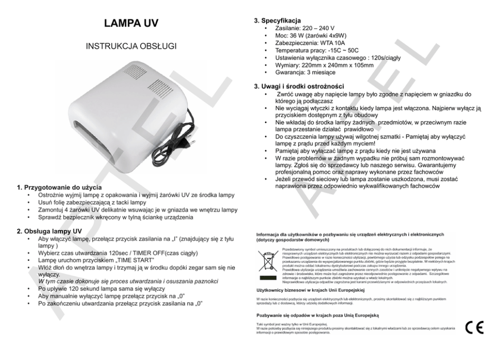 LAMPA UV INSTRUKCJA OBSŁUGI 3. Specyfikacja • • • • • • • Zasilanie: 220 – 240 V Moc: 36 W (żarówki 4x9W) Zabezpieczenia: WTA 10A Temperatura pracy: -15C ~ 50C Ustawienia wyłącznika czasowego : 120s/ciągły Wymiary: 220mm x 240mm x 105mm Gwarancja: 3 miesiące 3. Uwagi i środki ostrożności • • • • • • • 1. Przygotowanie do użycia • • • • Ostrożnie wyjmij lampę z opakowania i wyjmij żarówki UV ze środka lampy Usuń folię zabezpieczającą z tacki lampy Zamontuj 4 żarówki UV delikatnie wsuwając je w gniazda we wnętrzu lampy Sprawdź bezpiecznik wkręcony w tylną ściankę urządzenia 2. Obsługa lampy UV • • • • • • • Aby włączyć lampę, przełącz przycisk zasilania na „I” (znajdujący się z tyłu lampy ) Wybierz czas utwardzania 120sec / TIMER OFF(czas ciągły) Lampę uruchom przyciskiem „TIME START” Włóż dłoń do wnętrza lampy i trzymaj ją w środku dopóki zegar sam się nie wyłączy. W tym czasie dokonuje się proces utwardzania i osuszania paznokci Po upływie 120 sekund lampa sama się wyłączy Aby manualnie wyłączyć lampę przełącz przycisk na „0” Po zakończeniu utwardzania przełącz przycisk zasilania na „0” Zwróć uwagę aby napięcie lampy było zgodne z napięciem w gniazdku do którego ją podłączasz Nie wyciągaj wtyczki z kontaktu kiedy lampa jest włączona. Najpierw wyłącz ją przyciskiem dostępnym z tyłu obudowy Nie wkładaj do środka lampy żadnych przedmiotów, w przeciwnym razie lampa przestanie działać prawidłowo Do czyszczenia lampy używaj wilgotnej szmatki - Pamiętaj aby wyłączyć lampę z prądu przed każdym myciem! Pamiętaj aby wyłączać lampę z prądu kiedy nie jest używana W razie problemów w żadnym wypadku nie próbuj sam rozmontowywać lampy. Zgłoś się do sprzedawcy lub naszego serwisu. Gwarantujemy profesjonalną pomoc oraz naprawy wykonane przez fachowców Jeżeli przewód sieciowy lub lampa zostanie uszkodzona, musi zostać naprawiona przez odpowiednio wykwalifikowanych fachowców