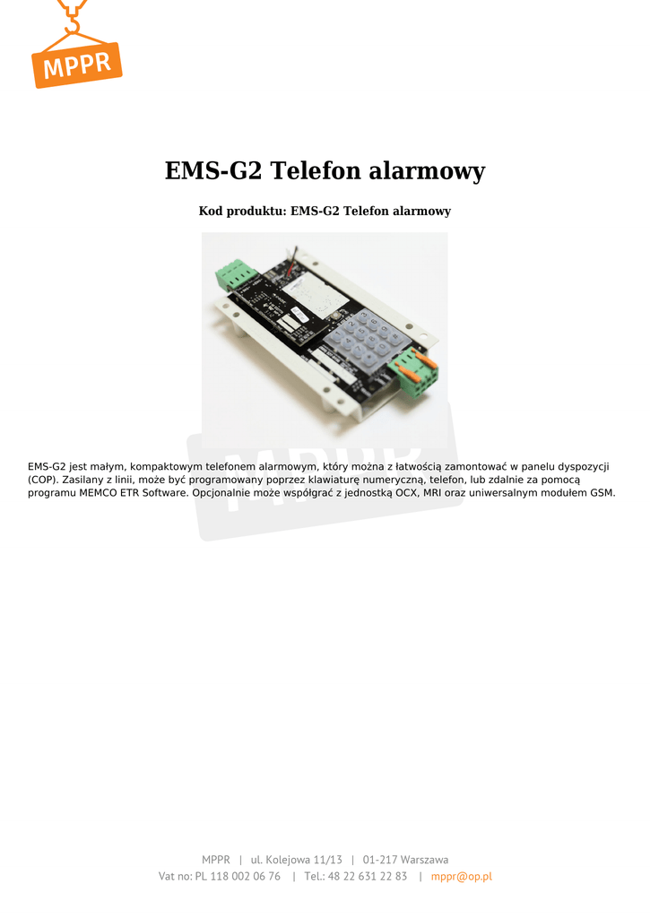 EMS-G2 Telefon alarmowy Kod produktu: EMS-G2 Telefon alarmowy EMS-G2 jest małym, kompaktowym telefonem alarmowym, który można z łatwością zamontować w panelu dyspozycji (COP). Zasilany z linii, może być programowany poprzez klawiaturę numeryczną, telefon, lub zdalnie za pomocą programu MEMCO ETR Software. Opcjonalnie może współgrać z jednostką OCX, MRI oraz uniwersalnym modułem GSM.