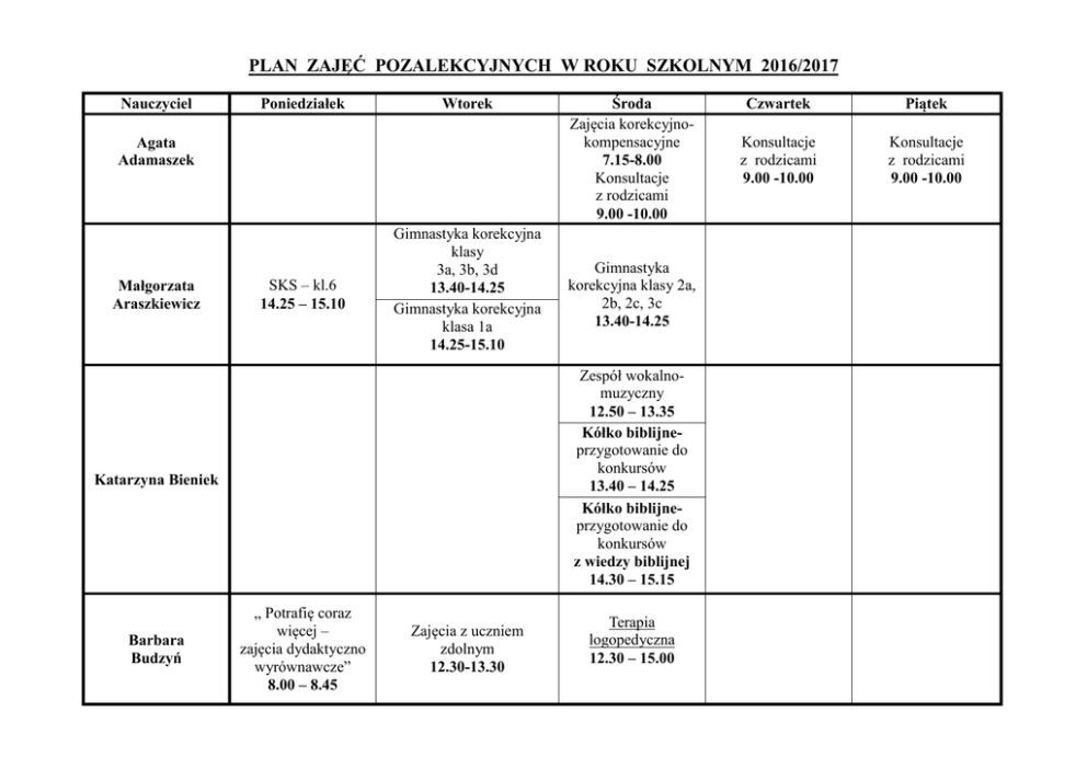 PLAN ZAJĘĆ POZALEKCYJNYCH W ROKU SZKOLNYM 2016/2017