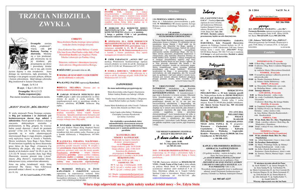 ZAŚWIADCZENIA PODATKOWE INCOME TAX. Jesteśmy w trakcie przygotowywania zaświadczeń podatkowych. Prosimy parafian, którzy w ostatnim czasie zmienili miejsce zamieszkania o poinformowanie nas o nowym adresie. Można to uczynić telefonicznie lub wypełnić zieloną formę, która znajduje się w przedsionku kościoła i wrzucić na tacę. TRZECIA NIEDZIELA ZWYKŁA ZEBRANIE DLA RODZICÓW DZIECI PRZYSTĘPUJĄCYCH DO PIERWSZEJ KOMUNII ŚWIĘTEJ odbędzie się w niedzielę, 2 lutego o godzinie 17:00 w sali parafialnej. Obecność rodziców obowiązkowa. CHRZTY E Ewangelia zawiera dobrą „wiadomość”, więcej, cała jest Radosną Nowiną o zbawieniu. Możemy się o tym przekonać, gdy otworzymy się na jej działanie; gdy przyjmujemy jej słowo i pozwalamy działać mu w nas, gdy swoim życiem dajemy o nim świadectwo. Jezus domaga się nawrócenia, żąda przemiany, bo każdego z nas pragnie uczynić pełnym, dobrym i bożym człowiekiem. Ideał takiego człowieka Bóg zrealizował w Jezusie Chrystusie. I czyt.: Iz 9.1-4 II czyt.: 1 Kor 1.10-13-14 Ewangelia: Mt 4,12-23 Psalm responsoryjny: Pan moim światlem i zbawieniem moim. „JEZUS” ZNACZY „BÓG ZBAWIA” Mocą działania Ducha świętego i przez polanie wodą dar chrztu świętego otrzyma: Zoey Katherine Stec córka Melissa i Casimir Ella Jane Evans-MacCharles córka Julii i Chad Maximillian Barabas syn Angelica i Piotra Nikolas Lekarczyk syn Pauliny i Greg RÓŻANIEC prowadzi róża nr. 61. ROZKŁAD SZAFARZY I LEKTORÓW jest do odebrania w zakrystii. Na KAWĘ i PĄCZKI zapraszają Katecheci. SKŁADKA. Zbierana budowę centrum katechetycznego. jest PRZYGOTOWYWUJĄCYCH SIĘ DO SAKRAMENTU BIERZMOWANIA prowadzone będą w następujące czwartki: 6, 13, 20, 27 marca i 3 kwietnia o godz. 20: 00. Zainteresowanych prosimy o kontakt z biurem parafialnym. Przy zapisie wymagane jest świadectwo chrztu. CHÓR PARAFIALNY „AGNUS DEI” pod dyrekcją Włodzimierza Kochanowskiego zaprasza nowych członków we wtorki do sali Br. Antoniego od godz.20:15-22:00. Inf. Włodzimierz 647 317 4747. Dzieciom, rodzicom i chrzestnym życzymy dużo zdrowia i błogosławieństwa Bożego. DRUGA SPOTKANIA DLA OSÓB DOROSŁYCH na ZARZĄD FUNDACJI DZIECIĘCEJ QUO VADIS pragnie z głębi serca podziękować za ofiary złożone do puszek w zeszłą niedzielę. Dla niepełnosprawnych sierot ze specjalnego ośrodka w Bielawie zebraliśmy $7,720.00. Serdeczne Bóg zapłać. SCHOLA DZIECIĘCA “JUBILEUSZ 2000” zaprasza nowych członków. Próby odbywają się w środy w sali Br. Antoniego od godz. 18:00-20:00. Inf. Włodzimierz 647 317 4747. ZAPOWIEDZI Do stanu małżeńskiego przygotowują się: Maria Krzewińska córka Eugenii i Kazimierza Robert Andrzej Branka syn Jadwigi i Alfreda Natalie Anna Czeluśniak córka Elżbiety i Zbigniewa Daniel Robert Guthro syn Sandry i Charles Joanna Maria Kołodziejczyk córka Urszuli i Tadeusza Kevin John Amarelo syn Marii i Joao Członkowie zespołu RADOŚĆ - JOY serdecznie W wielu miejscach Pisma Świętego czytamy, że Bóg jest ocaleniem i że zbawienie jest bezinteresownym darem Jego miłości i miłosierdzia. Paweł apostoł w tekście o dużym znaczeniu doktrynalnym stwierdza z przekonaniem, że Bóg „pragnie, by wszyscy ludzie zostali zbawieni i doszli do poznania prawdy” (1Tm 2,4) Ta zbawcza wola, która ujawniała się w wielu zdumiewających interwencjach Boga w ciągu dziejów, osiągnęła swój najwyższy wyraz w Jezusie z Nazaretu, Słowie wcielonym, Synu Boga i Synu Maryi. W nim bowiem wypełniły się słowa skierowane przez Jahwe do Jego Sługi: „Ustanowię Cię Światłością dla pogan, aby moje zbawienie dotarło aż do krańców ziemi” (Iz 49, 6: por. Łk 2,31-32) W Jezusie wszystko służy Jego Misji Zbawiciela: noszone przezeń imię („Jezus” znaczy „Bóg zbawia”), wypowiadane słowa, dokonywane czyny, ustanowione sakramenty. Jezus ma pełną świadomość misji, którą powierzył Mu Ojciec: ”Syn Człowieczy przeszedł szukać i zbawić to, co zginęło”. (Łk 19, 10). J.P. II, Castel Gondolfo, 17 IX 1989r. dziękują wszystkim, którzy wsparli Koncert Świąteczny. Specjalne podziękowanie kierujemy pod adresem rodziców, którzy pracując poświęcili dużo swojego wolnego czasu. Bóg zapłać. WYPADEK SAMOCHODOWY. 19 XII, 2013 przy wydarzył świadkiem o kontakt 7444. Krakow Plazza (King Shepherd Plazza) się wypadek samochodowy, którego były dwie polskie osoby. Proszone są one telefoniczny z Władysławem. 647-888- KATOLICKA PORADNIA MAŁŻENSKO RODZINNA. Ilość osób korzystających z naszej przy parafialnej poradni znacznie wzrasta. W związku z tym poszukujemy więcej chętnych, którzy chcieliby społecznie poświęcić swój czas dla naszej poradni. Poszukujemy: psychologa – terapia rodzinna, uzależnienia, prawnika – prawo cywilne i rodzinne, absolwenta studiów o rodzinie – doradztwo życia rodzinnego, nauczyciela naturalnego planowania rodziny oraz nauczyciela naprotechnologi. Zainteresowanych prosimy o kontakt: 416-237-0529. MŁODZIEŻ MYŚLĄCĄ O ŻYCIU KAPŁAŃSKIM I ZAKONNYM serdecznie zapraszamy na rozpoznawczy weekend, który odbędzie się w Buffalo w dniach od 4 -6 kwietnia br. Szczegółowe informacje: o. Mietek 647 973 5192 lub email: [email protected] Anita Capala córka Haliny I Waldemara Christopher Lawrence Ryszkowski syn Janiny i Lawrence Kto wiedziałby o przeszkodach, które uniemożliwiałyby narzeczonym zawarcie sakramentalnego związku małżeńskiego zobowiązany jest w sumieniu poinformować biuro parafialne KATECHEZA 2014 SZKOŁY KATOLICKIE Rozpoczęły się zajęcia z katechezy dla dzieci przygotowujących się do I Komunii Św. : Grupa wtorkowa: godz. 18:30-20:00 Grupa sobotnia: godz. 13:00-14:30 Katecheza dla młodzieży przystępującej do Bierzmowania prowadzona jest w czwartki o 18:30-20:00 BIERZMOWANIE: 3 V - godz. 16:00 ( gr. pol. i ang ) I KOMUNIA ŚW. 10 V ( gr. ang. z wtorku) godz. 16:00 11 V ( gr. pol. z wtorku) godz. 