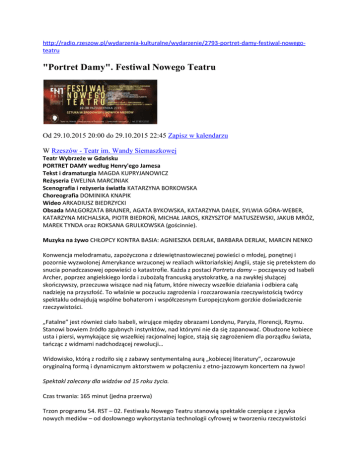 http://radio.rzeszow.pl/wydarzenia-kulturalne/wydarzenie/2793-portret-damy-festiwal-nowegoteatru "Portret Damy". Festiwal Nowego Teatru Od 29.10.2015 20:00 do 29.10.2015 22:45 Zapisz w kalendarzu W Rzeszów - Teatr im. Wandy Siemaszkowej Teatr Wybrzeże w Gdańsku PORTRET DAMY według Henry'ego Jamesa Tekst i dramaturgia MAGDA KUPRYJANOWICZ Reżyseria EWELINA MARCINIAK Scenografia i reżyseria światła KATARZYNA BORKOWSKA Choreografia DOMINIKA KNAPIK Wideo ARKADIUSZ BIEDRZYCKI Obsada MAŁGORZATA BRAJNER, AGATA BYKOWSKA, KATARZYNA DAŁEK, SYLWIA GÓRA-WEBER, KATARZYNA MICHALSKA, PIOTR BIEDROŃ, MICHAŁ JAROS, KRZYSZTOF MATUSZEWSKI, JAKUB MRÓZ, MAREK TYNDA oraz ROKSANA GRULKOWSKA (gościnnie). Muzyka na żywo CHŁOPCY KONTRA BASIA: AGNIESZKA DERLAK, BARBARA DERLAK, MARCIN NENKO Konwencja melodramatu, zapożyczona z dziewiętnastowiecznej powieści o młodej, ponętnej i pozornie wyzwolonej Amerykance wrzuconej w realiach wiktoriańskiej Anglii, staje się pretekstem do snucia ponadczasowej opowieści o katastrofie. Każda z postaci Portretu damy – począwszy od Isabeli Archer, poprzez angielskiego lorda i zubożałą francuską arystokratkę, a na zwykłej służącej skończywszy, przeczuwa wiszące nad nią fatum, które niweczy wszelkie działania i odbiera całą nadzieję na przyszłość. To właśnie w poczuciu zagrożenia i rozczarowania rzeczywistością twórcy spektaklu odnajdują wspólne bohaterom i współczesnym Europejczykom gorzkie doświadczenie rzeczywistości. „Fatalne” jest również ciało Isabeli, wirujące między obrazami Londynu, Paryża, Florencji, Rzymu. Stanowi bowiem źródło zgubnych instynktów, nad którymi nie da się zapanować. Obudzone kobiece usta i piersi, wymykające się wszelkiej racjonalnej logice, stają się zagrożeniem dla porządku świata, tańcząc z widmami nadchodzącej rewolucji… Widowisko, którą z rodziło się z zabawy sentymentalną aurą „kobiecej literatury”, oczarowuje oryginalną formą i dynamicznym aktorstwem w połączeniu z etno-jazzowym koncertem na żywo! Spektakl zalecany dla widzów od 15 roku życia. Czas trwania: 165 minut (jedna przerwa) Trzon programu 54. RST – 02. Festiwalu Nowego Teatru stanowią spektakle czerpiące z języka nowych mediów – od dosłownego wykorzystania technologii cyfrowej w tworzeniu rzeczywistości scenicznej, po przejmowanie właściwych nowym mediom konwencji przedstawieniowych. Ich dopełnieniem są działania artystyczne usytuowane na styku teatru, performansu i sztuk wizualnych, których istotą jest przekraczanie granic pomiędzy różnymi dziedzinami sztuki. Druga edycja Festiwalu Nowego Teatru zostanie zadedykowana Christophowi Schlingensiefowi – zmarłemu w 2010 roku wybitnemu niemieckiemu reżyserowi filmowemu, teatralnemu, operowemu, który był nie tylko prawdziwym artystą totalnym, negującym granice między różnymi obszarami i gatunkami sztuki, ale też ironicznym dekonstruktorem narodowych mitów i bezkompromisowym komentatorem współczesnych społeczeństw europejskich zamienionych we „wspólnoty konsumentów”. Kontekst twórczości Schlingensiefa wyznaczy nadrzędny temat tegorocznej edycji, zawarty w pytaniu o SUMIENIE ARTYSTY – jego rolę w nowoczesnym, postdemokratycznym społeczeństwie. Stąd w programie festiwalu znajdą się spektakle wchodzące w bezkompromisowy dialog z rzeczywistością, zaangażowane w budzenie uśpionych sumień współczesnych konsumentów kultury, ale i portretujące samych artystów. Do udziału w konkursie zostało zaproszonych osiem zespołów teatralnych z: Narodowy Stary Teatr z Krakowa (nie-boska komedia. WSZYSTKO POWIEM BOGU! Pawła Demirskiego), Teatr Polski z Wrocławia (PODRÓŻ ZIMOWA Elfriede Jelinek) , Teatr Wybrzeże z Gdańska (PORTRET DAMY wg powieści Henry’ego Jamesa), Teatr Żydowski z Warszawy (AKTORZY ŻYDOWSCY Michała Buszewicza), Teatr Polski z Bydgoszczy (AFRYKA Agnieszki Jakimiak), Teatr im. W. Bogusławskiego z Kalisza (KLĘSKI W DZIEJACH MIASTA Agnieszki Jakimiak), Teatr im. C.K. Norwida z Jeleniej Góry (KARSKIEGO HISTORIA NIEPRAWDZIWA Szymona Bogacza), Teatr im. L. Solskiego z Tarnowa (GRAŻYNA Adama Mickiewicza). Tradycyjnie też premierowy spektakl przygotuje gospodarz festiwalu – Teatr im. Siemaszkowej (będzie to multimedialna realizacja KURKI WODNEJ Witkacego w reżyserii Jana Nowary, ze złowieszczym podtytułem: KATASTROFA JEST CORAZ BLIŻEJ). Łącznie podczas festiwalu zostanie zaprezentowanych aż 9 spektakli konkursowych, ocenianych – tak jak w ubiegłym roku – przez jury złożone z młodych krytyków i artystów. Zostanie zaprezentowany nowy skład reżyserów, którzy decydują obecnie o obliczu współczesnego polskiego teatru, w tym wyjątkowo silną reprezentację kobiet. Swoje najnowsze spektakle pokażą: Ewelina Marciniak, Julia Mark, Anna Smolar, Monika Strzępka, Bartosz Frąckowiak, Paweł Miśkiewicz, a także – znani już rzeszowskiej publiczności – Weronika Szczawińska i Radek Rychcik. W programie pojawią się też inne formy prezentacji sztuki teatru – szkice sceniczne współczesnych polskich dramatów. Po pięciu latach przerwy wrócono również do organizacji Multimedia Szajna Festiwalu, którego idea współbrzmi z obecnym profilem RST, zorientowanych na teatr tworzony pod wpływem estetyki nowych mediów. Na jego program złoży się instalacja USTAWA ZASADNICZA (przygotowana przez Pracownię Transmediów ASP w Krakowie) oraz warsztaty multimedialne dla młodzieży CIAŁO JAKO EKRAN (projekt znanego rzeszowskiej publiczności Jakuba Falkowskiego). Na finał (poza konkursem) zostanie zaprezentowany spektakl LEW NA ULICY, przygotowany przez tegorocznych absolwentów Wydziału Aktorskiego PWST im. Ludwika Solskiego (filia we Wrocławiu). Zgodnie z głównym założeniem festiwalu, obecność najmłodszego pokolenia artystów – dopiero rozpoczynających swoją przygodę z zawodowym teatrem – powinna być stałym elementem programu, dedyk