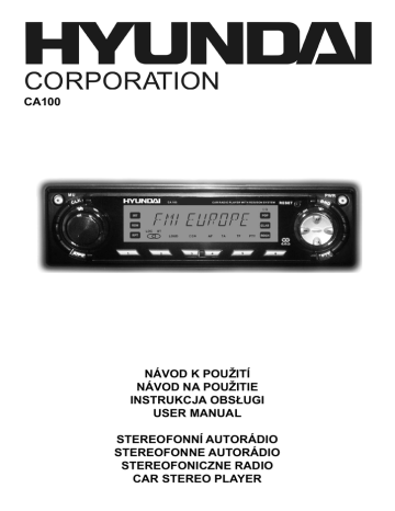 CA100 NÁVOD K POUŽITÍ NÁVOD NA POUŽITIE INSTRUKCJA OBSŁUGI USER MANUAL STEREOFONNÍ AUTORÁDIO STEREOFONNE AUTORÁDIO STEREOFONICZNE RADIO CAR STEREO PLAYER Stereofonní autorádio s tunerem FM a RDS Přečtěte si prosím pozorně tento návod a před prvním použitím se se svým novým rádiem seznamte. Návod uschovejte k pozdějšímu nahlédnutí. OBSAH (A).Umístění ovládacích prvků (B).Vlastnosti (C).Údržba (D).Návod k použití (E).Technické specifikace (F).Řešení problémů (A)UMÍSTĚNÍ OVLÁDACÍCH PRVKŮ 1. TLAČÍTKO ZAPNUTÍ A VYPNUTÍ 2. TLAČÍTKO VOLBY FUNKCÍ: BASS (Basy)/TREBLE (Výšky)/BALANCE (Pravolevé vyvážení)/ FADER (Předozadní vyvážení)/TA SEEK (Vyhledání dopr. zprav.)/MASK DPI (Filtr DPI)/AUDIO DSP (Ekvalizér)/LOUDNESS (Zvýraznění zvuku)/BEEP (Pípnutí)/SEEK (Vyhledávání)/STE REO (Stereo)/LOCAL (Místní stanice)/VOL LAST (Poslední hlasitost)/(SEL) (Volba) 3. ZVÝŠENÍ / SNÍŽENÍ HLASITOSTI pro basy, výšky, pravolevé vyvážení a předozadní vyvážení (+/-) 4. PŘEDNASTAVENÉ STANICE (1, 2, 3, 4, 5 a 6) 5. FUNKCE „AF“ (ALTERNATIVNÍ FREKVENCE) 6. FUNKCE „TA“ (DOPRAVNÍ HLÁŠENÍ) 7. FUNKCE „PTY“ (TYP PROGRAMU) 8. TLAČÍTKO DISPLEJE/HODIN (CLK) 9. TLAČÍTKO ZTLUMENÍ (MU) 10.TLAČÍTKO PÁSMA (BND) 11. TLAČÍTKO AUTOMATICKÉHO NEBO MANUÁLNÍHO LADĚNÍ (ZVYŠOVÁNÍ NEBO SNIŽOVÁNÍ FREKVENCE) 12. LCD DISPLEJ 13. TLAČÍTKO AUTOMATICKÉHO VYHLEDÁNÍ A NALADĚNÍ STANIC (A/PS) 14.RESETOVACÍ TLAČÍTKO (RESET) (B) VLASTNOSTI Přístroj má nesnímatelný čelní panel, přehrává stereo FM a má následující vlastnosti: • Automatické vyhledání a uložení nejlepších (nejsilnějších) stanic v pořadí dle síly jejich signálu (AS) • Elektronické ovládání hlasitosti, basů, výšek, předozadního a pravolevého vyvážení • Přesné elektronické ladění stanic se synchronizací fázovým závěsem (PLL) • Programovatelných 36 přednastavených stanic (vždy 6 pro FM1, FM2 a FM3) • Kontrola hlasitosti, manuální nebo automatické vyhledávání, ladění směrem nahoru nebo dolů • Přepínač pásem pro FM1, FM2 a FM3 • Ovládání displeje (frekvence, název stanice, typ programu, hodiny) • Funkce hodin v RDS • Osvětlovací systém • Funkce RDS: PI (Identifikace programu) TA (Dopravní hlášení) PS (Programová služba) PTY (Typ programu) AF (Alternativní frekvence) TP (Dopravní zpravodajství) CZ - CZ KONEKTOR ISO Sekce baterie (A) 7 - žlutá (záloha) 5 - výstup auto antény 3 - nepoužito 1 - nepoužito Sekce reproduktorů (B) 7 - zelená (ZL+) 5 - bílá (PL+) 3 - šedá (PP+) 1 - fialová (ZP+) 8 - černá (uzemnění) 6 - nepoužito 4 - červená (ACC) 2 - nepoužito 8 - zelená/černá (ZL-) 6 - bílá/černá (PL-) 4 - šedá/černá (PP-) 2 - fialová/černá (ZP-) Poznámka: 7-kolíkový konektor A musí být připojen přes klíč zapalování, aby nedošlo k vybití baterie, pokud se automobil delší dobu nepoužívá. (C) ÚDRŽBA VÝMĚNA POJISTEK Pokud se pojistka spálí, zkontrolujte připojení napájení a pojistku vyměňte. Pokud se pojistka znovu spálí i po její výměně, může jít o vnitřní závadu. V takovém případě se obraťte na nejbližší servisní středisko. Upozornění Pro každý vodič použijte pojistku pro příslušný proud. Použití pojistky pro vyšší proud může způsobit vážné poškození. UMÍSTĚNÍ A FUNKCE OVLÁDACÍCH PRVKŮ CZ - 1. TLAČÍTKO ZAPNUTÍ A VYPNUTÍ 2. TLAČÍTKO VOLBY FUNKCÍ: BASS (Basy)/TREBLE (Výšky)/BALANCE (Pravolevé vyvážení)/ FADER (Předozadní vyvážení)/TA SEEK (Vyhledání dopr. zprav.)/MASK DPI (Filtr DPI)/AUDIO DSP (Ekvalizér)/LOUDNESS (Zvýraznění zvuku)/BEEP (Pípnutí)/SEEK (Vyhledávání)/STE REO (Stereo)/LOCAL (Místní stanice)/VOL LAST (Poslední hlasitost)/(SEL) (Volba) 3. ZVÝŠENÍ / SNÍŽENÍ HLASITOSTI pro basy, výšky, pravolevé vyvážení a předozadní vyvážení (+/-) 4. PŘEDNASTAVENÉ STANICE (1, 2, 3, 4, 5 a 6) 5. FUNKCE „AF“ (ALTERNATIVNÍ FREKVENCE) 6. FUNKCE „TA“ (DOPRAVNÍ HLÁŠENÍ) 7. FUNKCE „PTY“ (TYP PROGRAMU) 8. TLAČÍTKO DISPLEJE/HODIN (CLK) 9. TLAČÍTKO ZTLUMENÍ (MU) 10.TLAČÍTKO PÁSMA (BND) 11. TLAČÍTKO AUTOMATICKÉHO NEBO MANUÁLNÍHO LADĚNÍ (ZVYŠOVÁNÍ NEBO SNIŽO VÁNÍ FREKVENCE) 12.LCD DISPLEJ 13.TLAČÍTKO AUTOMATICKÉHO VYHLEDÁNÍ A NALADĚNÍ STANIC (A/PS) 14.RESETOVACÍ TLAČÍTKO (RESET) (D) NÁVOD K POUŽITÍ 1. ZAPNUTÍ/VYPNUTÍ Stisknutím tohoto tlačítka (1) se přístroj zapíná a vypíná. Přístroj lze také zapnout stisknutím jakéhokoliv jiného tlačítka. 2. SEL (Volba) 3. OVLÁDÁNÍ HLASITOSTI (+/-) Pomocí ovladače hlasitosti můžete nastavit úroveň hlasitosti i vybrat jiné funkce. Tiskněte krátce tlačítko SEL (2), dokud se na displeji neobjeví požadovaná funkce. Obrázek 1 ukazuje sekvenci funkcí, které lze vybrat pomocí tlačítka SEL. Obr. 1 Výběr funkcí ovládání zvuku 1. HLASITOST 2. VOLBA 3. BASY 4. VÝŠKY 5. PRAVOLEVÉ VYVÁŽENÍ 6. PŘEDOZADNÍ VYVÁŽENÍ Zvýšení hlasitosti (+) a snížení hlasitosti (–). Hlasitost můžete nastavit otáčením ovladače hlasitosti. Lze jej také použít k nastavení basů (BASS), výšek (TREBLE), pravolevého vyvážení (BAL) a předozadního vyvážení (FAD). TA SEEK / TA ALARM (2) (Vyhledání dopravních informací / Upozornění na dopravní hláše ní) Pokud podržíte tlačítko SEL (2) nejméně 2 sekundy, přístroj se přepne do režimu volby této funkce. Režim TA SEEK nebo TA ALARM nastavíte ovladačem hlasitosti. CZ - CZ Režim TA SEEK (Vyhledání dopravních informací): Pokud nově naladěná stanice nepřijme do 5 sekund dopravní informace, přeladí se rádio na další stanici, která nemá stejné PI jako předchozí stanice, ale vysílá dopravní informace. V režimu TA SEEK se může aktuální stanice přeladit na zcela jinou, protože přístroj vyhle