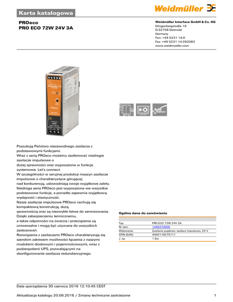 Karta katalogowa PROeco PRO ECO 72W 24V 3A Weidmüller Interface GmbH & Co. KG Klingenbergstraße 16 D-32758 Detmold Germany Fon: +49 5231 14-0 Fax: +49 5231 14-292083 www.weidmueller.com Poszukują Państwo niezawodnego zasilacza z podstawowymi funkcjami. Wraz z serią PROeco możemy zaoferować niedrogie zasilacze impulsowe o dużej sprawności oraz wyposażone w funkcje systemowe. Let's connect. W szczególności w seryjnej produkcji maszyn zasilacze impulsowe o charakterystyce górującej nad konkurencją, udowodniają swoje wyjątkowe zalety. Niedroga seria PROeco jest wyposażona we wszystkie podstawowe funkcje, a ponadto zapewnia wyjątkową wydajność i elastyczność. Nasze zasilacze impulsowe PROeco cechują się kompaktową konstrukcją, dużą sprawnością oraz są niezwykle łatwe do serwisowania. Dzięki zabezpieczeniu termicznemu, a także odporności na zwarcia i przeciążenia są uniwersalne i mogą być używane do wszystkich zastosowań. Rozwiązania z zasilaczami PROeco charakteryzują się szerokim zakresem możliwości łączenia z naszymi modułami diodowymi i pojemnościowymi, wraz z podzespołami UPS, pozwalającymi na skonfigurowanie zasilacza redundancyjnego. Ogólne dane do zamówienia Typ Nr zam. Wykonanie GTIN (EAN) J. op. PRO ECO 72W 24V 3A 1469470000 Zasilanie prądowe, zasilacz impulsowy, 24 V 4050118275711 1 Szt. Data sporządzenia 30 czerwca 2016 12:10:45 CEST Aktualizacja katalogu 20.06.2016 / Zmiany techniczne zastrzeżone 1 Karta katalogowa PROeco PRO ECO 72W 24V 3A Weidmüller Interface GmbH & Co. KG Klingenbergstraße 16 D-32758 Detmold Germany Fon: +49 5231 14-0 Fax: +49 5231 14-292083 www.weidmueller.com Dane techniczne Wymiary i ciężary Szerokość Wysokość Głębokość Waga netto 34 mm 125 mm 100 mm 578 g Szerokość (cale) Wysokość (cale) Głębokość (cale) 1,339 inch 4,921 inch 3,937 inch -25 °C...70 °C Temperatura magazynowania -40 °C...85 °C Częstotliwość wejściowa Pobór prądu DC 47...63 Hz 0,22 A @ 370 V DC / 0,68 A @ 120 V DC złącze śrubowe 80…370 V DC (derating @ 120 V DC) 2 A / DI, bezpiecznik 6 A, char. B, bezpiecznik 2...4 A, char. C, bezpiecznik Temperatury Temperatura pracy Wejście Bezpiecznik wejściowy (wewnętrzny) Pobór prądu AC Początkowy prąd rozruchowy Zakres częstotliwości AC Zakres napięć zasilania AC Znamionowe napięcie wejściowe Tak 0,55 A @ 230 V AC / 1,04 A @ 110 V AC max. 40 A 47...63 Hz 85…264 V AC (redukcja przy 100 V AC) 100...240 V AC (wejście szerokopasmowe) Technika przyłączeniowa [wejście] Zakres napięcia wejściowego DC Zalecane zabezpieczenie wstępne Moc wyjściowa Napięcie wyjściowe Obciążenie pojemnościowe Wyjście Ciągły prąd wyjścia przy UWartość znamionowa Możliwość łączenia równoległego Napięcie wyjściowe Ochrona przeciwprzeciążeniowa Technika przyłączeniowa [wyjście] Znamionowe napięcie wyjściowe czas narastania 3 A @ 55 °C, 2,25 A @ 70 °C tak, maks. 5 22...28 V (ustawiane potencjometrem) Tak złącze śrubowe 24 V DC ± 25 % ≤ 100 ms 72 W 24 V nieograniczony Ochrona przed napięciem zwrotnym Tak Tętnienia resztkowe, wartości szczytowe < 50 mVSS @ 24 V DC, IN włączenia Znamionowy prąd wyjściowy @ Uznam 3 A przy 55 °C Data sporządzenia 30 czerwca 2016 12:10:45 CEST Aktualizacja katalogu 20.06.2016 / Zmiany techniczne zastrzeżone 2 Karta katalogowa PROeco PRO ECO 72W 24V 3A Weidmüller Interface GmbH & Co. KG Klingenbergstraße 16 D-32758 Detmold Germany Fon: +49 5231 14-0 Fax: +49 5231 14-292083 www.weidmueller.com Dane techniczne Informacje ogólne MTBF Moc tracona, obciążenie znamionowe Ochrona przeciw napięciom zwrotnym z obciążenia Ochrona przed zwarciem Prąd upłynnościowy doziemny, maks. Stopień ochrony Temperatura pracy Współczynnik mocy (ok.) > 500.000 h wg IEC 1709 (SN29500) 9,5 W 30…35 V DC Tak 3,5 mA IP20 -25 °C...70 °C > 0,5 @ 230 V AC / > 0,53 @ 115 V AC Moc tracona, bieg jałowy Mostkowanie przy awarii sieci @ Iznam Ochrona przed nadmierną temperaturą Położenie montażowe, wskazówka montażowa Sprawność Sygnalizacja Wersja obudowy max. dop. wilgotność powietrza (praca) 4W > 100 ms @ 230 V AC / > 20 ms @ 115 V AC Tak poziomo, na szynę nośną TS 35 87 % Zielona dioda LED (Uwyjściowe > 21,6 V DC), Żółta dioda LED (Iwyjściowy > 90% IWartość znamionowa typ. ), Czerwona dioda LED (przeciążenie, przegrzanie, zwarcie, Uwyjściowe < 20,4 V DC) metal, odporna na korozję 5 %…95 % RH PA52_4 EMV / udar / wibracja Emisja zakłóceń według EN55022 Klasa B Ograniczenie wyższych harmonicznych prądu zgodnie z wymaganiami EN 61000-3-2 Wytrzymałość udarowa IEC 60068-2-2715 g we wszystkich kierunkach Odporność na wibracje IEC 60068-2-6 1 g wg EN50178 Badanie odporności na zakłócenia EN 61000-4-2 (wyład. według elektrostat.), EN 61000-4-3 (sygnały radiowe), EN 61000-4-4 (impulsy), EN 61000-4-5 (przepięcia), EN 61000-4-6 (zaburzenia przewodzone), EN61000-4-8 (Fields), EN61000-4-11 (Dips) Izolacja wyjście napięciowe / uziemienie0,5 kV Napięcie izolacji wejście / wyjście 3 kV Koordynacja izolacji Izolacja wejście napięciowe / uziemienie2 kV Klasa ochrony I, z przyłączem PE Stopień zanieczyszczenia 2 Bezpieczeństwo elektryczne (stosowane normy) Bezpieczna separacja / ochrona przed porażeniem prądem elektrycznym Napięcie bezpieczne Transformatory ochronne do zasilaczy impulsowych VDE0100-410 / wg DIN57100-410 SELV wg EN60950, PELV wg EN60204 IEC61558-2-16 Elektryczne wyposażenie maszyn według EN60204 Ochrona przed niebezpiecznymi prądami upływowymi Wg VDE0106-101 Wyposażenie w elektroniczne środki według EN50178 / eksploatacyjne VDE0160 Data sporządzenia 30 czerwca 2016 12:10:45 CEST Aktualizacja katalogu 20.06.2016 / Zmiany techniczne zastrzeżone 3 Karta katalogowa PROeco PRO ECO 72W 24V 3A Weidmüller Interface GmbH & Co. KG Klingenbergstraße 16 D-32758 Detmold Germany Fon: +49 5231 14-0 Fax: +49 5231 14-292083 www.weidmueller.com Dane techniczne Dane pod
