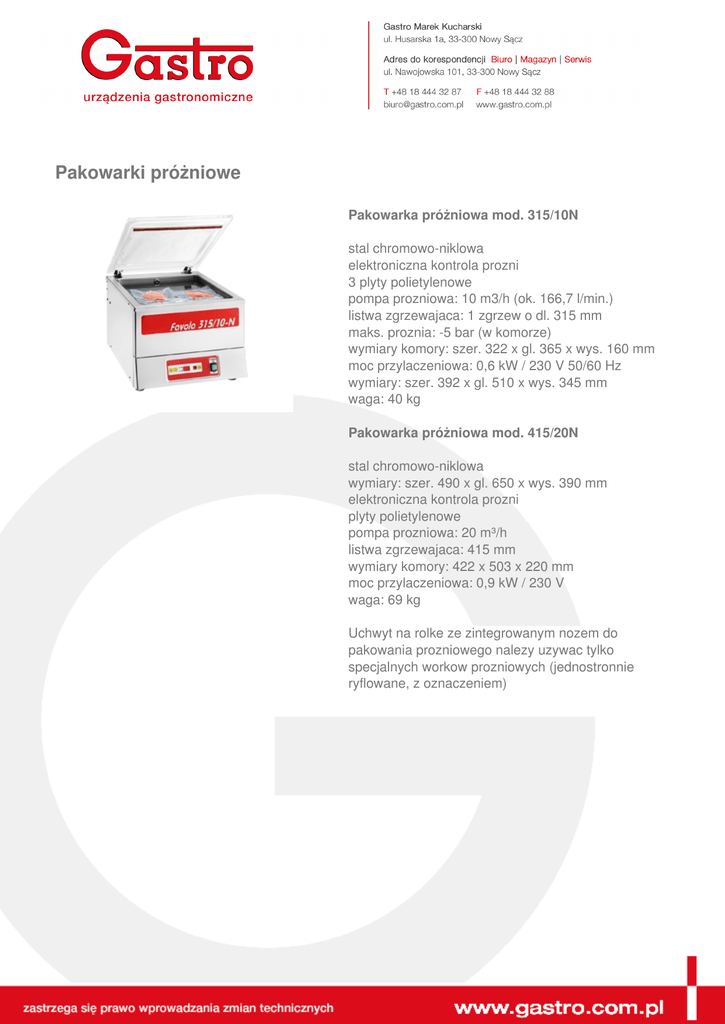 Pakowarki próżniowe Pakowarka próżniowa mod. 315/10N stal chromowo-niklowa elektroniczna kontrola prozni 3 plyty polietylenowe pompa prozniowa: 10 m3/h (ok. 166,7 l/min.) listwa zgrzewajaca: 1 zgrzew o dl. 315 mm maks. proznia: -5 bar (w komorze) wymiary komory: szer. 322 x gl. 365 x wys. 160 mm moc przylaczeniowa: 0,6 kW / 230 V 50/60 Hz wymiary: szer. 392 x gl. 510 x wys. 345 mm waga: 40 kg Pakowarka próżniowa mod. 415/20N stal chromowo-niklowa wymiary: szer. 490 x gl. 650 x wys. 390 mm elektroniczna kontrola prozni plyty polietylenowe pompa prozniowa: 20 m³/h listwa zgrzewajaca: 415 mm wymiary komory: 422 x 503 x 220 mm moc przylaczeniowa: 0,9 kW / 230 V waga: 69 kg Uchwyt na rolke ze zintegrowanym nozem do pakowania prozniowego nalezy uzywac tylko specjalnych workow prozniowych (jednostronnie ryflowane, z oznaczeniem)