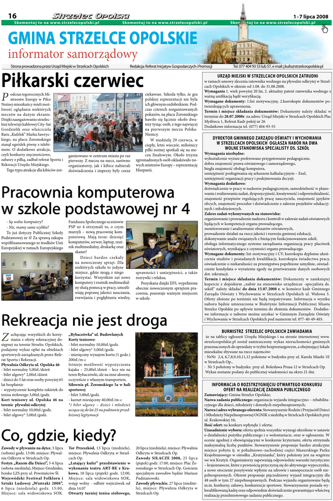 16 1 - 7 lipca 2008 Skomentuj to na w w w.strzelecopolski.pl Skomentuj to na w w w.strzelecopolski.pl Skomentuj to na w w w.strzelecopolski.pl GMINA STRZELCE OPOLSKIE informator samorządowy Strona prowadzona przez Urząd Miejski w Strzelcach Opolskich Redakcja: Referat Inicjatyw Gospodarczych i Promocji Piłkarski czerwiec P odczas tegorocznych Mistrzostw Europy w Piłce Nożnej mieszkańcy mieli możliwość oglądania niektórych meczów na dużym ekranie. Dzięki zaangażowaniu strzeleckiej telewizji kablowej City-Sat Gordzielik oraz właściciela Baru „Kufelek” Marka Sawryckiego, na placu Żeromskiego stanął ogródek piwny z telebimem. O dodatkowe atrakcje, czyli konkursy zręcznościowe, zabawy z piłką, zadbał referat Sportu i Rekreacji Urzędu Miejskiego. Tego typu atrakcje dla kibiców zor- ganizowano w centrum miasta po raz pierwszy. Z meczu na mecz, zarówno organizatorzy, jak i kibice nabierali doświadczenia i imprezy były coraz ciekawsze. Szkoda tylko, że gra polskiej reprezentacji nie była ich głównym ozdobnikiem. Podczas czterech zorganizowanych pokazów, na placu Żeromskiego bawiło się łącznie około dwatrzy tysiąc osób, z tego najwięcej na pierwszym meczu PolskaNiemcy. W niedzielę 29 czerwca, w ciepły, letni wieczór, miłośnicy piłki nożnej spotkali się na meczu finałowym. Około trzysta zgromadzonych osób oklaskiwało nowych mistrzów Europy – reprezentację Hiszpanii. Pracownia komputerowa w szkole podstawowej nr 4 - Są wolne komputery? - Nie, mamy same szybkie! To już dotyczy Publicznej Szkoły Podstawowej nr 4! Za sprawą zakupu współfinansowanego ze środków Unii Europejskiej w ramach Europejskiego Funduszu Społecznego uczniowie PSP nr 4 otrzymali to, o czym marzyli – nową pracownię komputerową. Mają teraz: dziesięć komputerów, serwer, laptop, rzutnik multimedialny, drukarkę oraz skaner! Dzieci bardzo czekały na nowoczesny sprzęt. Dla niektórych szkoła to jedyne miejsce, gdzie mogą z niego korzystać. Wszystkim zaś nowe komputery i rzutnik multimedialny służą pomocą w pracy, umożliwiają poprawę jakości nauczania, rozwijania i pogłębiania wiedzy, sprawności i umiejętności, a także rozrywki i relaksu. Pozyskana dzięki EFS, wypełniona obecnie nowoczesnym sprzętem pracownia, pozostaje ważnym miejscem w szkole. Rekreacja nie jest droga Z achęcając wszystkich do korzystania z oferty rekreacyjnej dostępnej na terenie Strzelec Opolskich, podajemy wykaz opłat na obiektach sportowych zarządzanych przez Referat Sportu i Rekreacji. Pływalnia Odkryta ul. Opolska 46 - bilet normalny 5,00zł./dzień - bilet ulgowy* 2,00zł./dzień - dzieci do 5 lat oraz osoby powyżej 65 lat bezpłatnie - wypożyczenie kompletu rakietek do tenisa stołowego 3,00zł./godz. Kort tenisowy ul. Opolska 46 na terenie pływalni odkrytej - bilet normalny 10,00zł./godz. - bilet ulgowy* 5,00zł./godz. „Rybaczówka” ul. Budowlanych Korty tenisowe: - bilet normalny 10,00zł./godz. - bilet ulgowy* 5,00zł./godz. - miesięczny wynajem kortu (1 godz.) 200zł./m-c Istnieje możliwość wypożyczenia kajaka – 25,00zł./dzień – lecz nie na teren Rybaczówki, ale na inne akweny, oczywiście z własnym transportem. Siłownia pl. Żeromskiego 5a w hali sportowej - bilet 5,00zł./godz. - karnet miesięczny 40,00zł./m-c *) bilet ulgowy – dzieci i młodzież ucząca się do lat 25 na podstawie przedłożonej legitymacji Tor Przeszkód, 13 lipca (niedziela), miejsce: Pływalnia Odkryta w Strzelcach Op. „Latający kufer” przedstawienie w wykonaniu teatru ART-RE z Krakowa, 18 lipca (piątek) godz. 12:00, Miejsce: sala widowiskowa SOK, wstęp wolny - odbiór wejściówek od dnia 14.07 Otwarty turniej tenisa stołowego, Urząd Miejski w Strzelcach Opolskich zatrudni w ramach umowy zlecenia ratownika wodnego na pływalni odkrytej w Strzelcach Opolskich w okresie od 1.08. do 31.08.2008. Wymagania 1. wiek powyżej 20 lat, 2. aktualny patent ratownika wodnego z ważną unifikacją bądź weryfikacją. Wymagane dokumenty: 1.list motywacyjny, 2.kserokopie dokumentów potwierdzających uprawnienia. Termin i miejsce składania dokumentów: Dokumenty należy składać w terminie do 28.07.2008r. na adres: Urząd Miejski w Strzelcach Opolskich Plac Myśliwca 1, Referat Kadr pokój nr 26 Dodatkowe informacja tel. (077) 404-93-55 Dyrektor Gminnego Zarządu Oświaty i Wychowania w Strzelcach Opolskich ogłasza nabór na dwa wolne stanowiska specjalisty ds. szkół Wymagania niezbędne: wykształcenie wyższe preferowane przygotowanie pedagogiczne, dobra znajomość prawa oświatowego i samorządowego, biegła znajomość obsługi komputera, umiejętność posługiwania się arkuszem kalkulacyjnym – Exel, umiejętność organizacji pracy i podejmowania decyzji. Wymagania dodatkowe: doświadczenie w pracy w nadzorze pedagogicznym, samodzielność w planowaniu i realizowaniu zadań, dyspozycyjność, kreatywność i odpowiedzialność, znajomość przepisów regulujących pracę nauczyciela, znajomość języków obcych, znajomość procedur i doświadczenie z zakresu projektów edukacyjnych i młodzieżowych. Zakres zadań wykonywanych na stanowisku: organizowanie i prowadzenie nadzoru i kontroli w zakresie zadań oświatowych będących w kompetencji organu prowadzącego, monitorowanie i analizowanie obszarów oświatowych, prowadzenie działań na rzecz jakości i rozwoju gminnej edukacji, dokonywanie analiz związanych z bieżącym funkcjonowaniem szkół, obsługa informatycznego systemu zarządzania organizacją pracy placówek oświatowych, wynikająca z czynności organu prowadzącego. Wymagane dokumenty: list motywacyjny i CV, kserokopia dyplomu ukończenia studiów i posiadanych kwalifikacji, kserokopia świadectwa pracy, oświadczenie o niekaralności za przestępstwa popełnione umyślnie, oświadczenie kandydata o wyrażeniu zgody na przetwarzanie danych osobowych dot. rekrutacji. Termin i miejsce składania dokumentów: Dokumenty w 