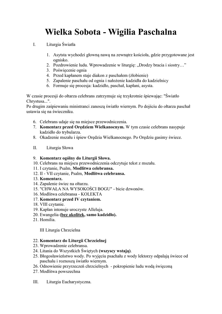 Wielka Sobota - Wigilia Paschalna I. Liturgia Światła 1. Asytsta wychodzi głowną nawą na zewnątrz kościoła, gdzie przygotowane jest ognisko. 2. Pozdrowienie ludu. Wprowadzenie w liturgię: „Drodzy bracia i siostry…” 3. Poświęcenie ognia 4. Przed kapłanem staje diakon z paschałem (żłobienie) 5. Zapalenie paschału od ognia i nałożenie kadzidła do kadzielnicy 6. Formuje się procesja: kadzidło, paschał, kapłani, asysta. W czasie procesji do ołtarza celebrans zatrzymuje się trzykrotnie śpiewając: "Światło Chrystusa...". Po drugim zaśpiewaniu ministranci zanoszą światło wiernym. Po dojściu do ołtarza paschał ustawia się na świeczniku. 6. Celebrans udaje się na miejsce przewodniczenia. 7. Komentarz przed Orędziem Wielkanocnym. W tym czasie celebrans nasypuje kadzidło do trybularza. 8. Okadzenie mszału i śpiew Orędzia Wielkanocnego. Po Orędziu gasimy świece. II. Liturgia Słowa 9. Komentarz ogólny do Liturgii Słowa. 10. Celebrans na miejscu przewodniczenia odczytuje tekst z mszału. 11. I czytanie, Psalm, Modlitwa celebransa. 12. II - VII czytanie, Psalm, Modlitwa celebransa. 13. Komentarz. 14. Zapalenie świec na ołtarzu. 15. "CHWAŁA NA WYSOKOŚCI BOGU" - bicie dzwonów. 16. Modlitwa celebransa - KOLEKTA 17. Komentarz przed IV czytaniem. 18. VIII czytanie. 19. Kapłan intonuje uroczyste Alleluja. 20. Ewangelia (bez akolitek, samo kadzidło). 21. Homilia. III Liturgia Chrzcielna 22. Komentarz do Liturgii Chrzcielnej 23. Wprowadzenie celebransa. 24. Litania do Wszystkich Świętych (wszyscy wstają). 25. Błogosławieństwo wody. Po wyjęciu psachału z wody lektorzy odpalają świece od paschalu i roznoszą światło wiernym. 26. Odnowienie przyrzeczeń chrzcielnych - pokropienie ludu wodą święconą 27. Modlitwa powszechna III. Liturgia Eucharystyczna.