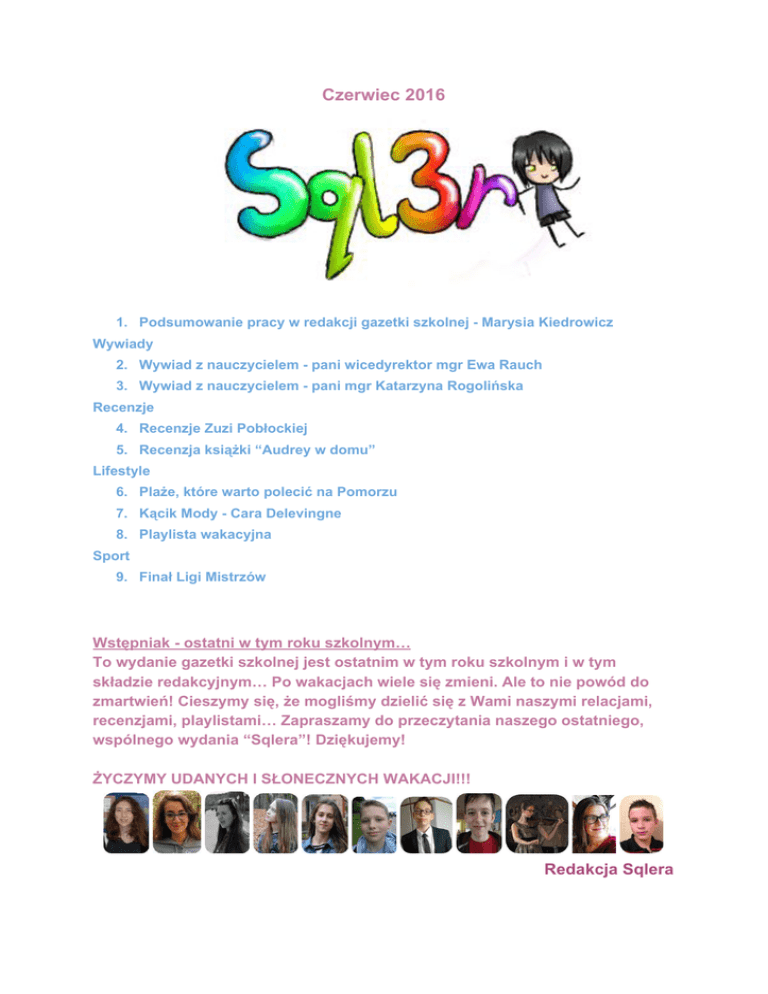 Czerwiec 2016 1. Podsumowanie pracy w redakcji gazetki szkolnej Marysia Kiedrowicz Wywiady 2. Wywiad z nauczycielem pani wicedyrektor mgr Ewa Rauch 3. Wywiad z nauczycielem pani mgr Katarzyna Rogolińska Recenzje 4. Recenzje Zuzi Pobłockiej 5. Recenzja książki “Audrey w domu” Lifestyle 6. Plaże, które warto polecić na Pomorzu 7. Kącik Mody Cara Delevingne 8. Playlista wakacyjna Sport 9. Finał Ligi Mistrzów Wstępniak ostatni w tym roku szkolnym… To wydanie gazetki szkolnej jest ostatnim w tym roku szkolnym i w tym składzie redakcyjnym… Po wakacjach wiele się zmieni. Ale to nie powód do zmartwień! Cieszymy się, że mogliśmy dzielić się z Wami naszymi relacjami, recenzjami, playlistami… Zapraszamy do przeczytania naszego ostatniego, wspólnego wydania “Sqlera”! Dziękujemy! ŻYCZYMY UDANYCH I SŁONECZNYCH WAKACJI!!! Redakcja Sqlera Podsumowanie redaktor naczelnej: Marysi Kiedrowicz Wszystko, co dobre, kiedyś się kończy. Doszłam do tego wniosku, kiedy zorientowałam się, że to ostatnie wydanie gazetki szkolnej w tym składzie redakcyjnym. Nie mogę uwierzyć, że ten czas tak szybko upłynął. Dużo się działo przez te półtora roku pracy nad każdym wydaniem “Sqlera”. Od stycznia 2015 roku do teraz opracowałam aż 90 artykułów w tym m.in. 18 wywiadów, 14 Kącików Mody, 14 relacji, 11 playlist, 9 recenzji… Pisanie sprawiało i nadal sprawia mi wielką przyjemność. Jestem bardzo wdzięczna Panu Markowi Pauli, który zaproponował mi pracę w redakcji. Dzięki niemu mogłam rozwijać swoją pasję i robić to, co kocham. Dziękuję Panu za wsparcie, podsuwanie pomysłów i satysfakcję z pracy nad gazetką. Dużo się nauczyłam przez ten czas i spędziłam najlepsze piątki na spotkaniach redakcji w gronie cudownych ludzi. Dziękuję Kubie Kass i Dawidowi Florkowi za rozbawianie mnie do łez, Zuzi Przeniosło i Weronice Szymańskiej za wspólną pracę nad artykułami, Zuzi Pobłockiej za liczne recenzje, Michałowi Karczewskiemu za poprawianie mi humoru i wszystkim, którzy przyczyniali się do powstawania kolejnych numerów gazetki. Dziękuję też Wam, czytelnikom, bo to dla Was pisaliśmy nasze artykuły! Mam nadzieję, że podobały się Wam wydania gazetki i że każdy znalazł w nich coś dla siebie. Myślę, że bycie redaktorką naczelną gazetki to jedna z najlepszych rzeczy, jaka mi się przytrafiła. Będzie mi tego bardzo brakowało w liceum, ale jestem pewna, że nowa redakcja gazetki będzie kontynuować pracę pod okiem Pana Marka. PS Na koniec mogę Wam zdradzić, że to ja pisałam wszystkie wstępniaki w imieniu redakcji ;) Opracowała: Marysia Kiedrowicz Wywiad z nauczycielem pani wicedyrektor mgr Ewa Rauch Oto wywiad z panią wicedyrektor Ewą Rauch, która mimo dużej ilości pracy i obowiązków znalazła czas, aby odpowiedzieć na kilka moich pytań. Zapraszam do przeczytania wywiadu. 1. Dlaczego postanowiła Pani zostać nauczycielką? Właściwie powinnam zacząć od tradycji rodzinnych. Cała moja rodzina zarówno ze strony mamy jak i taty to nauczyciele, również moje dwie siostry są nauczycielkami (uczą matematyki). Od dzieciństwa przesiąkałam atmosferą szkoły. Odkąd sięgnę pamięcią zawsze kogoś uczyłam. Najpierw były to moje koleżanki i koledzy z klasy Uwielbiałam uczyć, tłumaczyć. Mogę śmiało powiedzieć, że zawód nauczyciela wybrałam z zamiłowania. Nie wyobrażam sobie życia bez pracy z moimi uczniami, ponieważ wiem, że jest to moje powołanie. W szkole pracuję już 30 lat i obce jest mi tzw. „wypalenie zawodowe”. Moi uczniowie przez cały czas inspirują mnie do działania. Staram się pokazywać, że matematyka to nie straszny potwór, ale ciekawy świat, który warto zgłębić. 2. Który przedmiot lubiła Pani w szkole najbardziej, a który najmniej? W liceum zdecydowanie były to przedmioty ścisłe Mniej przykładałam się do przedmiotów humanistycznych, ale nie mogę powiedzieć, że ich nie lubiłam, no może poza plastyką – rysunki nie były moją mocną stroną. 3. Kiedy zainteresowała się Pani matematyką? Matematyką zainteresowałam się w drugiej klasie liceum, dzięki wspaniałemu profesorowi, który przygotował mnie do olimpiady matematycznej, odniosłam sukces, rozwijałam swoje matematyczne zainteresowania i po skończeniu liceum wybrałam studia matematyczne. 4. Jakie jest Pani hobby? Moje hobby to głównie brydż i żagle. Mówi się, że brydż nie jest grą w karty to gra przy pomocy kart. Uczy logicznego myślenia i koncentracji – polecam wszystkim. Natomiast moja przygoda z żeglarstwem zaczęła się na studiach. Od pierwszego rejsu po Jeziorach Mazurskich żeglarstwo stało się moją wielką pasją. 5. Jakie ma Pani motto życiowe ? Chciałabym móc powiedzieć „wszystko co zrobiłam w życiu, zrobiłam najlepiej jak potrafiłam”. 6. Jakie są Pani najważniejsze wartości w życiu? Nie będę chyba oryginalna – najważniejsza jest dla mnie rodzina, zdrowie, miłość, przyjaźń, wiara, praca...… Wywiad z nauczycielem pani mgr Katarzyna Rogolińska Przedstawiam Wam jeden z dwóch ostatnich wywiadów w tym roku szkolnym. Na moje pytania odpowiedziała jedyna nauczycielka od muzyki w naszej szkole, przemiła pani Katarzyna Rogolińska. 1. Kiedy zainteresowała się Pani muzyką? W wieku 5 lat rodzice zaprowadzili mnie na zajęcia baletowe. W wieku 6 lat zapisali mnie na rytmikę do szkoły muzycznej i wtedy zafascynowało mnie piękne, połyskliwe pianino oraz dźwięki z niego płynące, dzięki pani prowadzącej zajęcia… Potem wszystko potoczyło się szybko: szkoła muzyczna (cała młodość), a w finale Akademia Muzyczna w Gdańsku (wspaniały okres w moim życiu). 2. Którego artystę ceni Pani najbardziej ? Nie potrafię wybrać jednego. Jest tylu wybitnie utalentowanych artystów prezentujących różne style i gatunki muzyczne w swojej twórczości… Podam kilkunastu: Rafał Blechacz, Christina Aguilera, Sting, Chr