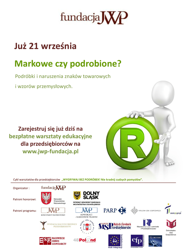 Już 21 września Markowe czy podrobione? Podróbki i naruszenia znaków towarowych i wzorów przemysłowych. Zarejestruj się już dziś na bezpłatne warsztaty edukacyjne dla przedsiębiorców na www.jwp-fundacja.pl Cykl warsztatów dla przedsiębiorców „WYGRYWAJ BEZ PODRÓBEK! Nie kradnij cudzych pomysłów”. Organizator : Patroni honorowi: Marszałek Województwa Mazowieckiego Patroni programu: Mazowiecka Izba Rzemiosła i Przedsiębiorczości Dolnośląska Izba Gospodarcza PRELEGENCI: Joanna Janoszek Krajowy i europejski rzecznik patentowy Kancelaria Rzeczników Patentowych JWP Anna Hoffman - Flatow Radca prawny, rzecznik patentowy Kancelaria Rzeczników Patentowych JWP To już drugie w tym roku spotkanie przedsiębiorców z ekspertami ds. własności intelektualnej w ramach cyklu warsztatów edukacyjnych „ Wygrywaj bez podróbek!- Nie kradnij cudzych pomysłów.” 21 WRZEŚNIA br. zapraszamy na spotkanie do sali konferencyjnej w Dolnośląskiej Izbie Gospodarczej, gdzie będziemy poruszać aspekty podrobionych znaków towarowych oraz wzorów przemysłowych. Na spotkaniu chcemy uświadomić przedsiębiorcom, że przed podróbkami można się bronić, można z tym procederem walczyć i dochodzić swoich praw. Cykl spotkań dla przedsiębiorców ma służyć podnoszeniu świadomości dot. szkodliwości podróbek i konsekwencji prawnych związanych z naruszeniami praw wyłącznych. Organizatorem warsztatów jest Fundacja JWP Masz Pomysł? Masz Patent. Masz Zysk!, a wiedzę merytoryczną dostarczają eksperci z: Kancelarii Rzeczników Patentowych JWP. TEMAT WARSZTATÓW: „Markowe czy podrobione?- podróbki i naruszenia znaków towarowych i wzorów przemysłowych” MIEJSCE SPOTKANIA: Wrocław, Dolnośląska Izba Gospodarcza, ul. Świdnicka 39 DATA I GODZINA: 21 września 2012, godz. 11.00-15.00 DLA KOGO: Mali i średni przedsiębiorcy PROGRAM SPOTKANIA: 11:00-12:30 • Działania Fundacji JWP Masz Pomysł? Masz Patent. Masz Zysk! • Znak towarowy i wzór przemysłowy - definicja, rodzaje, klasyfikacja, ochrona terytorialna • Prawa własności intelektualnej w przedsiębiorstwie – znak towarowy i wzór przemysłowy jako przedmiot obrotu • Podróbka czy nie? Definicja podrobionych znaków towarowych i naruszeń wzorów przemysłowych • Zakres uprawnień wynikający z posiadanych praw wyłącznych 12:30-12:45 • Przerwa kawowa 12:50-15:00 • Współpraca z organami celnymi w celu wzmocnienia ochrony praw własności intelektualnej w przedsiębiorstwie. Ochrona na granicy. • Czyny nieuczciwej konkurencji w świetle ustawy o zwalczaniu nieuczciwej konkurencji • Podróbki i naruszenia pław własności intelektualnej studium przypadku • Ochrona cywilnoprawna i karnoprawna w oparciu o prawo ochronne do znaku towarowego Organizatorzy dołożą wszelkich starań, aby spotkanie konferencyjnoszkoleniowe odbyło się zgodnie z prezentowanym programem, jednak zastrzegamy sobie możliwość częściowych zmian. www.jwp-fundacja.pl [email protected]
