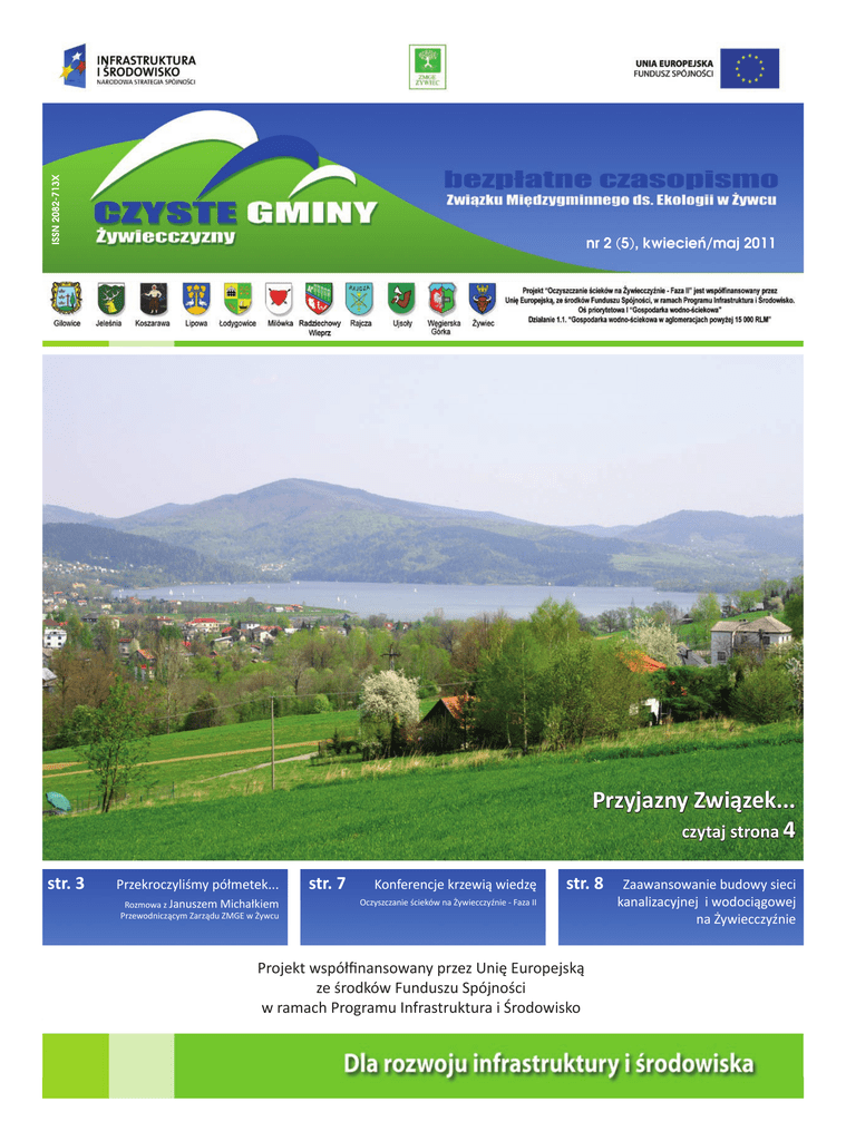 nr 2 (5), kwiecień/maj 2011 Przyjazny Związek... czytaj strona 4 str. 3 Przekroczyliśmy półmetek... Rozmowa z Januszem Michałkiem Przewodniczącym Zarządu ZMGE w Żywcu str. 7 Konferencje krzewią wiedzę str. 8 Oczyszczanie ścieków na Żywiecczyźnie - Faza II Zaawansowanie budowy sieci kanalizacyjnej i wodociągowej na Żywiecczyźnie Projekt współfinansowany przez Unię Europejską ze środków Funduszu Spójności w ramach Programu Infrastruktura i Środowisko Czyste Gminy Żywiecczyzny Projekt współfinansowany przez Unię Europejską ze środków Funduszu Spójności w ramach Programu Infrastruktura i Środowisko 1 Staramy się w każdym numerze „Czystych Gmin Żywiecczyzny” prezentować szeroko jeden z tematów. Tym razem postanowiliśmy przyjrzeć się działalności Związku Międzygminnego ds. Ekologii w Żywcu, czyli instytucji, która zajmuje się wdrażaniem programu „Oczyszczanie ścieków na Żywiecczyźnie”. Warto zaznaczyć, że zespół ZMGE tworzy grupa młodych, energicznych ludzi, pełnych pomysłów i chęci do pracy. Pracują oni wspólnie nad jednym z największych projektów unijnych w Polsce. Kto chociaż raz miał do czynienia z pozyskiwaniem środków unijnych, ten doskonale zdaje sobie sprawę, jak odpowiedzialne to zadanie. Unia Europejska jest hojna, ale bardzo wymagająca pod względem proceduralnym. Tutaj nie ma półśrodków i prowizorycznych rozwiązań, za każde zaniedbanie ponosi się kary, albo wręcz trzeba zwracać przyznane wcześniej pieniądze. Zatem aby wszystko dobrze funkcjonowało potrzebni są ludzie znający się na swojej robocie. I dlatego też, pracownicy ZMGE w Żywcu posiadają stosowne do swoich stanowisk wykształcenie oraz wiedzę fachową. Najważniejsza jest jednak współpraca pomiędzy poszczególnymi działami. Tutaj nie ma licytacji, kto jest ważniejszy, który dział może więcej. Tutaj wszyscy mówią jednym głosem, współpracują ze sobą i wzajemnie się uzupełniają. Najważniejszy jest cel, który należy zrealizować. Wszystko musi się zgadzać, jak w szwajcarskim zegarku. Nad wszystkim czuwa szefostwo, czyli Przewodniczący Zgromadzenia oraz Przewodniczący Zarządu. Ci ludzie pilnują tego, aby proces wdrażania programu przebiegał zgodnie z harmonogramem i by wszystko było dopięte na ostatni guzik. Trzeba sobie jednak zadać pytanie, komu służy Związek Międzygminny ds. Ekologii? Czy jest to organizacja, której celem jest tylko wspieranie działalności samorządów w zakresie budowy kanalizacji i wodociągów? Oczywiście, ZMGE działa w tym kierunku, jednak chyba najważ- K O niejszym celem działalności Związku jest chęć poprawy życia mieszkańców naszego regionu. Stąd też nasz pomysł na pokazanie tego, jak działa ZMGE, kto za co N K odpowiada i kto może nam pomóc rozwiązać nurtujące nas problemy. Oczywiście te dotyczące realizacji Projektu. U R S W poprzednim numerze naszego pisma „Czyste Gminy Żywiecczyzny” ogłosiliśmy konkurs, w którym pytaliśmy jaki obiekt jest widoczny na zdjęciu. Poprawna odpowiedź to b) Okolice Domu Strażaka w Zarzeczu. Spośród wszystkich nadesłanych zgłoszeń wyłoniono trzech zwycięzców konkursu: 1. Anna M. z miejscowości Kamesznica. 2. Marzena F. z miejscowości Cisiec. 3. Joanna H. z miejscowości Świnna. Każdemu zwycięzcy konkursu zostały przesłane drogą pocztową nagrody rzeczowe (materiały promocyjne Związku) w postaci: pendrive’a, zestawu pióro + długopis w eleganckim etui, kalendarza trójdzielnego (wiszący), kalendarza książkowego, smyczy. Serdecznie dziękujemy wszystkim za udział w konkursie, zachęcając jednocześnie do udziału w kolejnym, który ogłaszamy w tym numerze. Budowa sieci kanalizacyjnej i wodociągowej przekroczyła już półmetek. Czy mieszkańcy, mogą jeszcze składać wnioski o podłączenie do sieci? Poza mieszkańcami, których budynki zostały ujęte w dokumentacji projektowej na etapie składania wniosku o dofinansowanie Projektu, występują różnego typu sytuacje dotyczące poszczególnych posesji, gdzie w sposób indywidualny rozpatruje się możliwość przyłączenia do sieci. Dotyczy to m.in. nowych budynków, które powstały już po zamknięciu etapu tworzenia dokumentacji projektowanej sieci wodociągowo-kanalizacyjnej. Mieszkańcy, których posesji nie uwzględniono w dokumentacji technicznej Projektu powinni wypełnić stosowny wniosek o przyłączenie do sieci kanalizacyjnej lub/i wodociągowej. Formularze wniosków są dostępne między innymi na stronie internetowej: www.bip.zmge.zywiec.pl, zakładki: MENU TEMATYCZNE, WNIOSKI O DODATKOWE PRZYŁĄCZA. Istnieje kilka przypadków rozpatrzenia wniosku o dodatkowe przyłączenie do sieci , np.: * mieszkaniec składa wypełniony wniosek, następnie zostaje on przedłożony do analizy Inżynierowi Kontraktu, Wykonawcy Robót oraz odpowiedniemu Urzędowi. Jeżeli po analizie okazuje się, że istnieją możliwości techniczne podłączenia - mieszkaniec zostaje podłączony do sieci; * mieszkaniec składa wypełniony wniosek, jednakże po dokonaniu analizy okazuje się, że nie ma możliwości technicznych do podłączenia , wtedy zlecone zostaje opracowanie dodatkowego projektu, który odpowie czy taki mieszkaniec może ostatecznie zostać podłączony; * mieszkaniec składa wypełniony wniosek , jednak jest on z terenu gdzie została już wykonana sieć w ramach Projektu, wtedy zostaje on skierowany do odpowiedniej spółki operatorskiej (MPWiK Żywiec lub BES Cięcina). Spółka przedstawia warunki podłączenia i w tym przypadku całkowite koszty podłączenia pozostają po stronie zainteresowanego mieszkańca. Szczegółowe informacje na temat dodatkowych przyłączy można uzyskać w siedzibie Związku Międzygminnego ds. Ekologii w Żywcu, Urzędach Gmin oraz biurach Inżynierów Kontraktów. Jakie są koszty przyłączenia do sieci i warunki korzystania z usług wodno-kanalizacyjnych? Koszty przyłącze