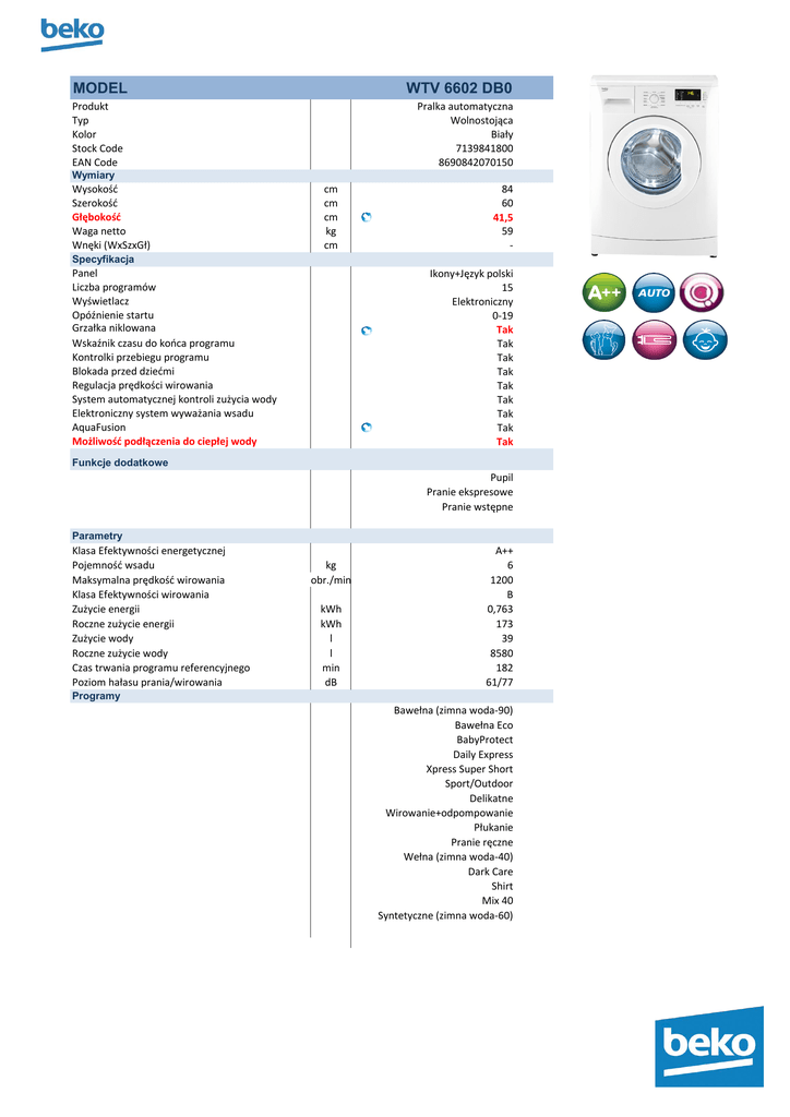 MODEL WTV 6602 DB0 Produkt Typ Kolor Stock Code EAN Code Pralka automatyczna Wolnostojąca Biały 7139841800 8690842070150 Wymiary Wysokość Szerokość Głębokość Waga netto Wnęki (WxSzxGł) cm cm cm kg cm 84 60 41,5 59 - Specyfikacja Panel Liczba programów Wyświetlacz Opóźnienie startu Grzałka niklowana Wskaźnik czasu do końca programu Kontrolki przebiegu programu Blokada przed dziećmi Regulacja prędkości wirowania System automatycznej kontroli zużycia wody Elektroniczny system wyważania wsadu AquaFusion Możliwość podłączenia do ciepłej wody Ikony+Język polski 15 Elektroniczny 0-19 Tak Tak Tak Tak Tak Tak Tak Tak Tak Funkcje dodatkowe Pupil Pranie ekspresowe Pranie wstępne Parametry Klasa Efektywności energetycznej Pojemność wsadu Maksymalna prędkość wirowania Klasa Efektywności wirowania Zużycie energii Roczne zużycie energii Zużycie wody Roczne zużycie wody Czas trwania programu referencyjnego Poziom hałasu prania/wirowania kg obr./min kWh kWh l l min dB A++ 6 1200 B 0,763 173 39 8580 182 61/77 Programy Bawełna (zimna woda-90) Bawełna Eco BabyProtect Daily Express Xpress Super Short Sport/Outdoor Delikatne Wirowanie+odpompowanie Płukanie Pranie ręczne Wełna (zimna woda-40) Dark Care Shirt Mix 40 Syntetyczne (zimna woda-60)