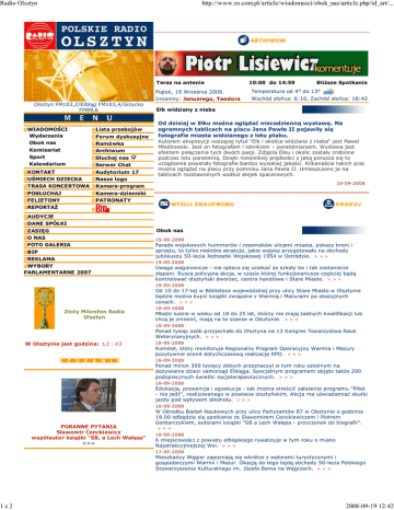 Radio Olsztyn 1z2 http://www.ro.com.pl/article/wiadomosci/obok_nas/article.php/id_art/... Teraz na antenie Olsztyn FM103,2/Elbląg FM103,4/GiŜycko FM99,6 WIADOMOŚCI Wydarzenia Obok nas Komisariat Sport Kalendarium Lista przebojów Forum dyskusyjne Ramówka Archiwum Słuchaj nas Serwer Chat KONTAKT UŚMIECH DZIECKA Audytorium 17 Nasze logo TRASA KONCERTOWA POSŁUCHAJ Kamera-program Kamera-dzienniki FELIETONY REPORTAś PATRONATY 10:00 do 14:59 BliŜsze Spotkania Piątek, 19 Września 2008. Temperatura od 4° do 13° Imieniny: Januarego, Teodora Wschód słońca: 6:16, Zachód słońca: 18:42 Ełk widziany z nieba Od dzisiaj w Ełku moŜna oglądać niecodzienną wystawę. Na ogromnych tablicach na placu Jana Pawła II pojawiły się fotografie miasta widzianego z lotu ptaku. Autorem ekspozycji noszącej tytuł "Ełk i okolice widziane z nieba" jest Paweł Młodkowski. Jest on fotografem i lotnikiem – paralotniarzem. Wystawa jest efektem połączenia tych dwóch pasji. Zdjęcia Ełku i okolic zostały zrobione podczas lotu paralotnią. Dzięki niewielkiej prędkości z jaką porusza się to urządzenie powstały fotografie bardzo wysokiej jakości. Kilkanaście takich prac moŜna oglądać na placu przy pomniku Jana Pawła II. Umieszczono je na tablicach rozstawionych wzdłuŜ alejek spacerowych. 10-09-2008 AUDYCJE DANE SPÓŁKI ZASIĘG O NAS FOTO GALERIA BIP REKLAMA WYBORY PARLAMENTARNE 2007 Obok nas 19-09-2008 Parada wojskowych hummerów i rosomaków ulicami miasta, pokazy broni i sprzętu, to tylko niektóre atrakcje, jakie wojsko przygotowało na obchody jubileuszu 50-lecia Jednostki Wojskowej 1954 w Ostródzie. > > > 19-09-2008 Uwaga wagarowicze - nie opłaca się uciekać ze szkoły bo i tak zostaniecie złapani. Rusza policyjna akcja, w czasie której funkcjonariusze częściej będą kontrolować olsztyński dworzec, centra handlowe i Stare Miasto. > > > 19-09-2008 Od 10 do 17-tej w Bibliotece wojewódzkiej przy ulicy Stare Miasto w Olsztynie będzie moŜna kupić ksiąŜki związane z Warmią i Mazurami po okazyjnych cenach. > > > Złoty Mikrofon Radia Olsztyn 18-09-2008 Młodzi ludzie w wieku od 18 do 25 lat, którzy nie mają Ŝadnych kwalifikacji lub chcą je zmienić, mają na to szanse w Olsztynie. > > > 18-09-2008 Ponad tysiąc osób przyjechało do Olsztyna na 13 Kongres Towarzystwa Nauk Weterynaryjnych. > > > W Olsztynie jest godzina: 18-09-2008 Komitet, który monitoruje Regionalny Program Operacyjny Warmia i Mazury pozytywnie ocenił dotychczasową realizację RPO. > > > 18-09-2008 Ponad milion 300 tysięcy złotych przeznaczył w tym roku szkolnym na doŜywianie dzieci samorząd Elbląga. Specjalnym programem objęto takŜe 200 podopiecznych świetlic socjoterapeutycznych. > > > 18-09-2008 Edukacja, prewencja i egzekucja - tak moŜna streścić załoŜenia programu "Piłeś - nie jedź", realizowanego w powiecie olsztyńskim. Akcja ma uświadamiać skutki jazdy pod wpływem alkoholu. > > > 18-09-2008 PORANNE PYTANIA Sławomir Cenckiewicz współautor ksiąŜki "SB, a Lech Wałęsa" >>> W Ośrodku Badań Naukowych przy ulicy Partyzantów 87 w Olsztynie o godzinie 18.00 odbędzie się spotkanie ze Sławomirem Cenckiewiczem i Piotrem Gontarczykiem, autorami ksiąŜki "SB a Lech Wałęsa - przyczynek do biografii". >>> 18-09-2008 6 miejscowości z powiatu elbląskiego rywalizuje w tym roku o miano Najatrakcyjniejszej Wsi. > > > 17-09-2008 Mieszkańcy Węgier zapoznają się wkrótce z walorami turystycznymi i gospodarczymi Warmii i Mazur. Okazją do tego będą obchody 50-lecia Polskiego Stowarzyszenia Kulturalnego im. Józefa Bema na Węgrzech. > > > 2008-09-19 12:42